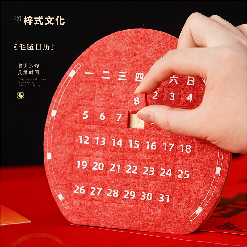 礼盒选用沉稳大气的藏青为基调,整体设计内敛而富有格;创新毛毡日历,日期方块可自由拆卸组合,仪式感满满;A6笔记本采用皮面肤感材质,搭配花梨木签字笔,;春联套装含对联、横批与福字,春风马红包传递吉;一份承载时光温度的礼物,无论赠亲友、客户都显心意