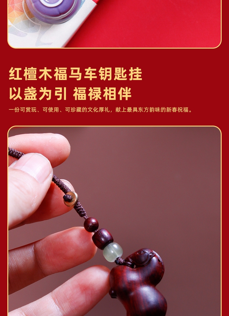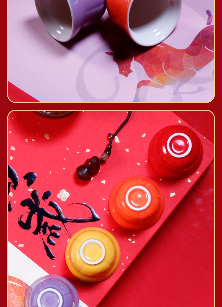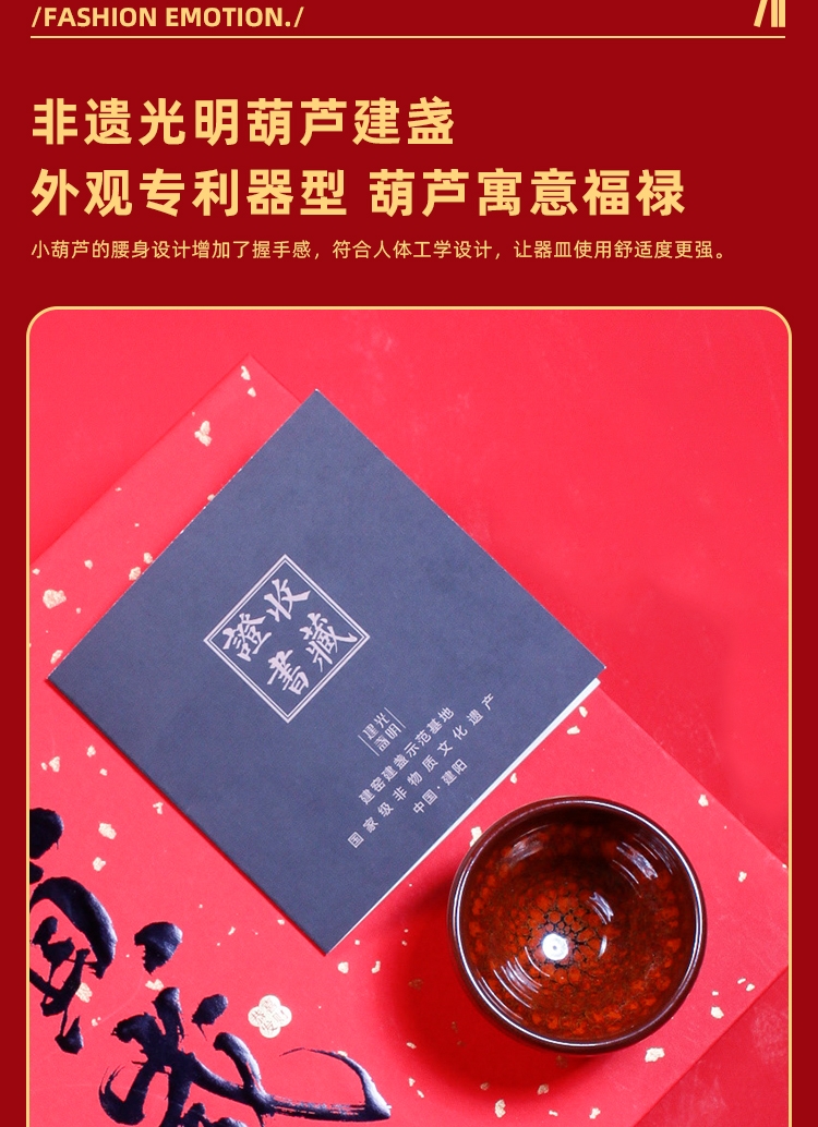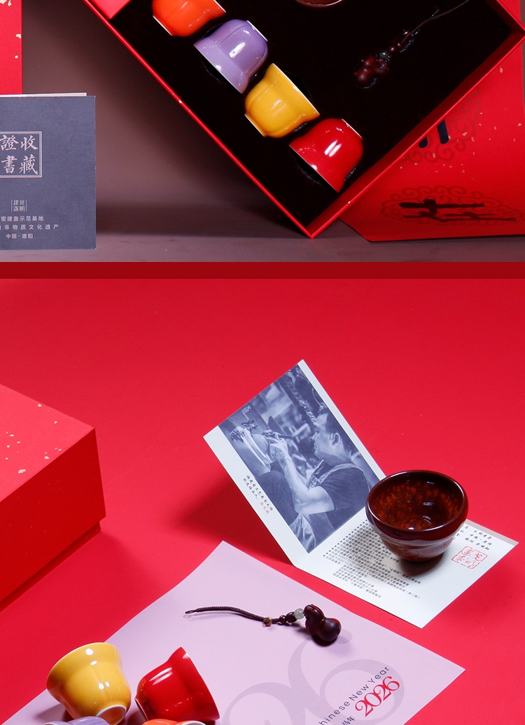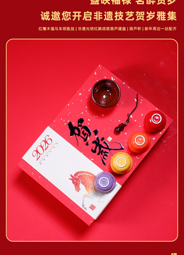 国家级非遗手作 具有收藏价值 精选红鹧鸪斑精致典雅;红木材质的福马钥匙扣 憨态可掬 寓意吉祥祝福;四只陶瓷葫芦杯 祝福满满 洒金艺术纸包装 年味十足