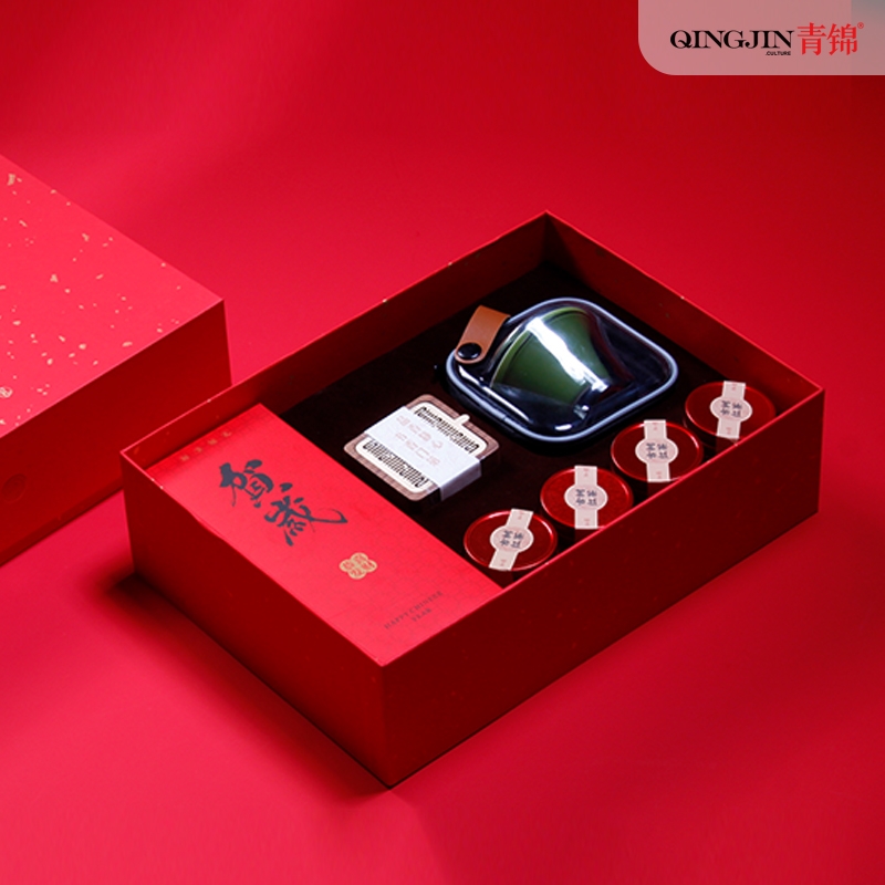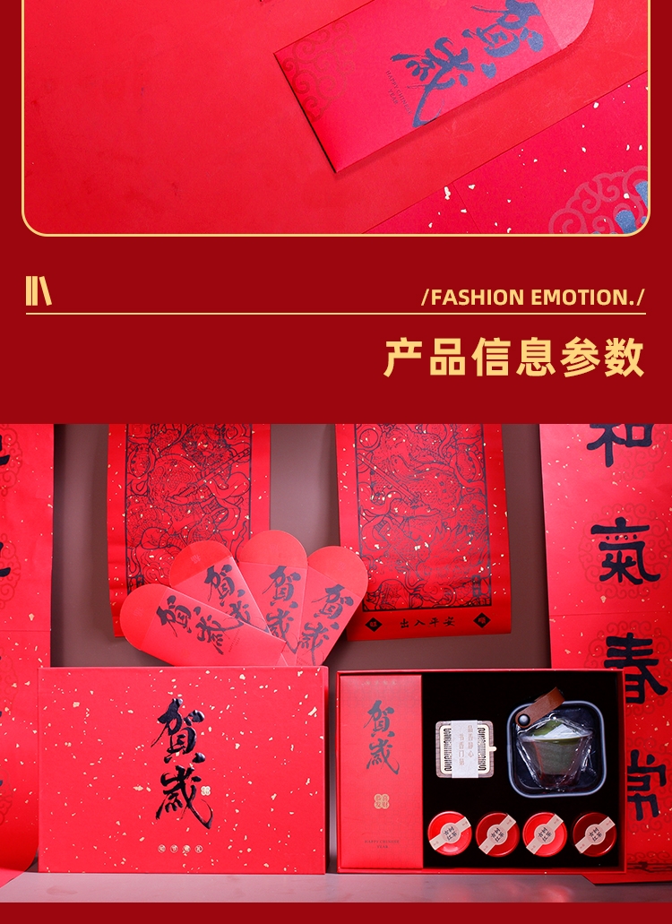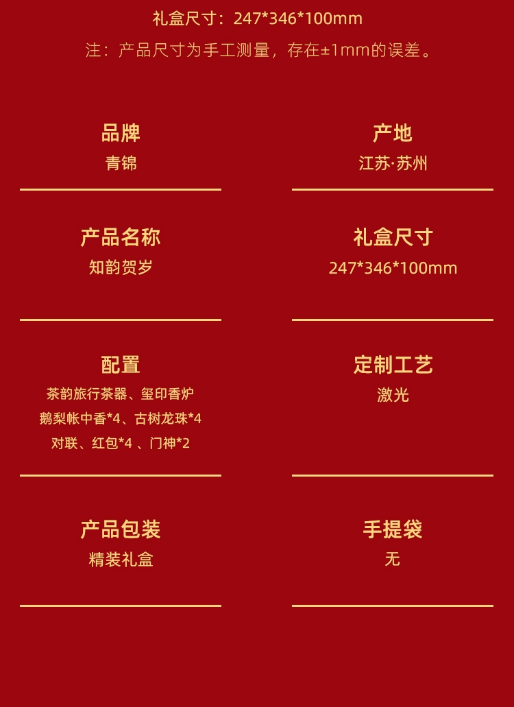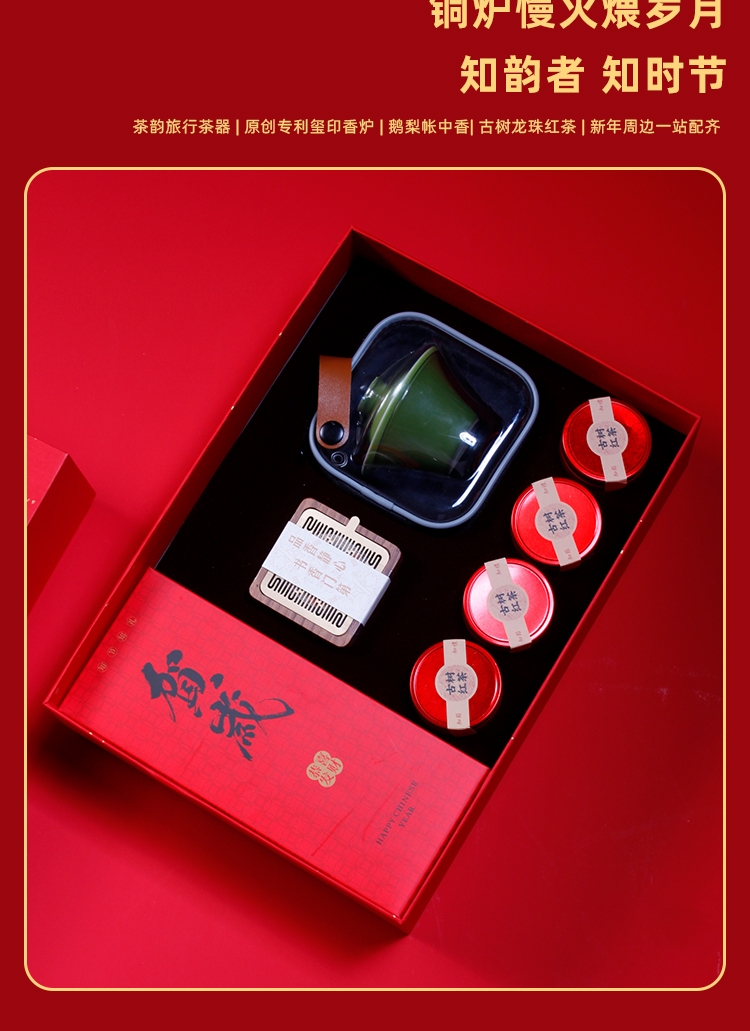 配置清单:茶韵旅行茶器*1 玺印香炉*1鹅梨帐中香*4 古树龙珠*4 对联*1-红包*4 门神*2 精装礼盒手提袋*1