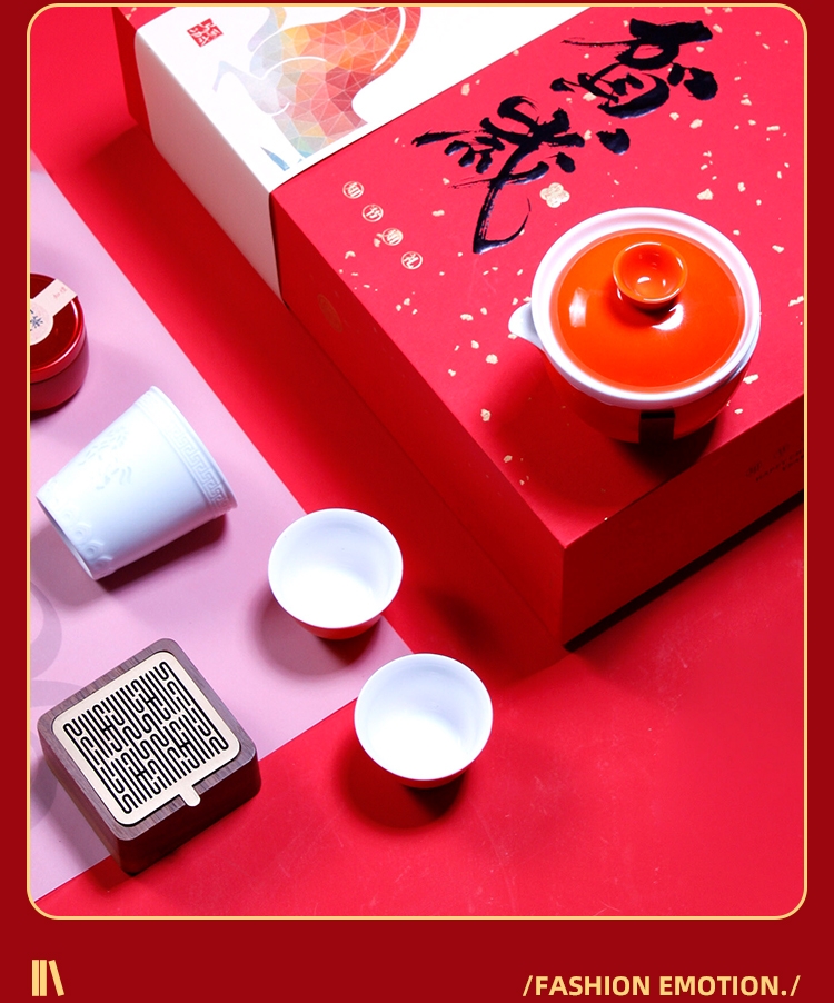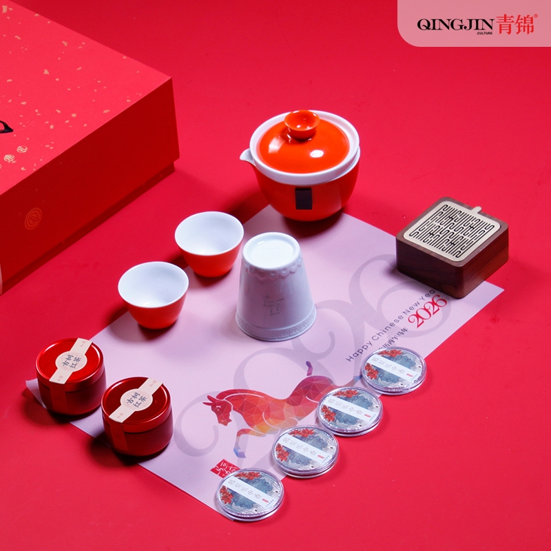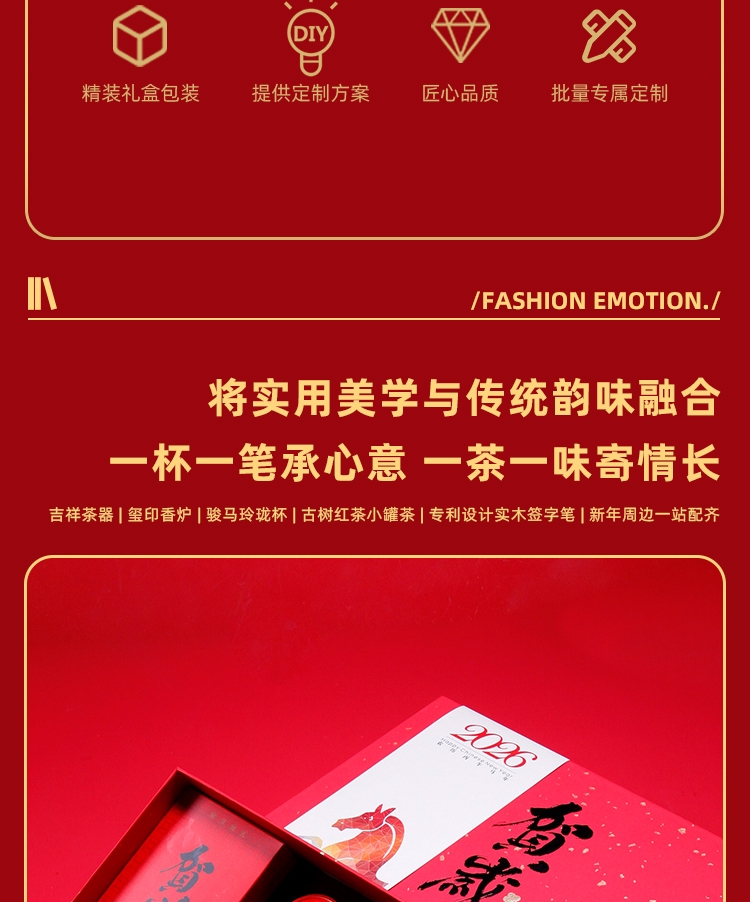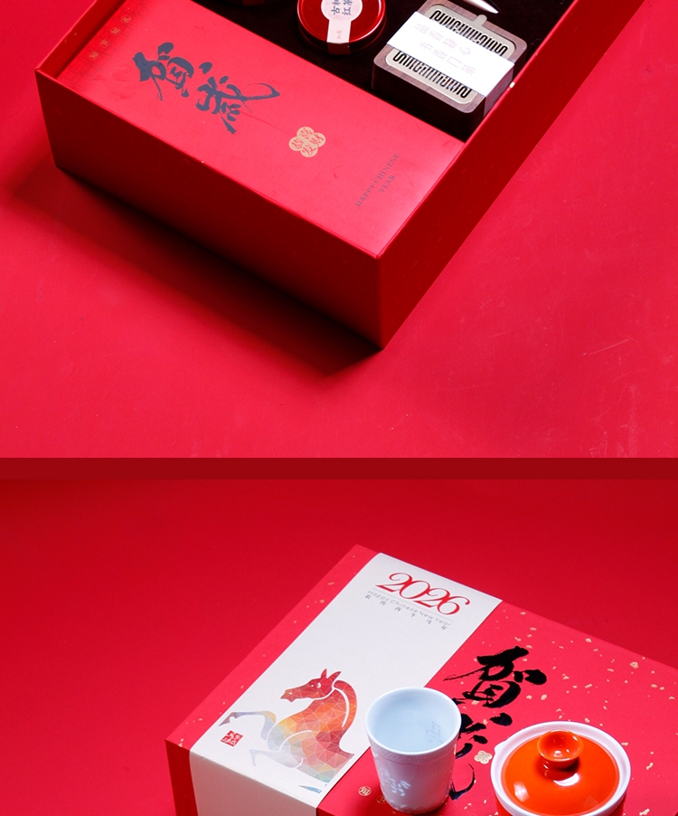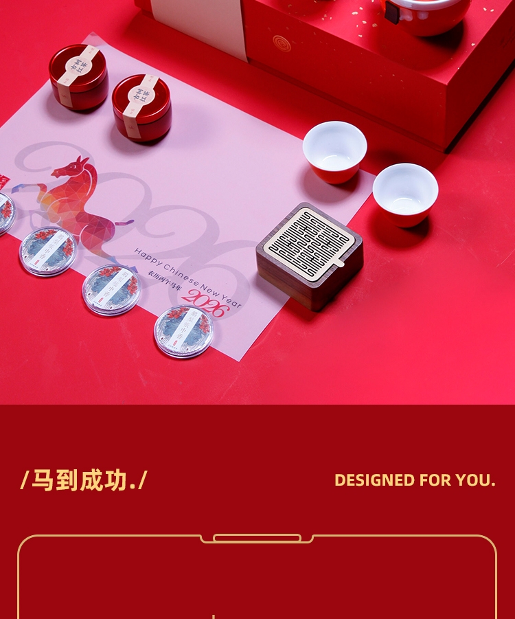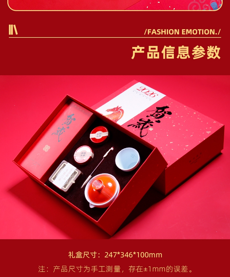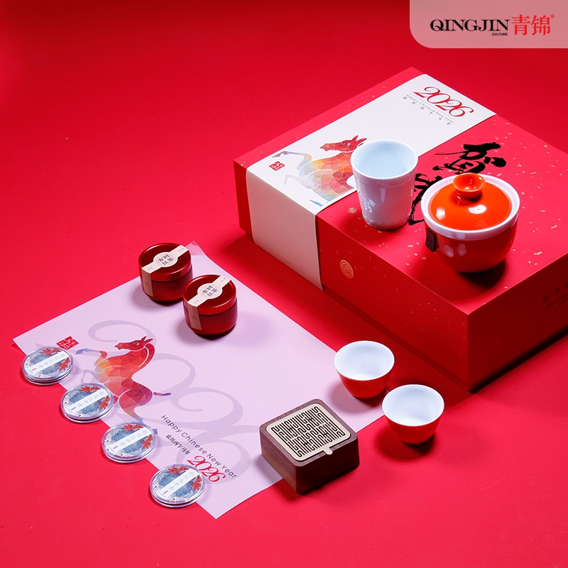 配置清单:吉祥茶器*1祥云宝珠笔*1 玺印香炉*1古树龙珠*2 骏马玲珑杯*1 对联*1-红包*4 门神*2 精装礼盒手提袋*1