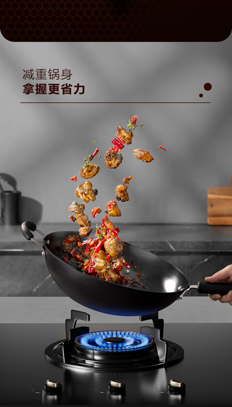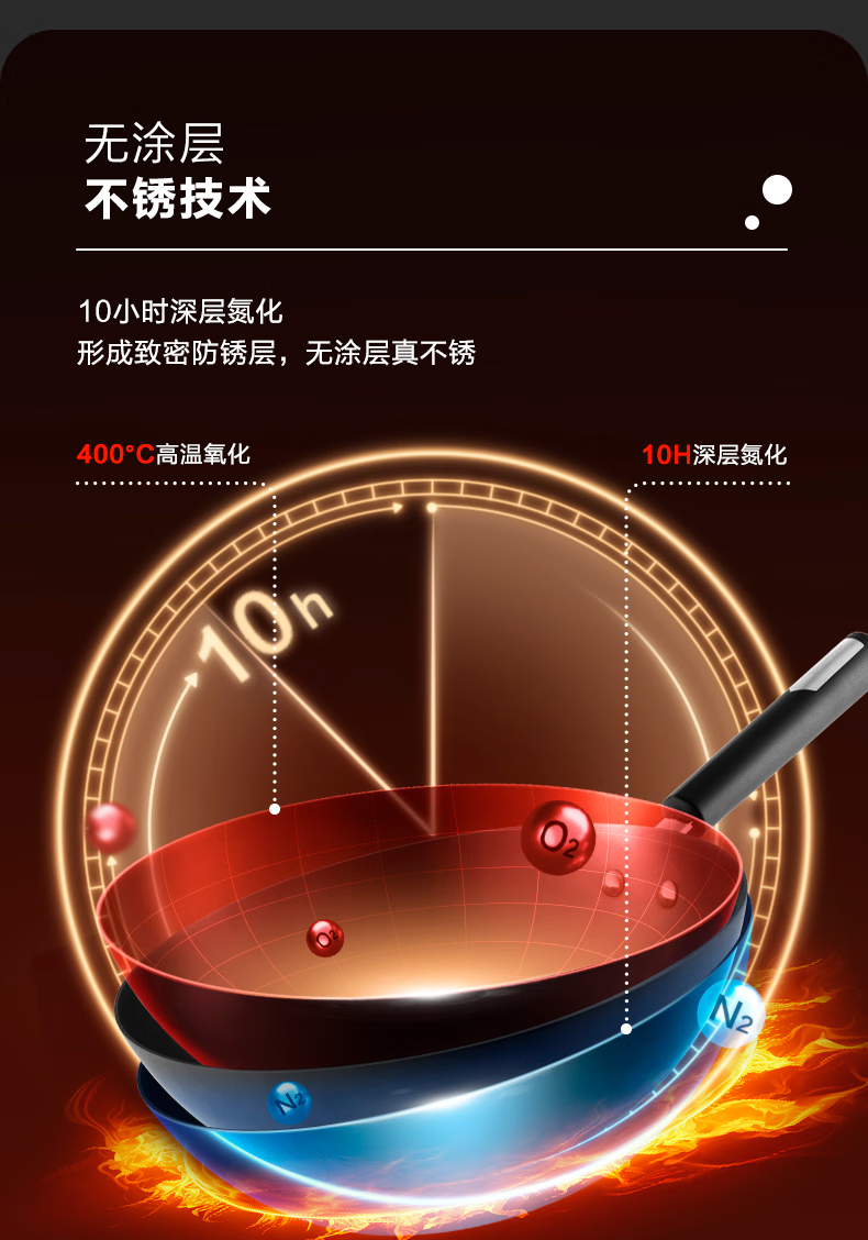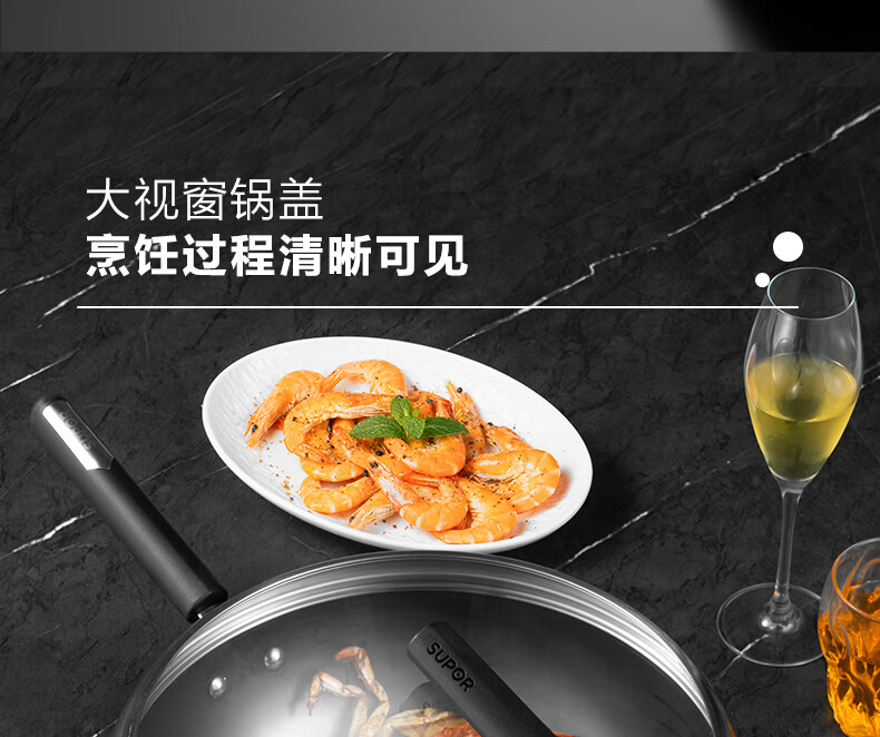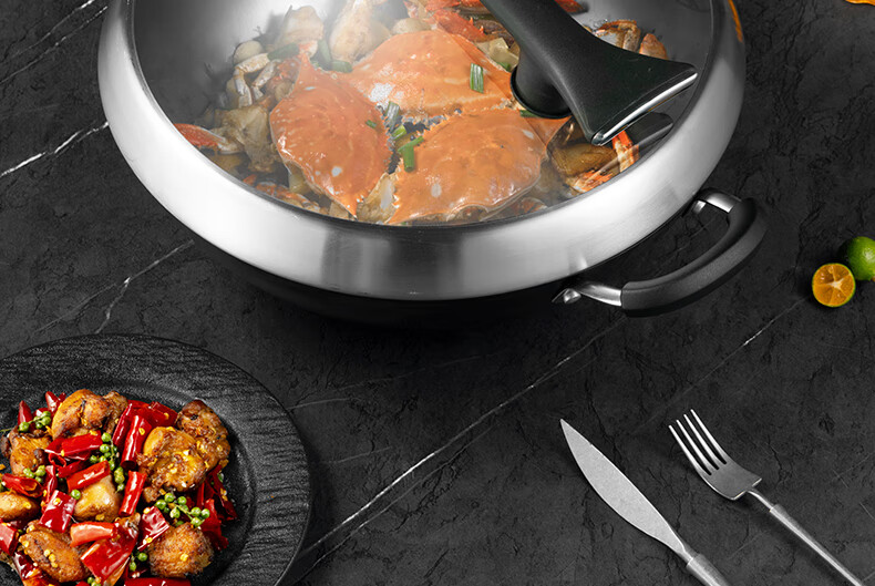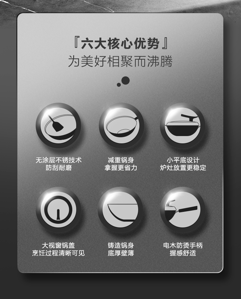 无涂层不锈技术防刮耐磨金属铲通用;底厚壁薄受热均匀,少油烟 ;立锅盖轻巧易放