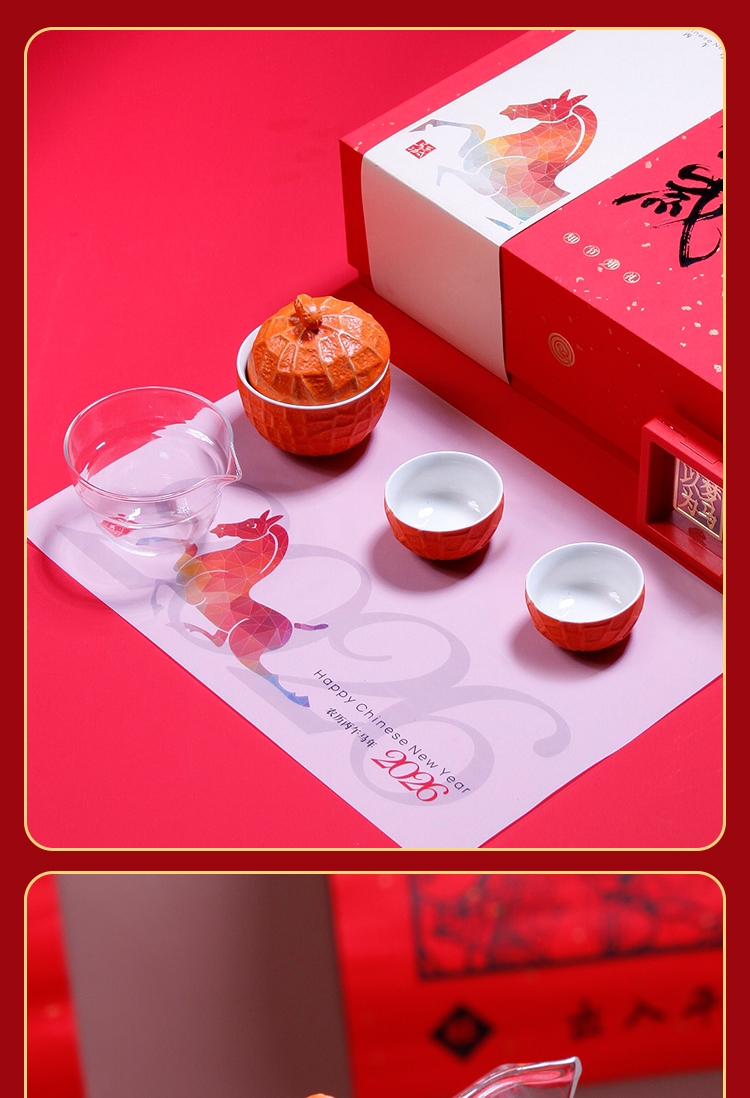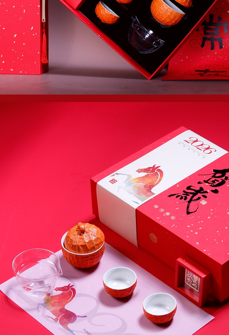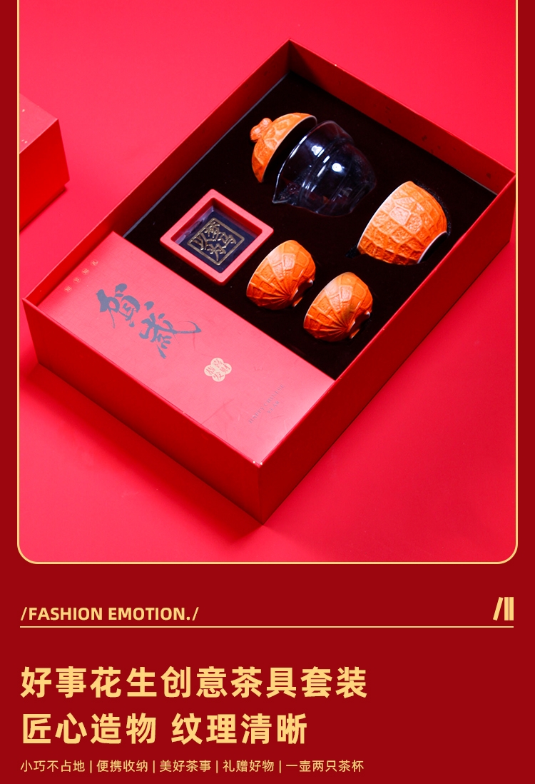 创意花生造型的茶器礼盒让礼赠更有趣味;精致礼盒加对联红包门神 宫扇让年味拉满;免费定制logo 免费出效果图一套起订快速发货