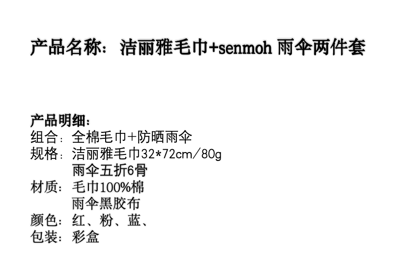 配置清单:洁丽雅纯棉毛巾*1。 6骨5折口袋伞*1