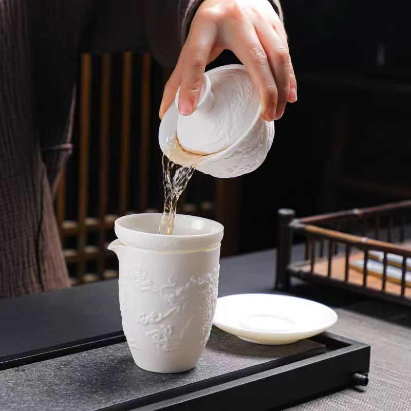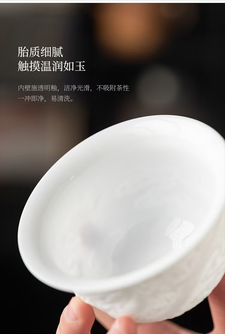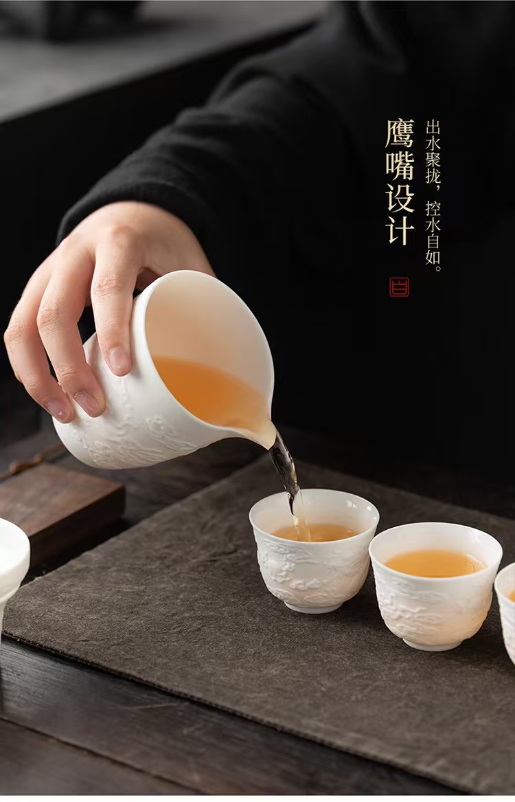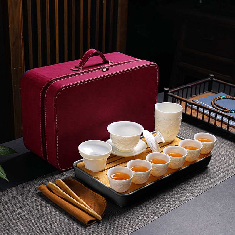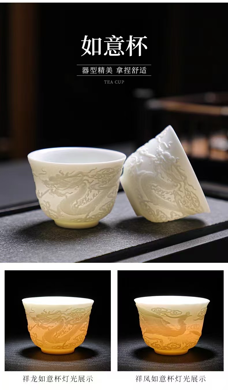 开门红喜庆色彩盛世龙腾,手工浮雕龙纹茶具,栩栩如生;高档羊脂玉瓷,瓷质细腻温润,触感舒适。似凝脂,;双层茶盘,高档锦盒装,时尚精致上档次。