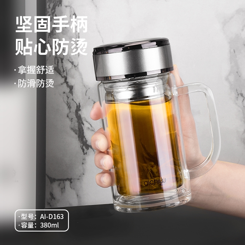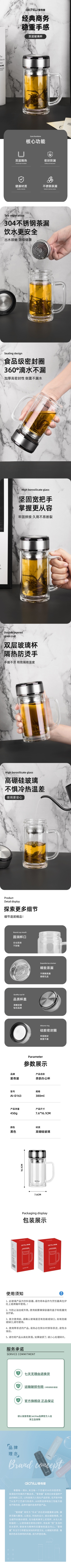 304不锈钢茶漏,有效阻隔茶渣入口;杯身采用双层高硼硅玻璃,有效隔热防烫;杯身设计秉承极简理念,商务简约,携带方便