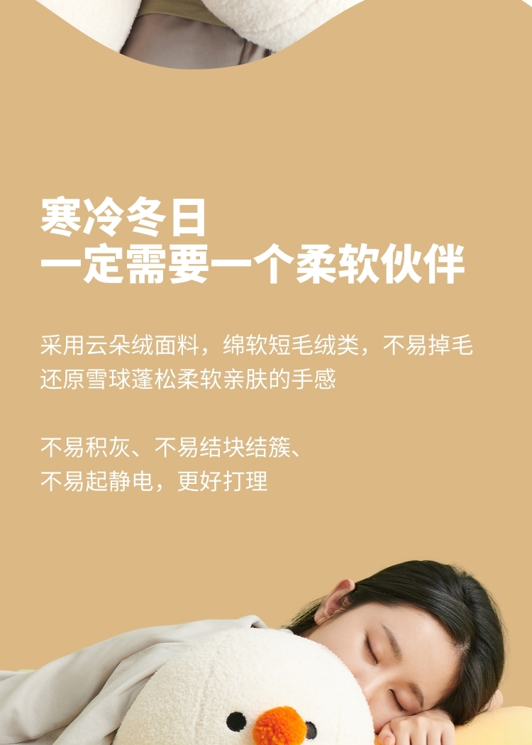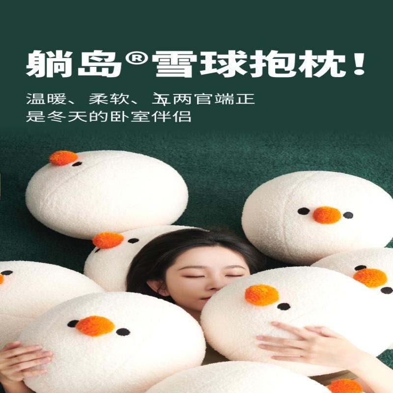 雪球抱枕采用云朵绒面料,绵软短毛绒,不易掉毛;还原雪球蓬松亲肤手感;不易积灰、起静电、好打理
