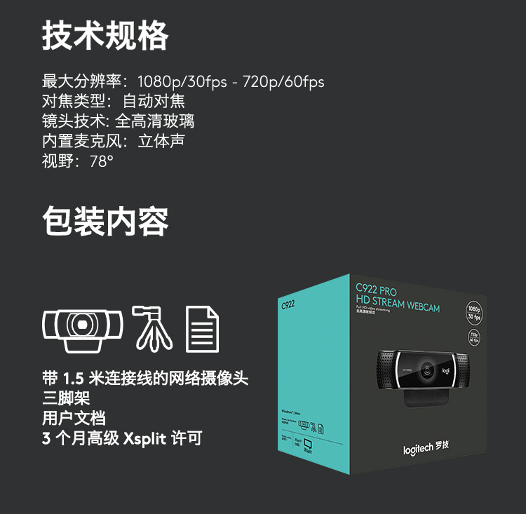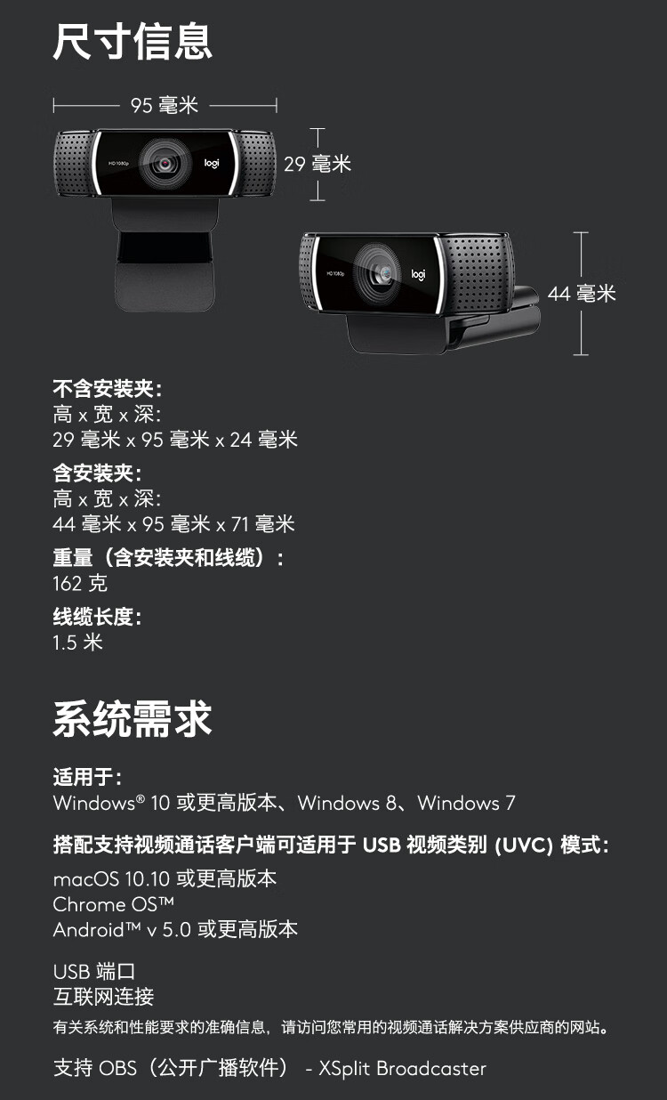 全高清分辨率1080P视频流;双麦克风立体音效;高清自动聚焦与光线矫正