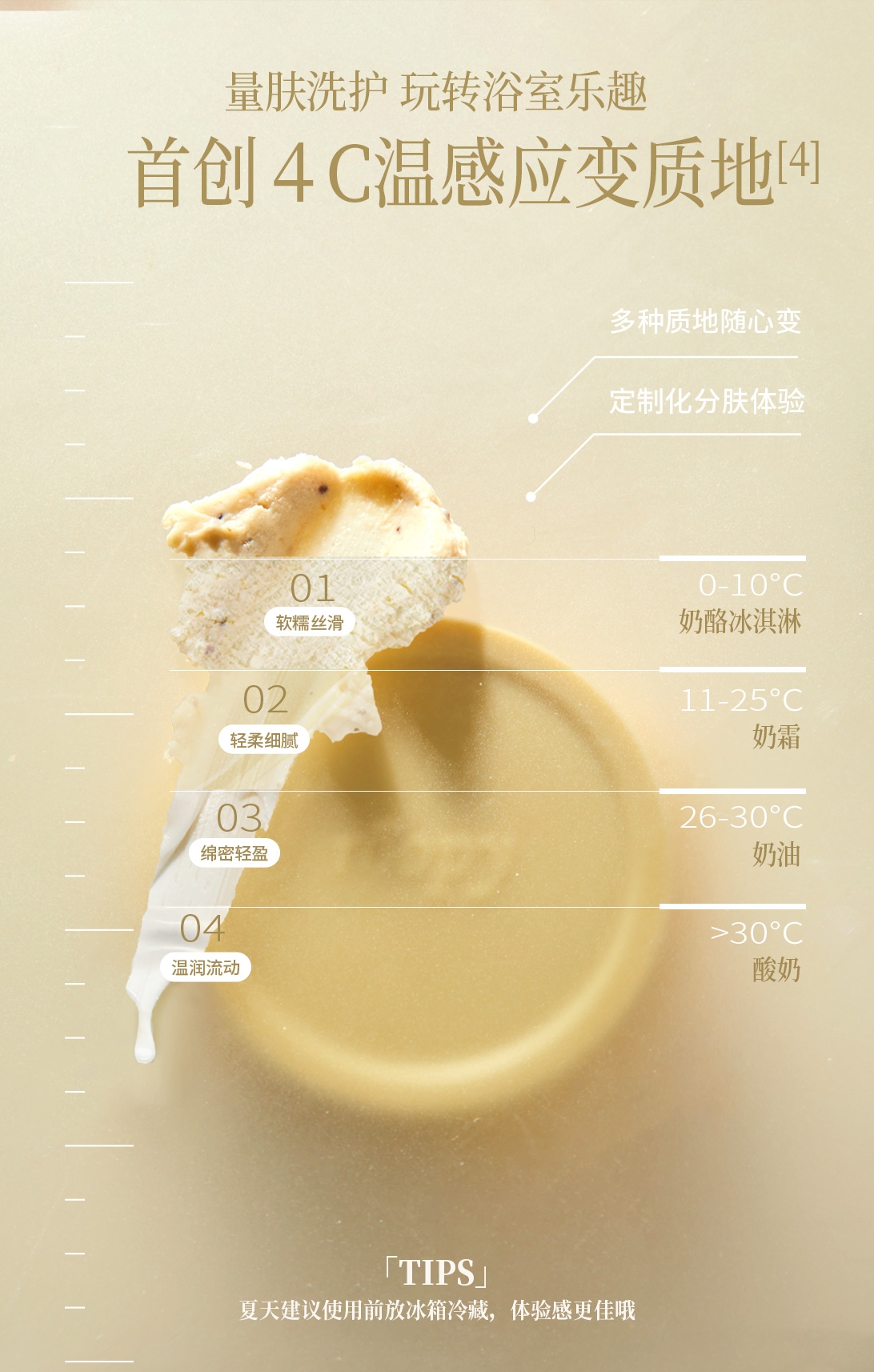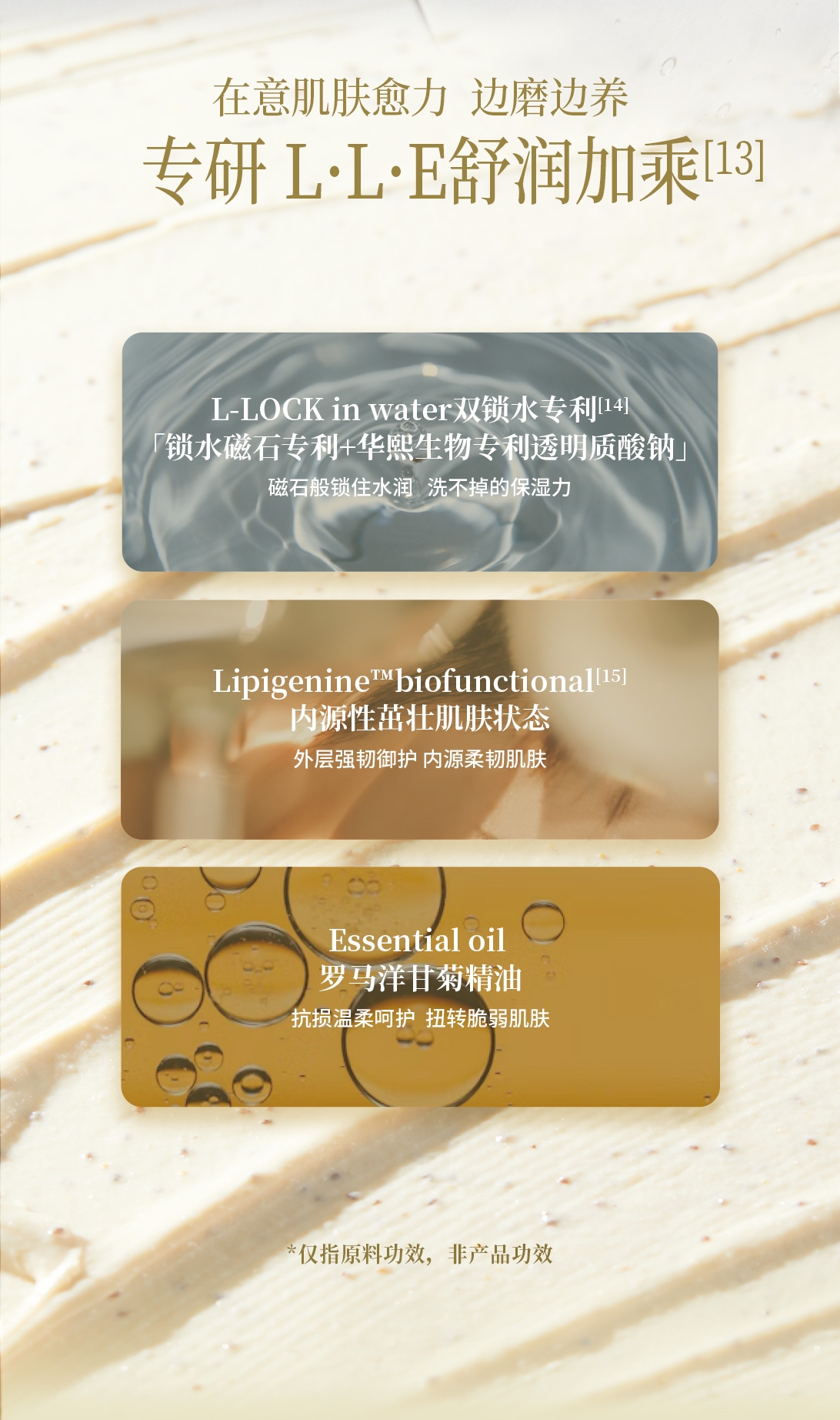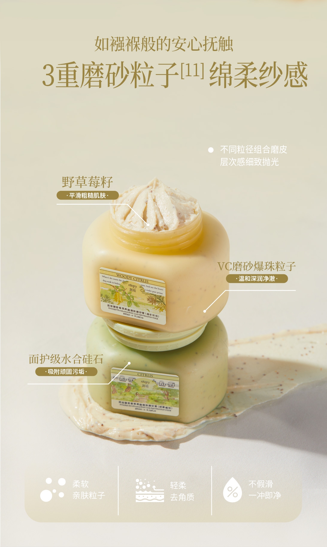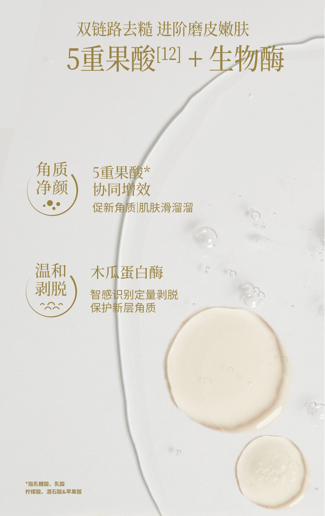 物理磨砂,带走老废角质;果酸焕颜,深澈去糙;温润舒养,智感温和剥离,边洗边养护