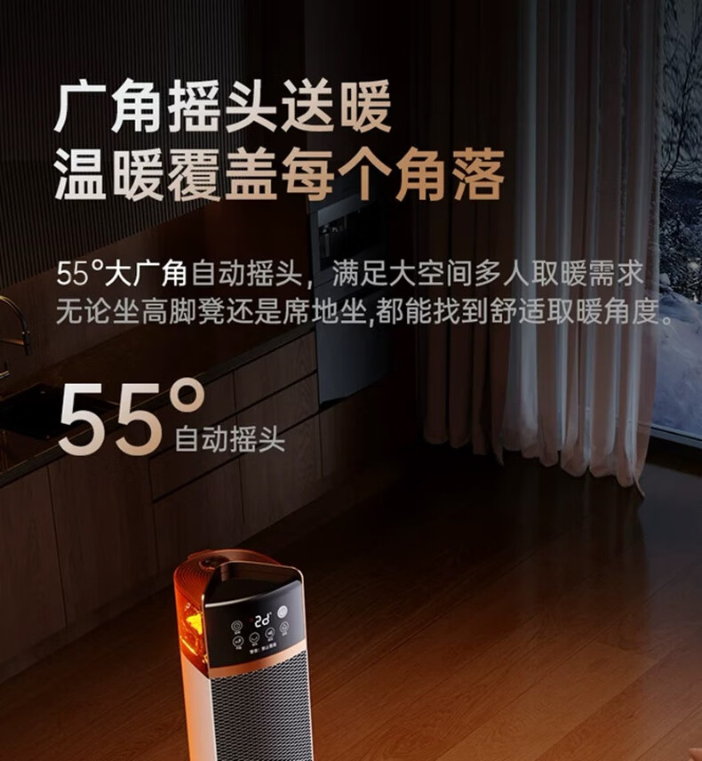 AI智能语音交互,智能芯片,一键唤醒;石墨烯PTC加热,2000W高功率,加大出风口;ECO加智能恒温,更省电,加12H定时