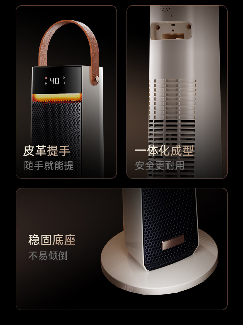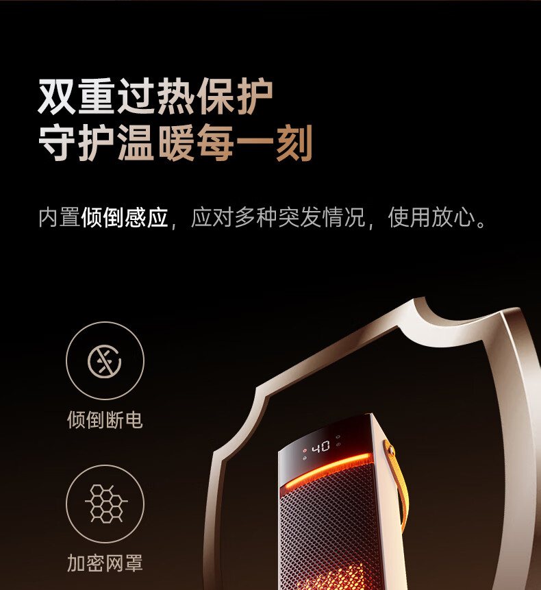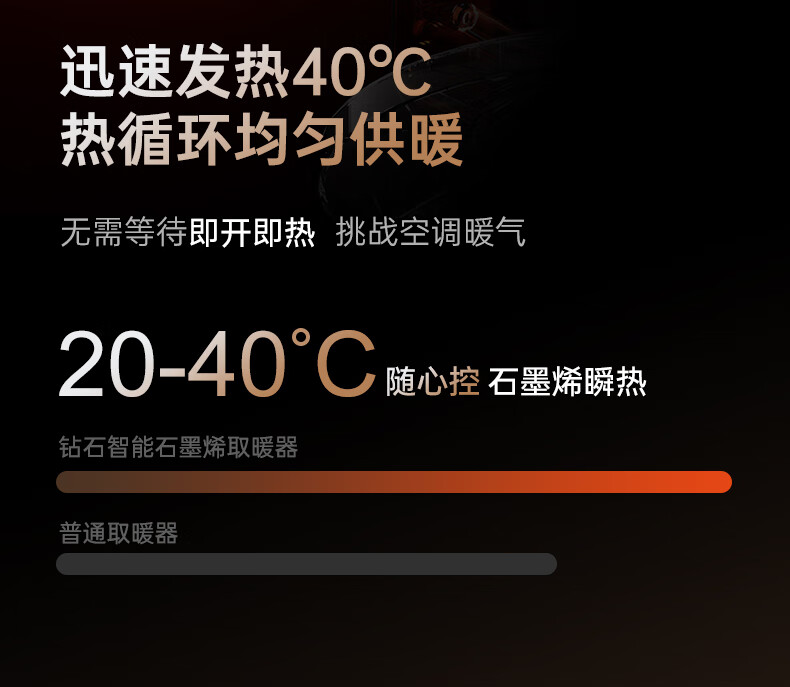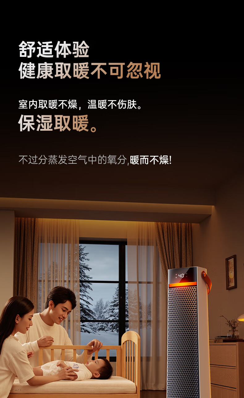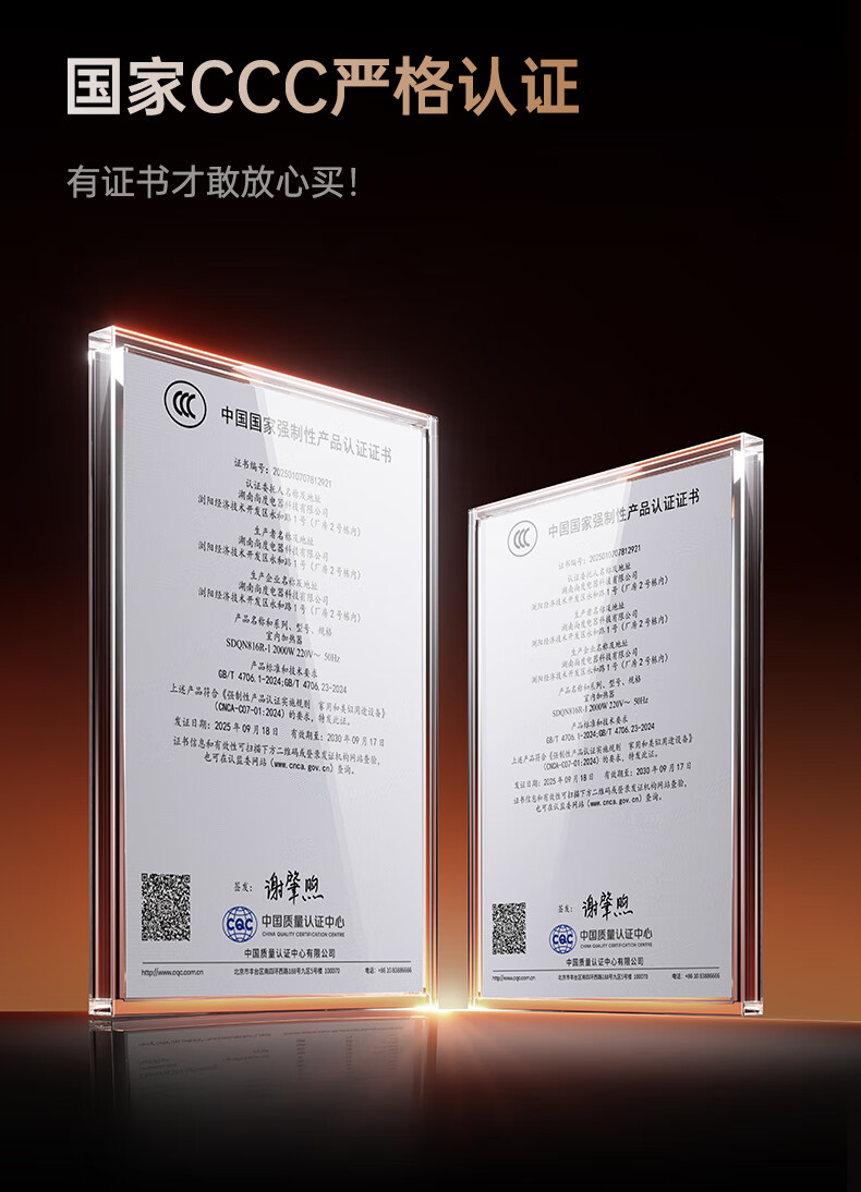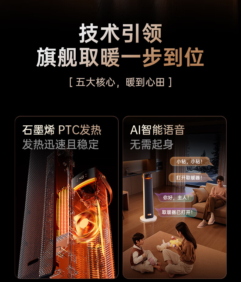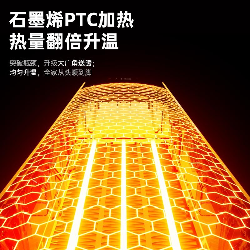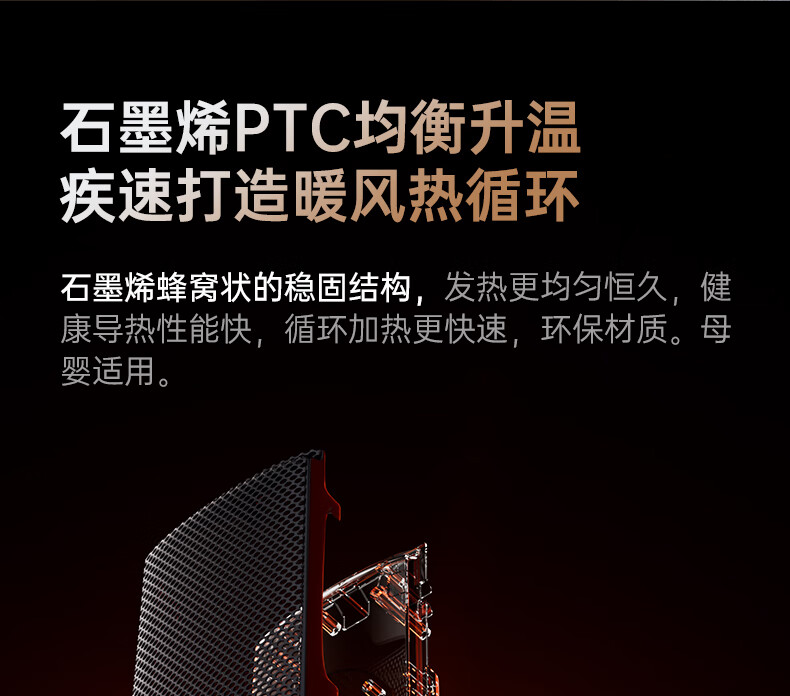 石墨烯PTC加热,2000W高功率加大出风口;加大出风口,热量翻倍温暖,适应各种环境;冬天取暖安全第一,3C认证保障母婴适用