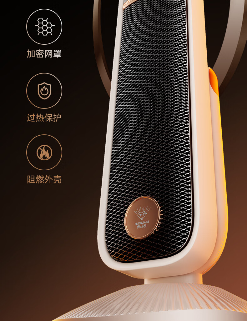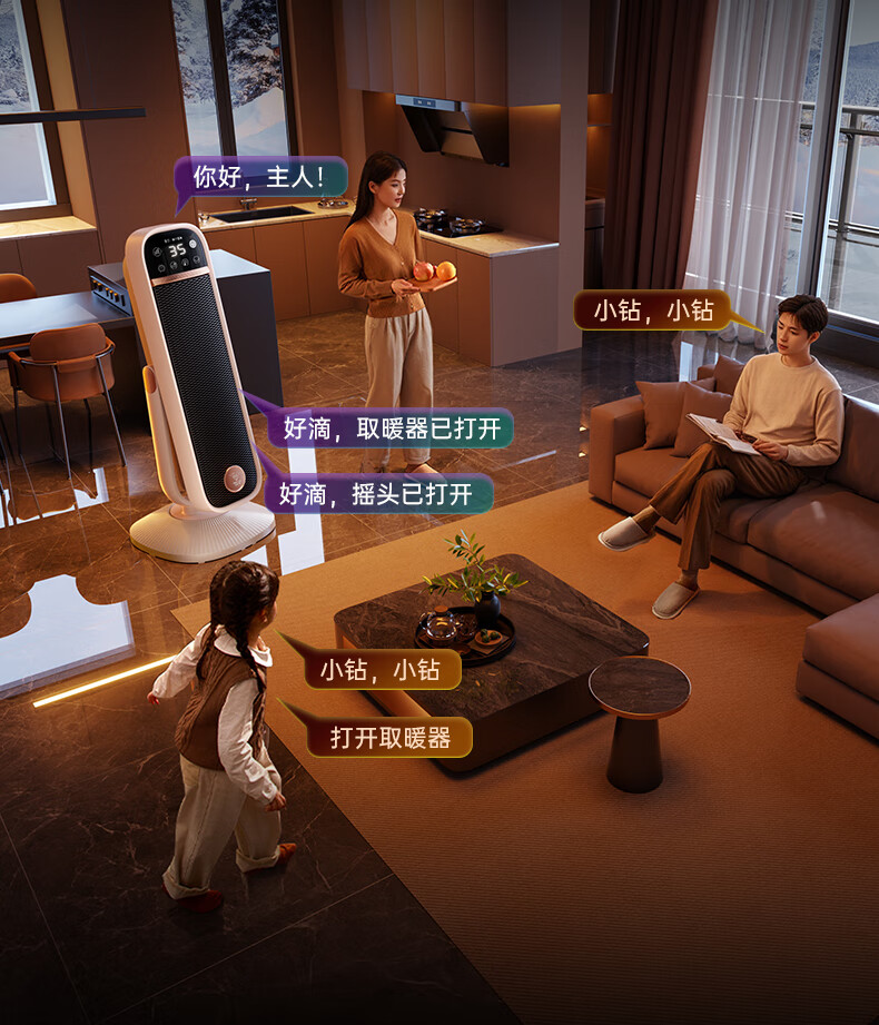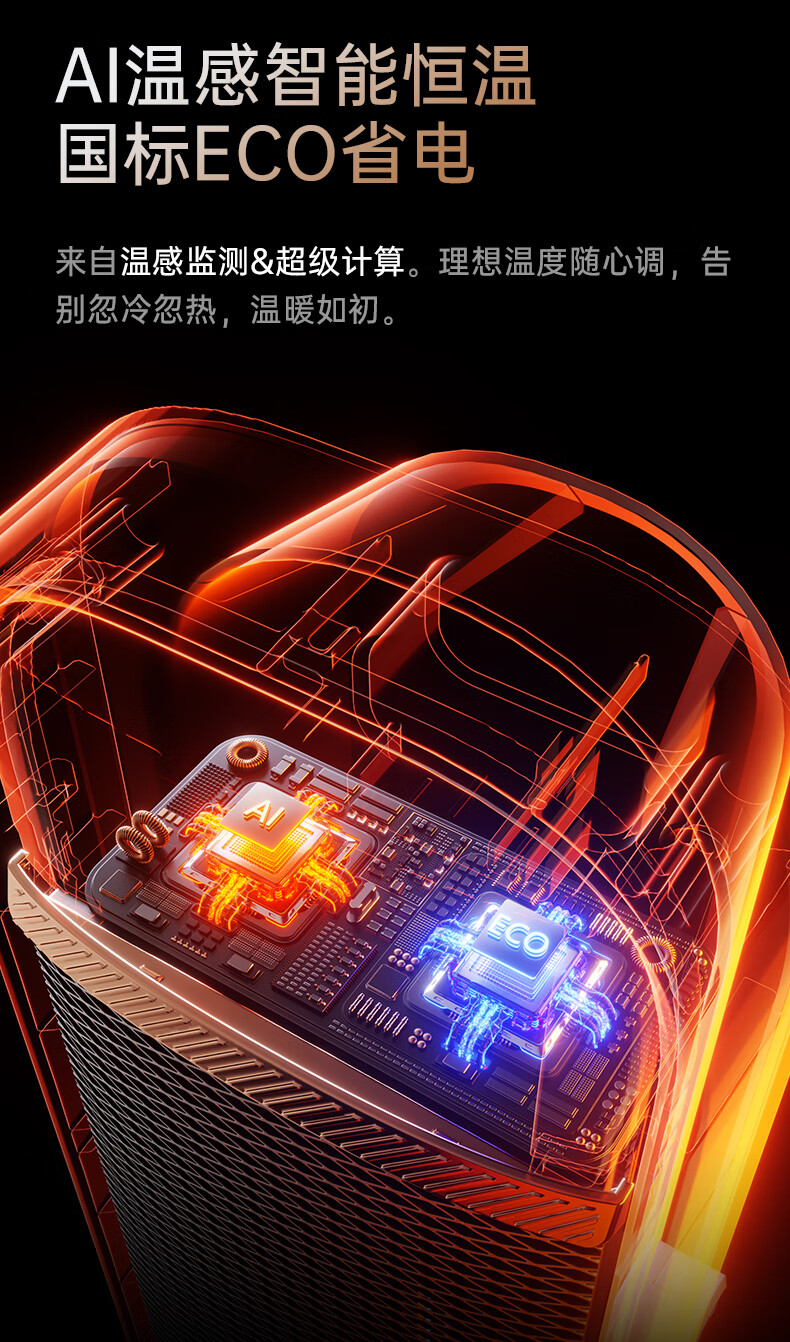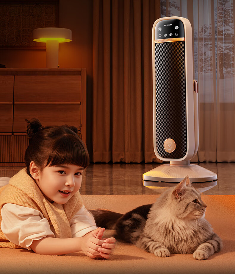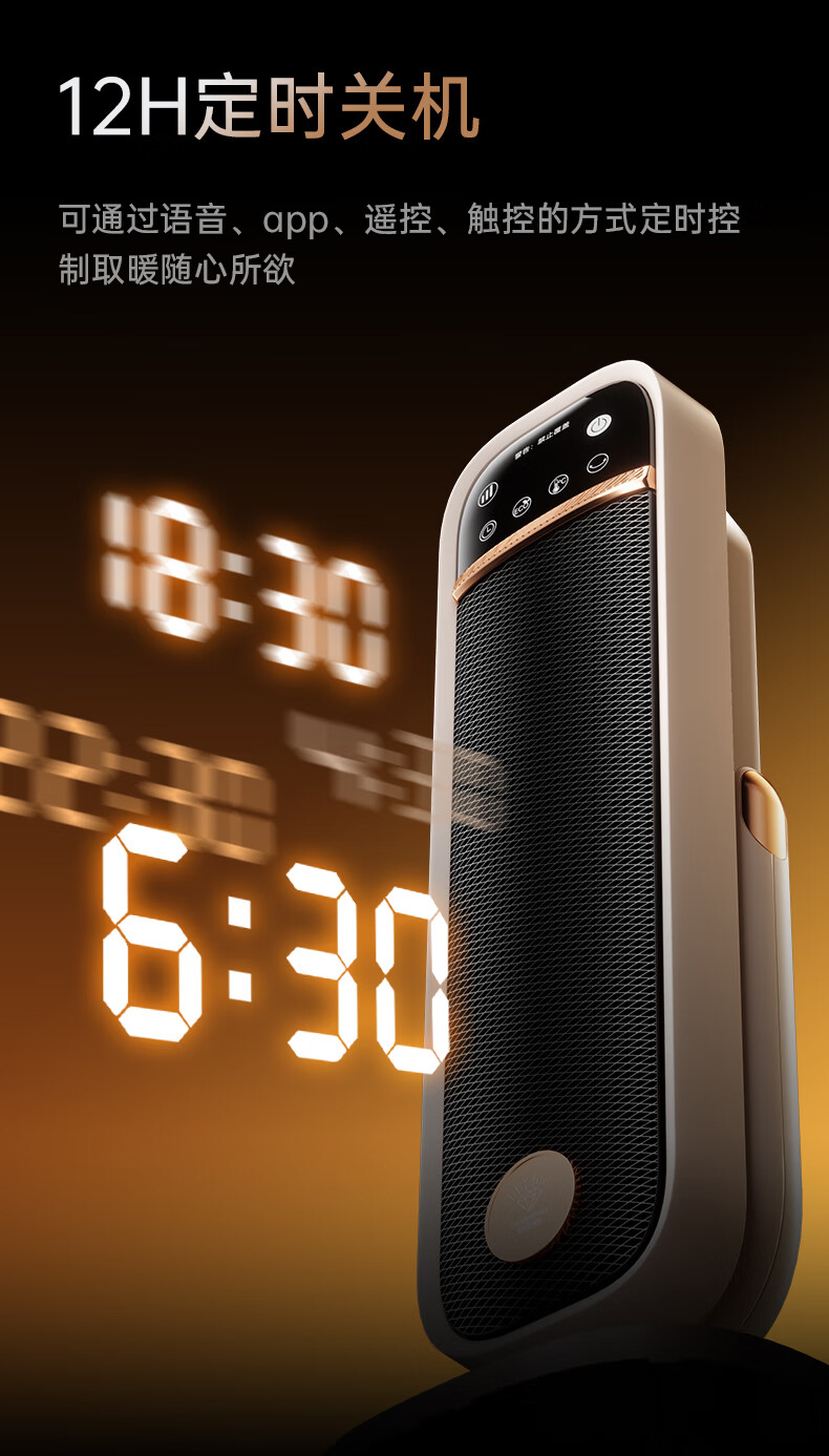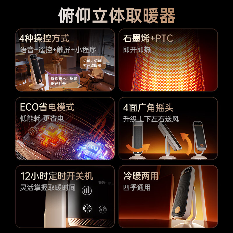 AI智能语音交互,智能芯片,一键唤醒;石墨烯PTC加热,2000W高功率;加大出风口,热量翻倍温暖,适应各种环境;下潜结构摇头机构,左右广角送暖,左右自动摇头;冬天取暖安全第一,3C认证保障母婴适用