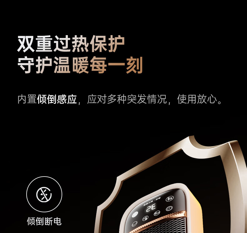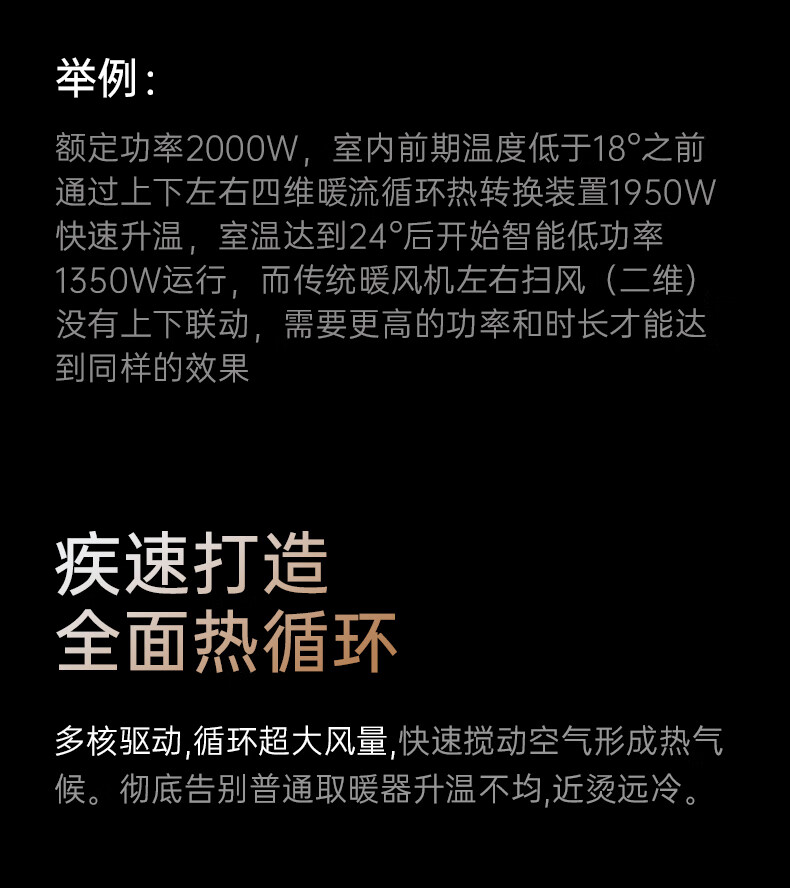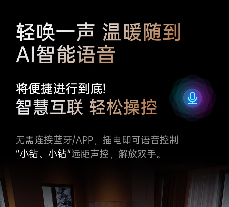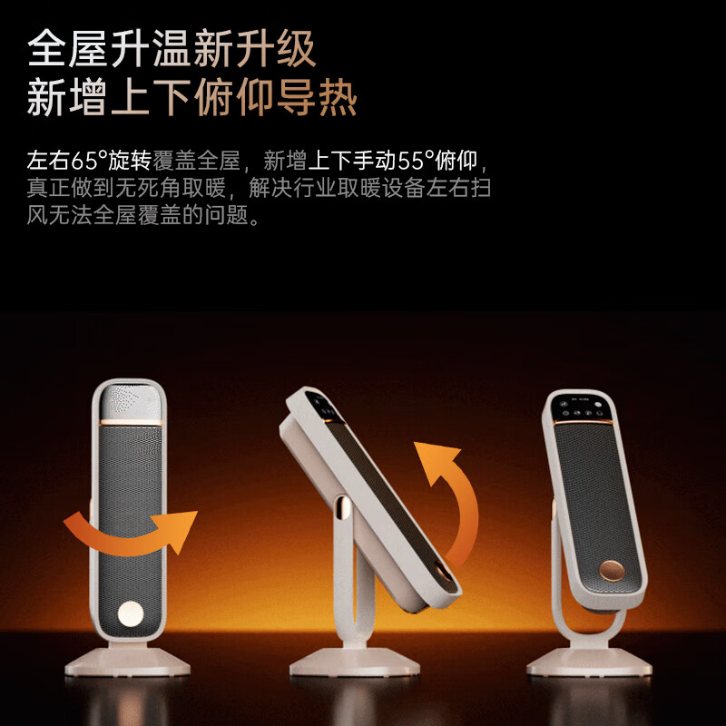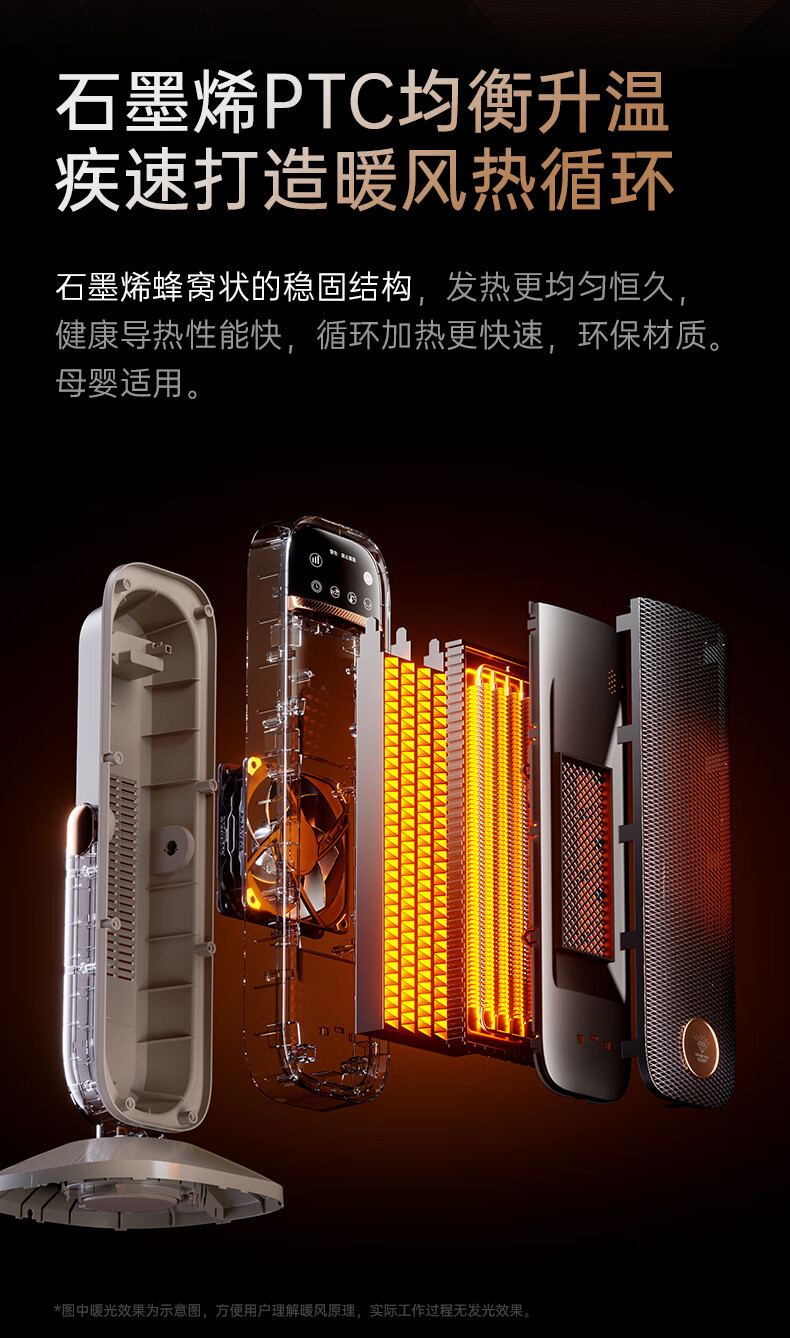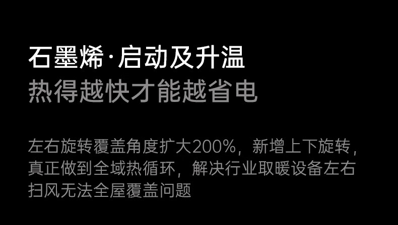 AI智能语音交互,智能芯片,一键唤醒;石墨烯PTC加热,2000W高功率;加大出风口,热量翻倍温暖,适应各种环境;下潜结构摇头机构,左右广角送暖,左右自动摇头;冬天取暖安全第一,3C认证保障母婴适用