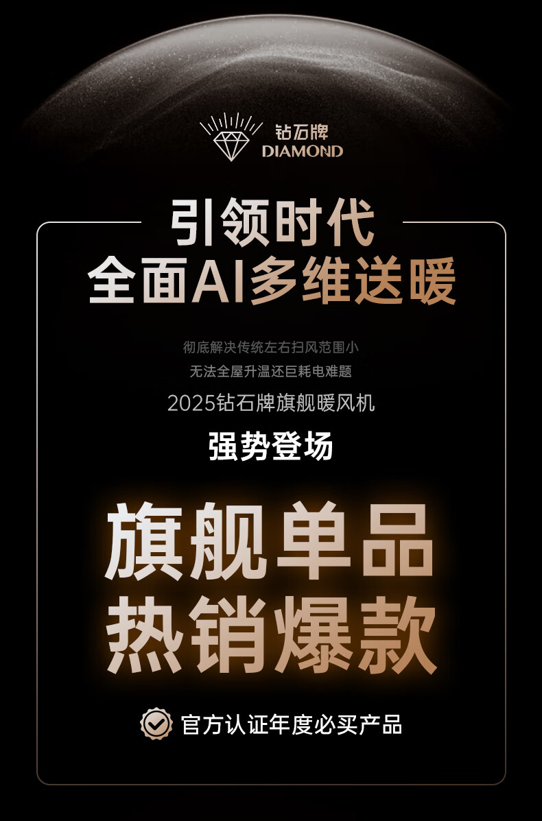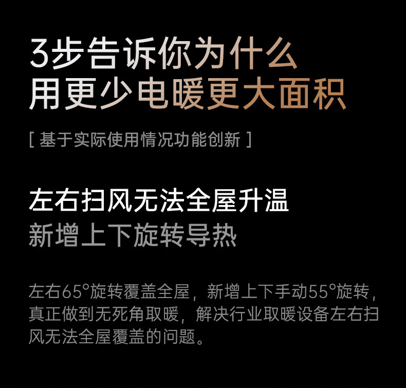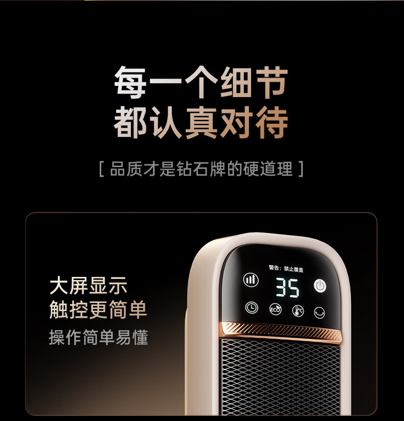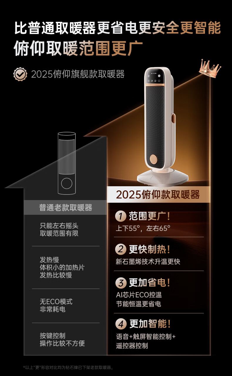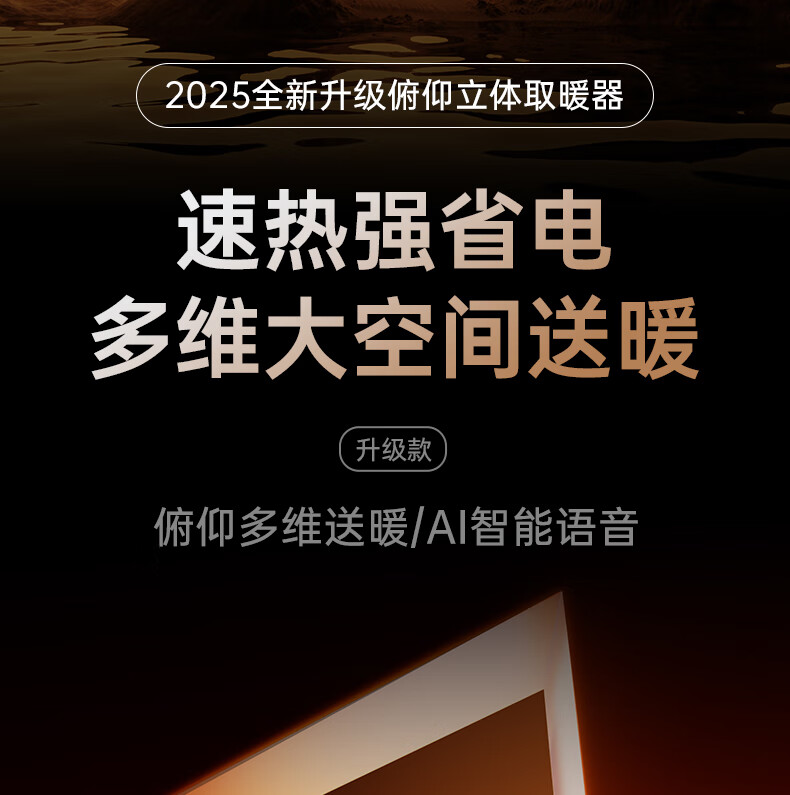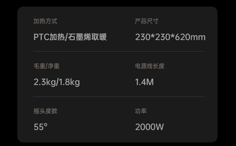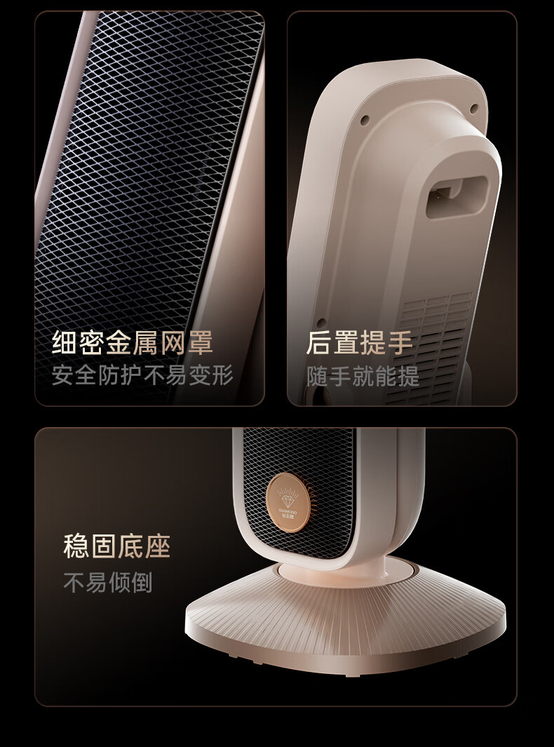 AI智能语音交互,智能芯片,一键唤醒;石墨烯PTC加热,2000W高功率;加大出风口,热量翻倍温暖,适应各种环境;下潜结构摇头机构,左右广角送暖,左右自动摇头;冬天取暖安全第一,3C认证保障母婴适用