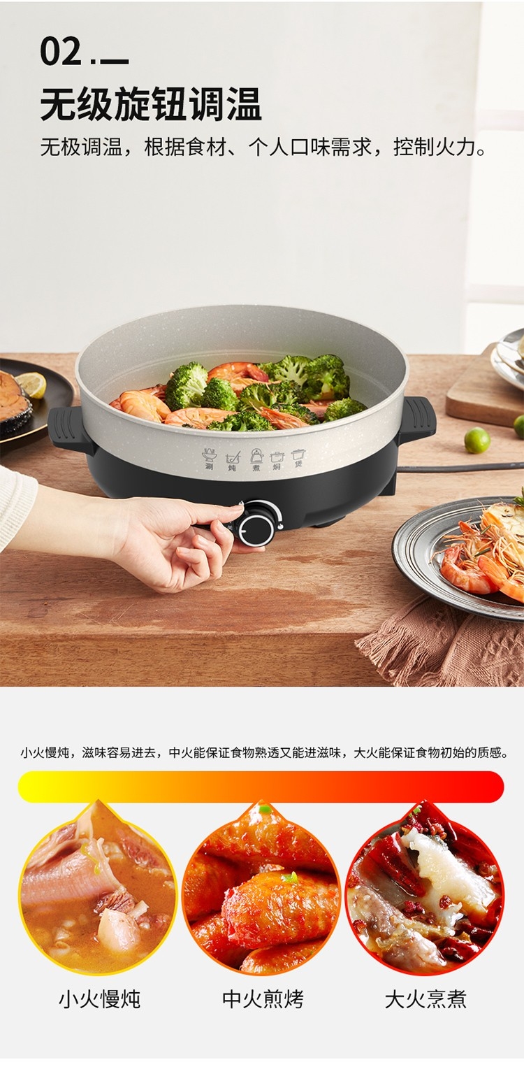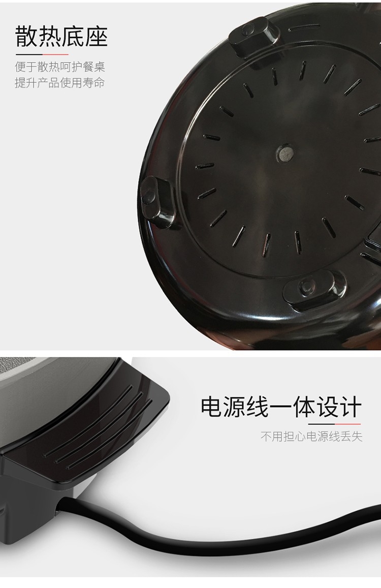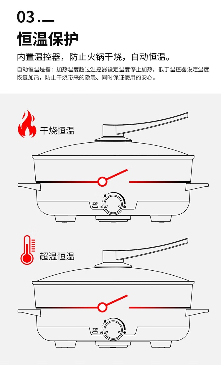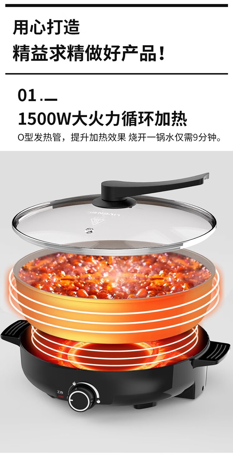 1500W大火力循环加热;无级旋钮调温;内置温控器,防止火锅干烧,自动恒温。;食品健康不粘涂层;不粘涂层,用水一冲,轻轻一擦,去除油污