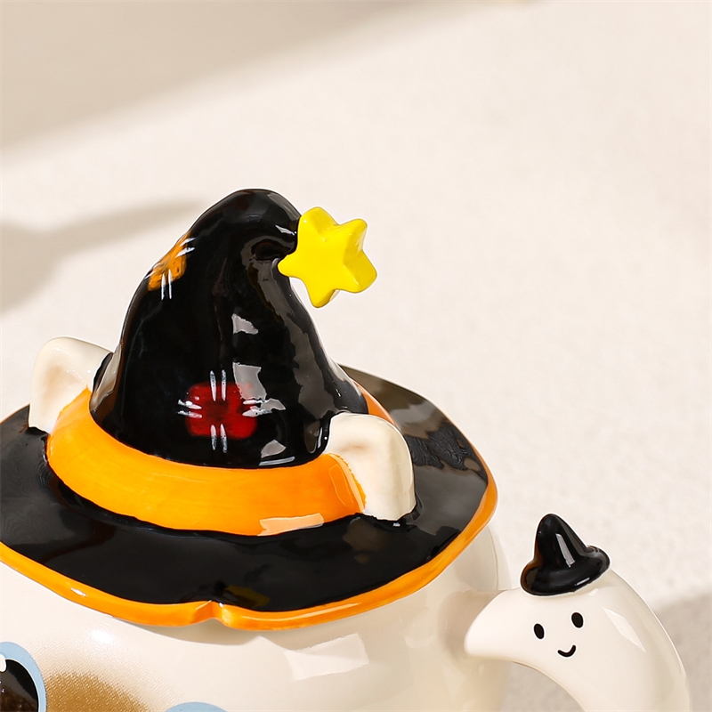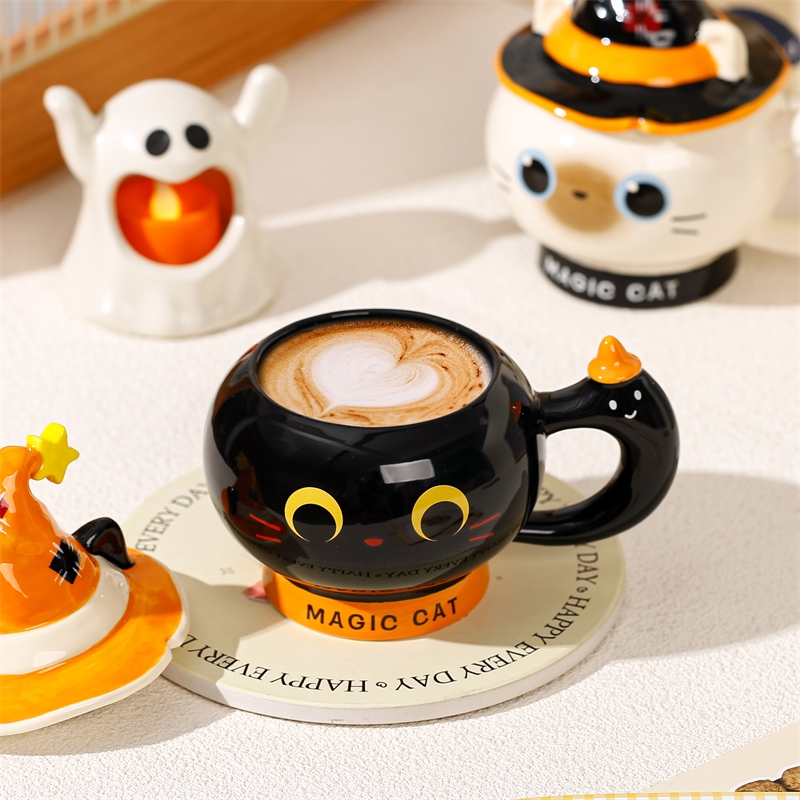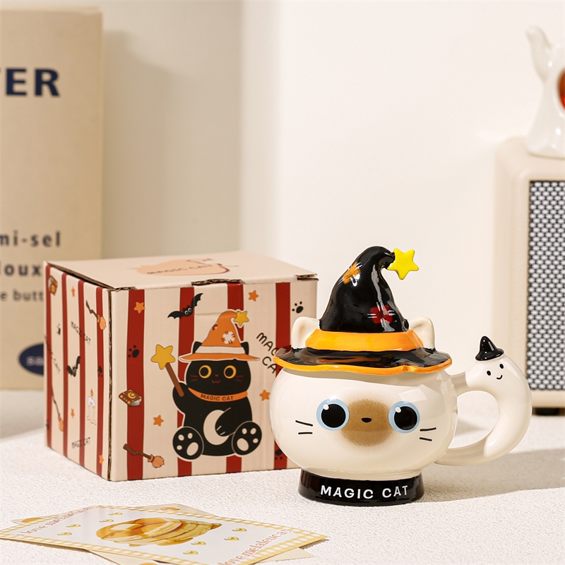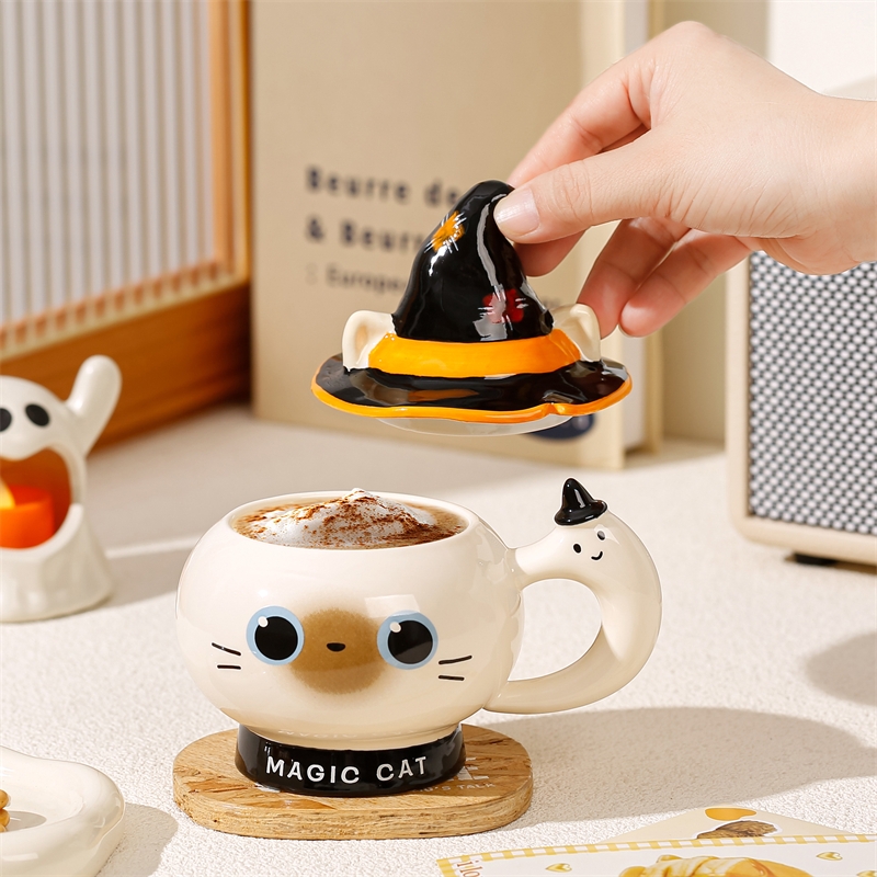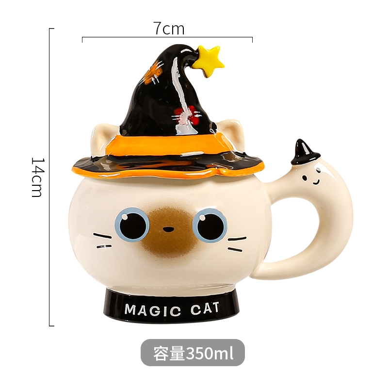 魔法猫咪造型杯;高温烧制,手绘+贴花工艺;含盖