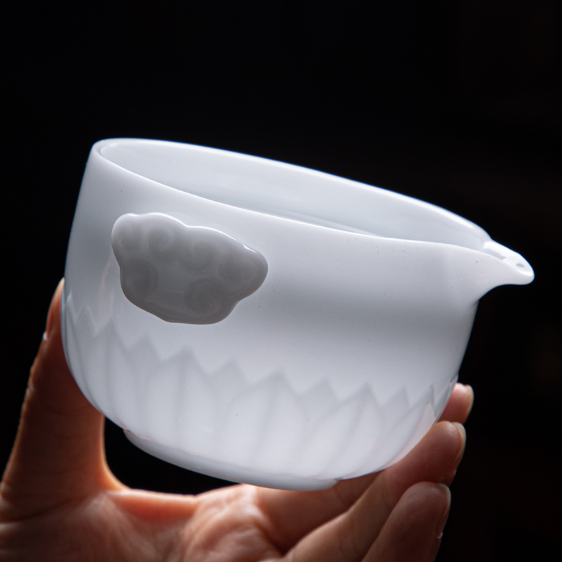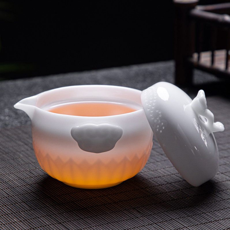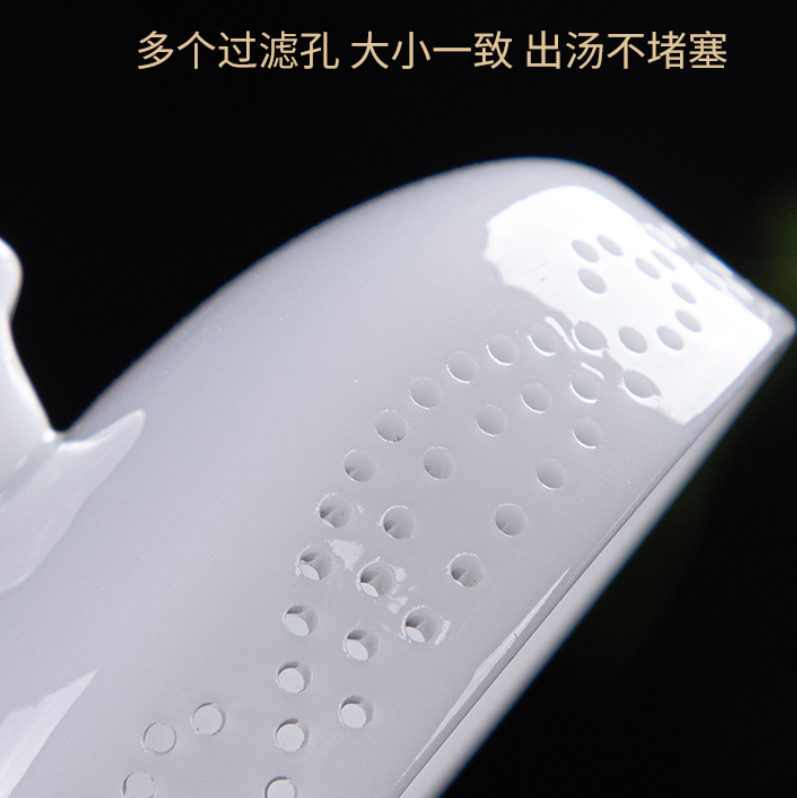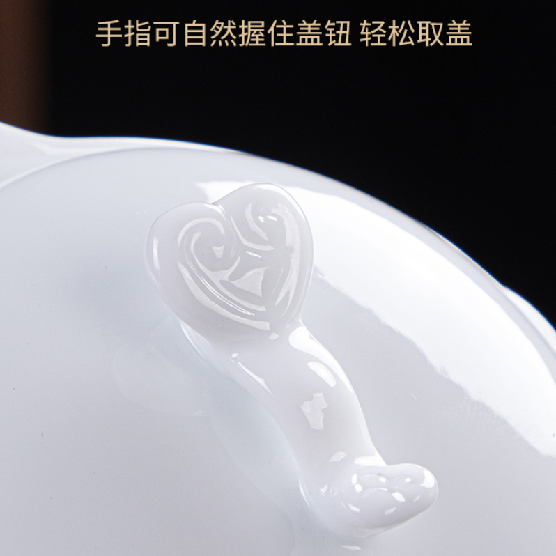 原矿瓷土,高温烧制,瓷化程度好,声音清脆,吸水率小;冰种玉瓷,如脂似玉,通透见影,细腻润滑,洁白如雪。;匠心设计:如意盖钮,祥云防烫抓手,协调、美观吉祥。;手抓壶盖科学设计,茶壶、茶漏、分茶器,一步到位。;便捷包装,轻便收纳。居家、旅行、办公、送礼皆相宜。