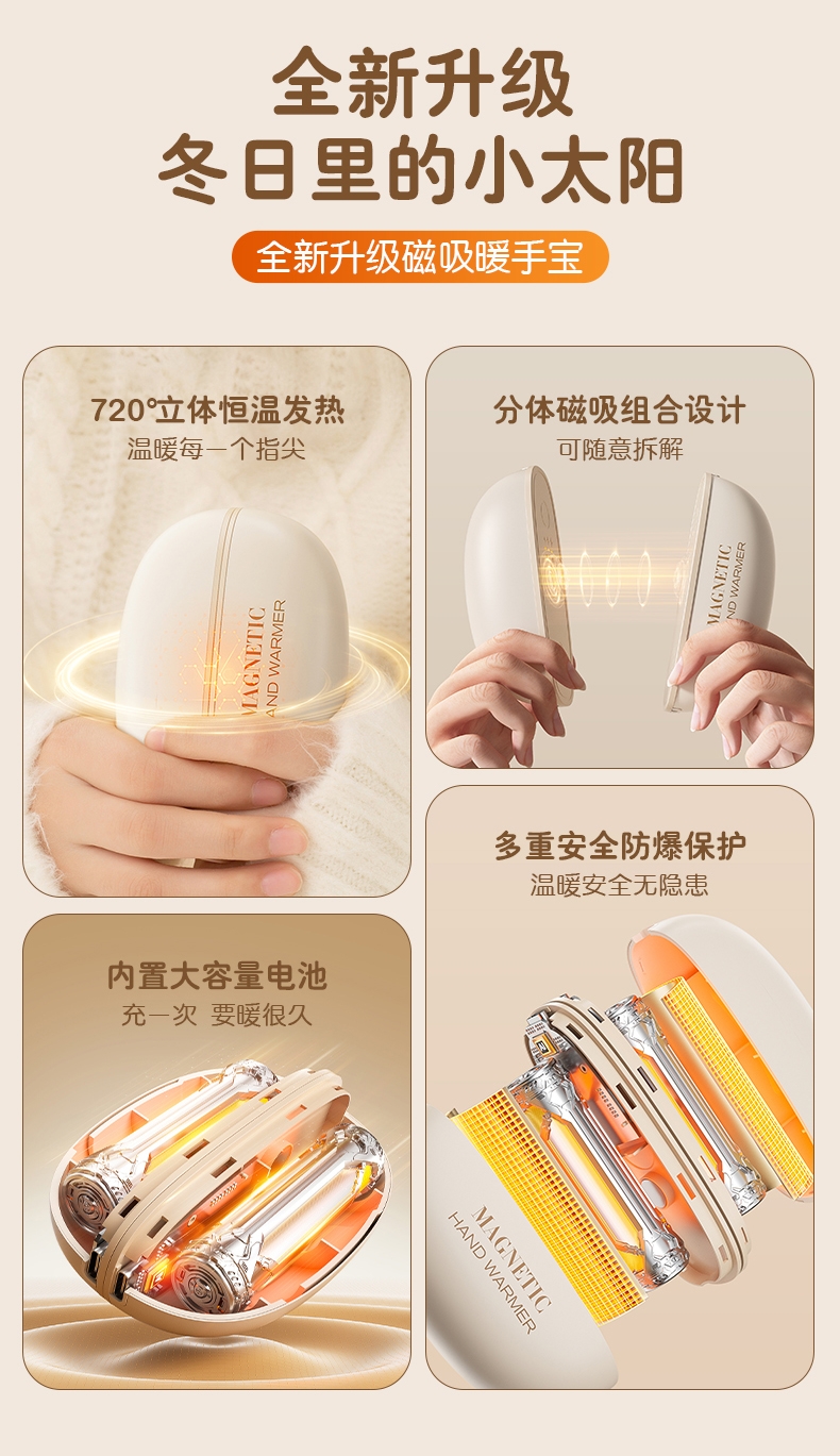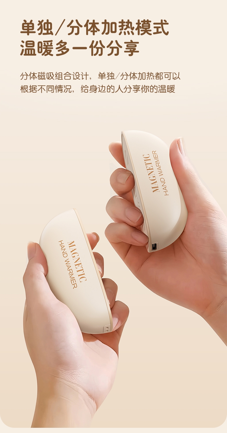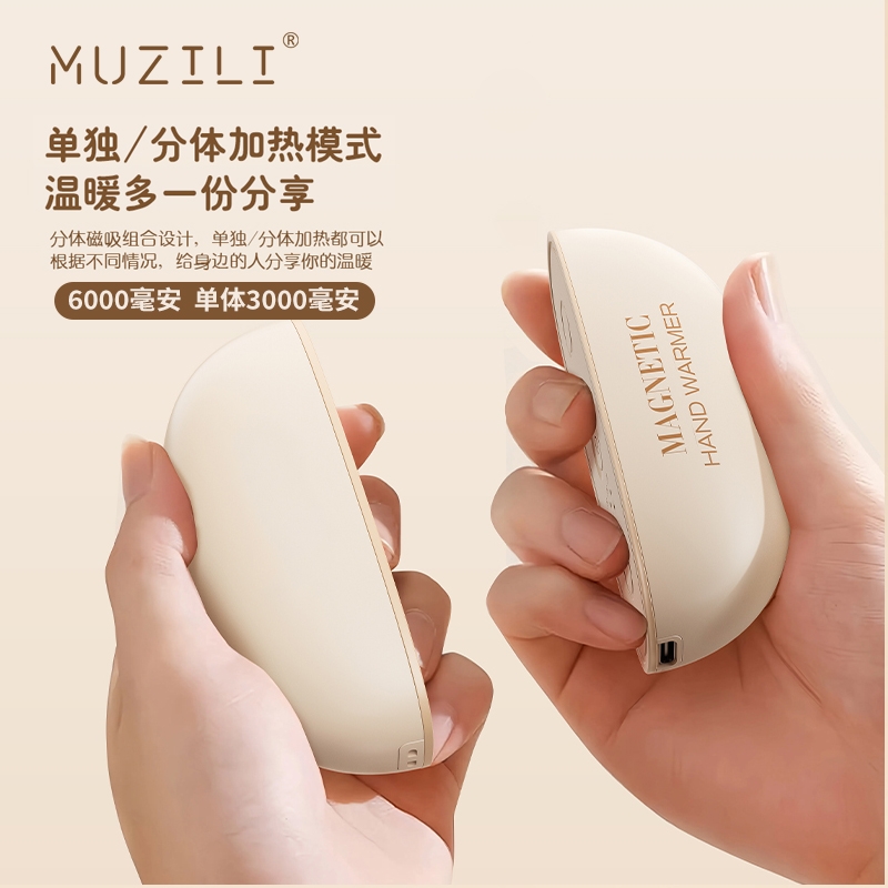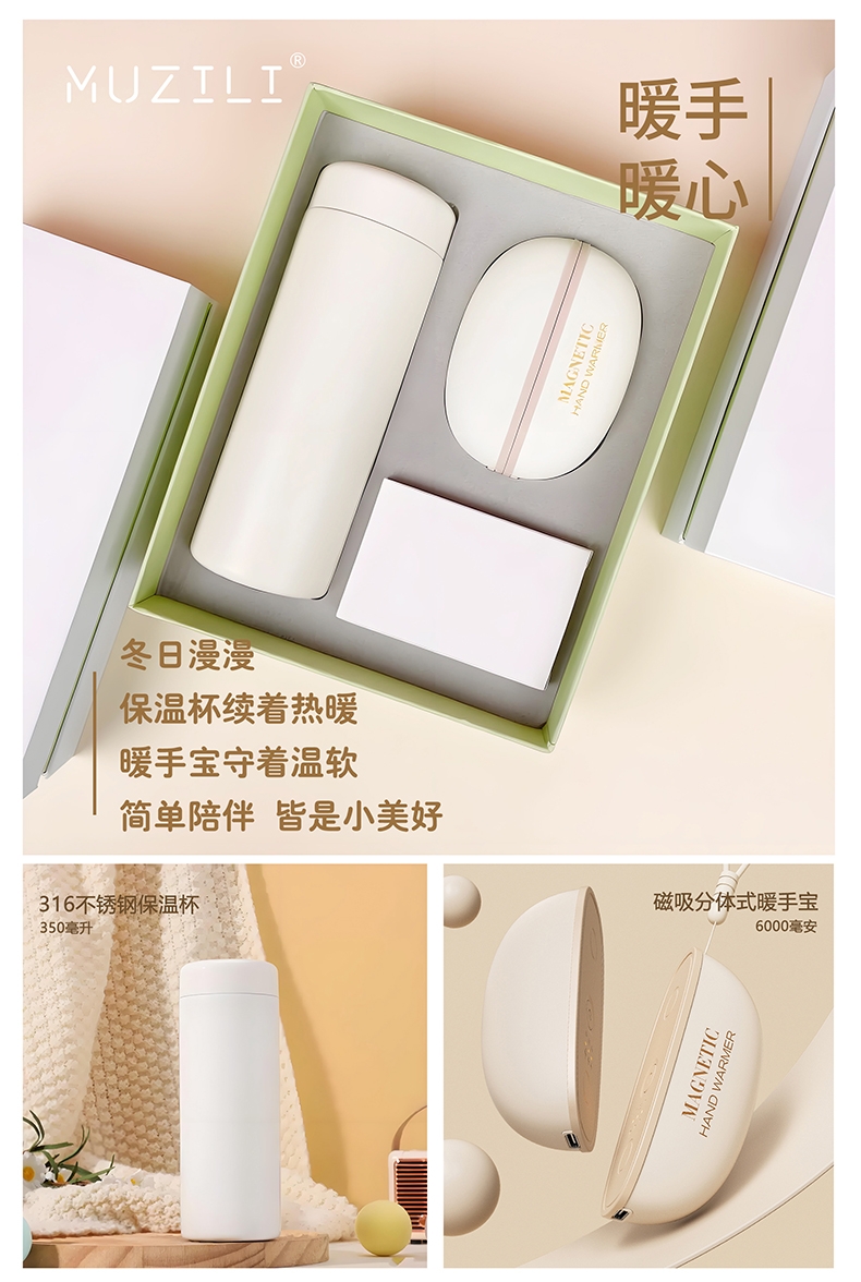 磁吸分体式暖手宝 6000毫安容量;60°恒温发热 360°温暖 三档温控调节一键速热;350ml/316不锈钢保温杯 内壁全316不锈钢;轻盈小巧 6小时保温保冷 自带茶漏,顺滑畅饮;