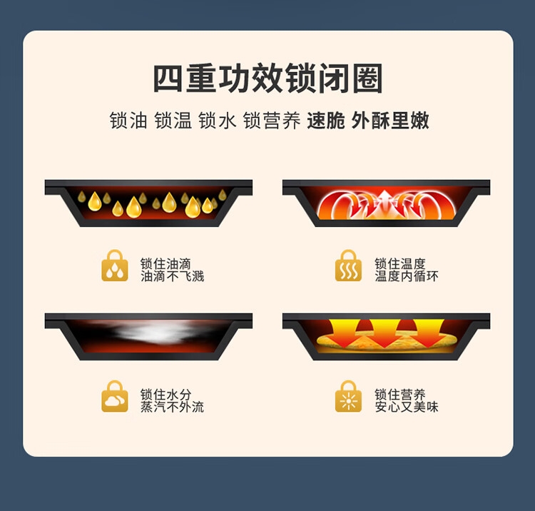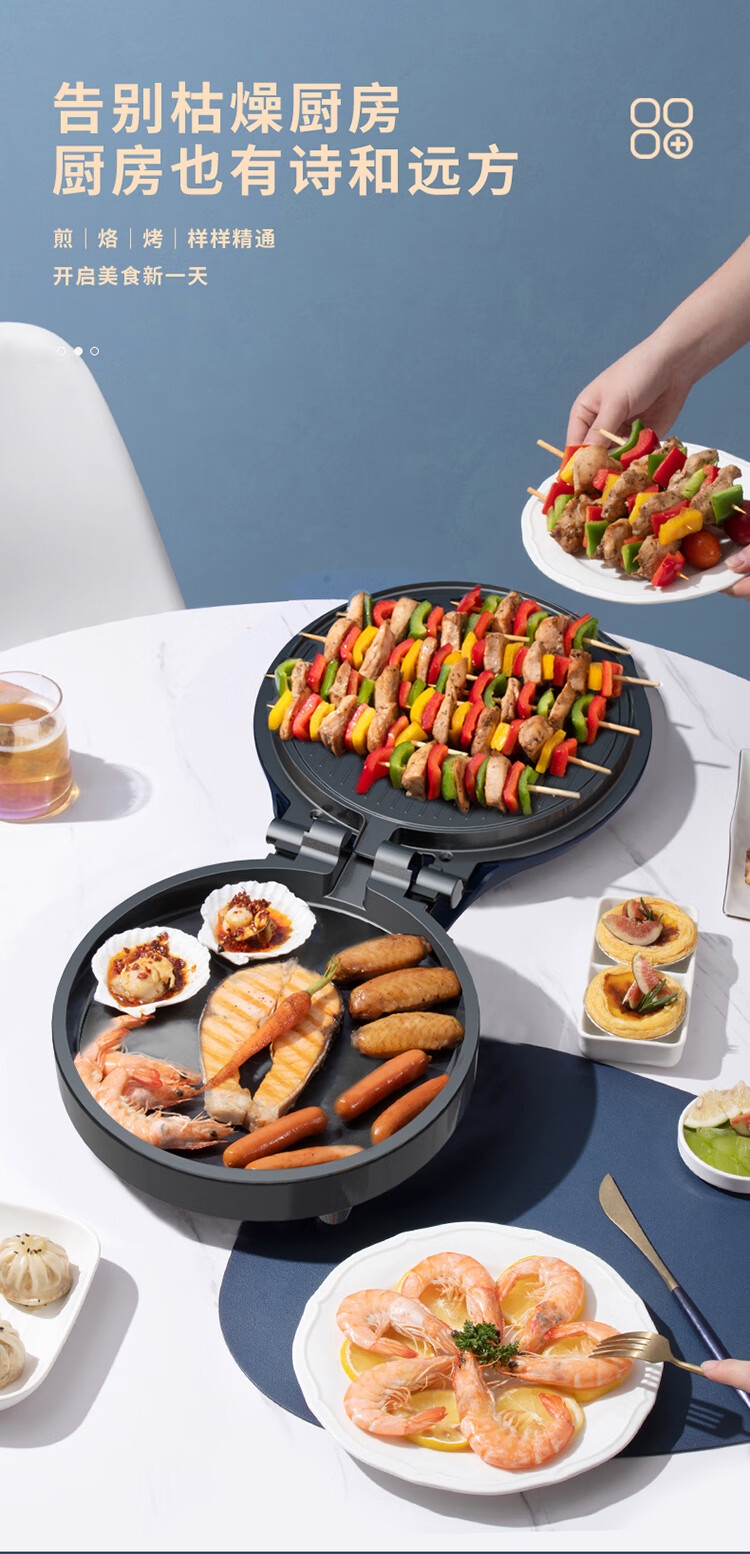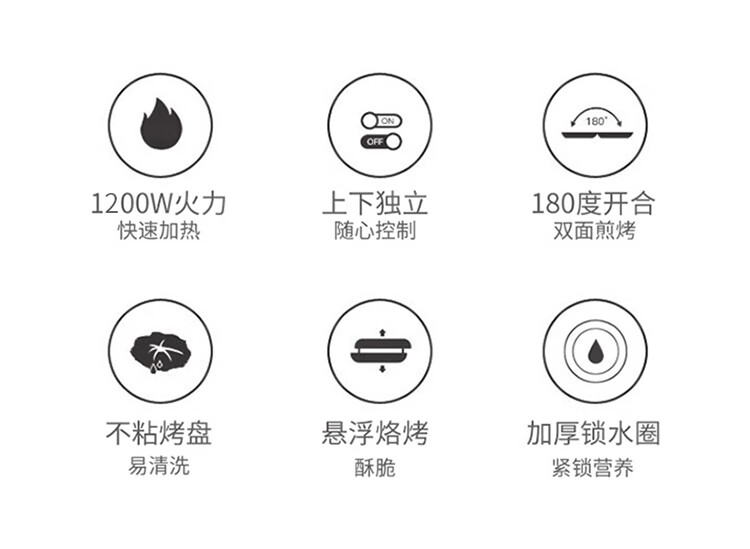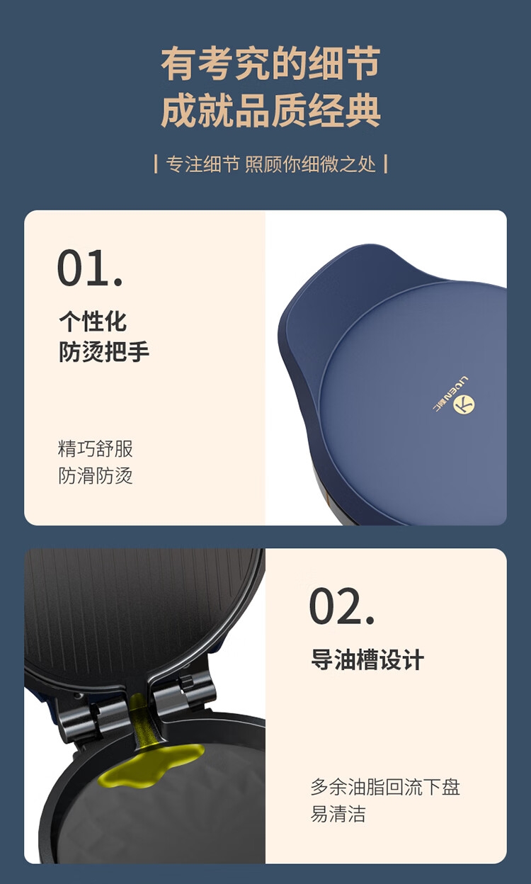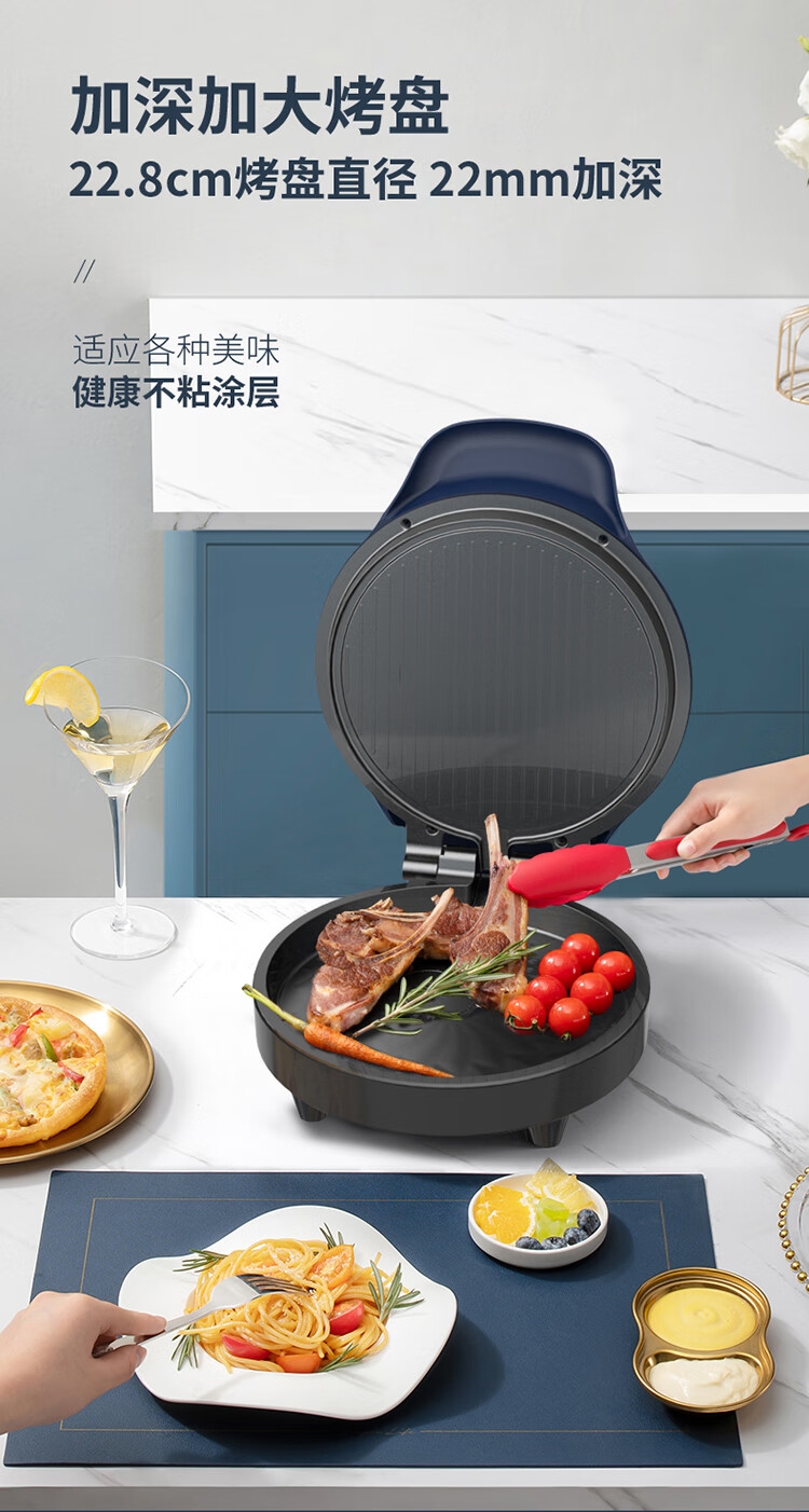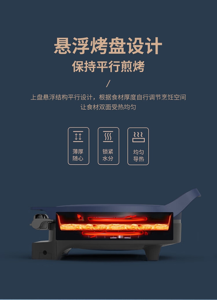 个性化 防烫把手;导油槽设计;波浪纹 上盘;22.8cm烤盘直径 22mm加深;悬浮烤盘设计 保持平行煎烤