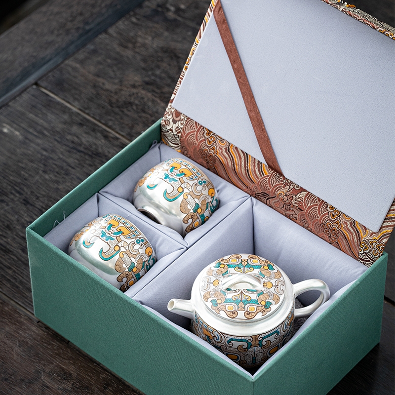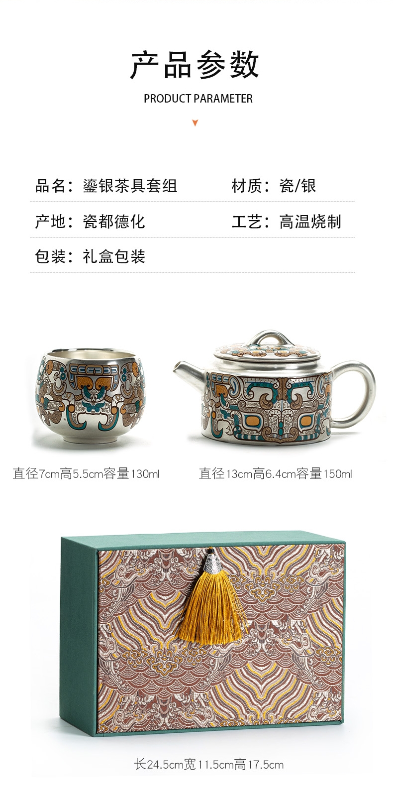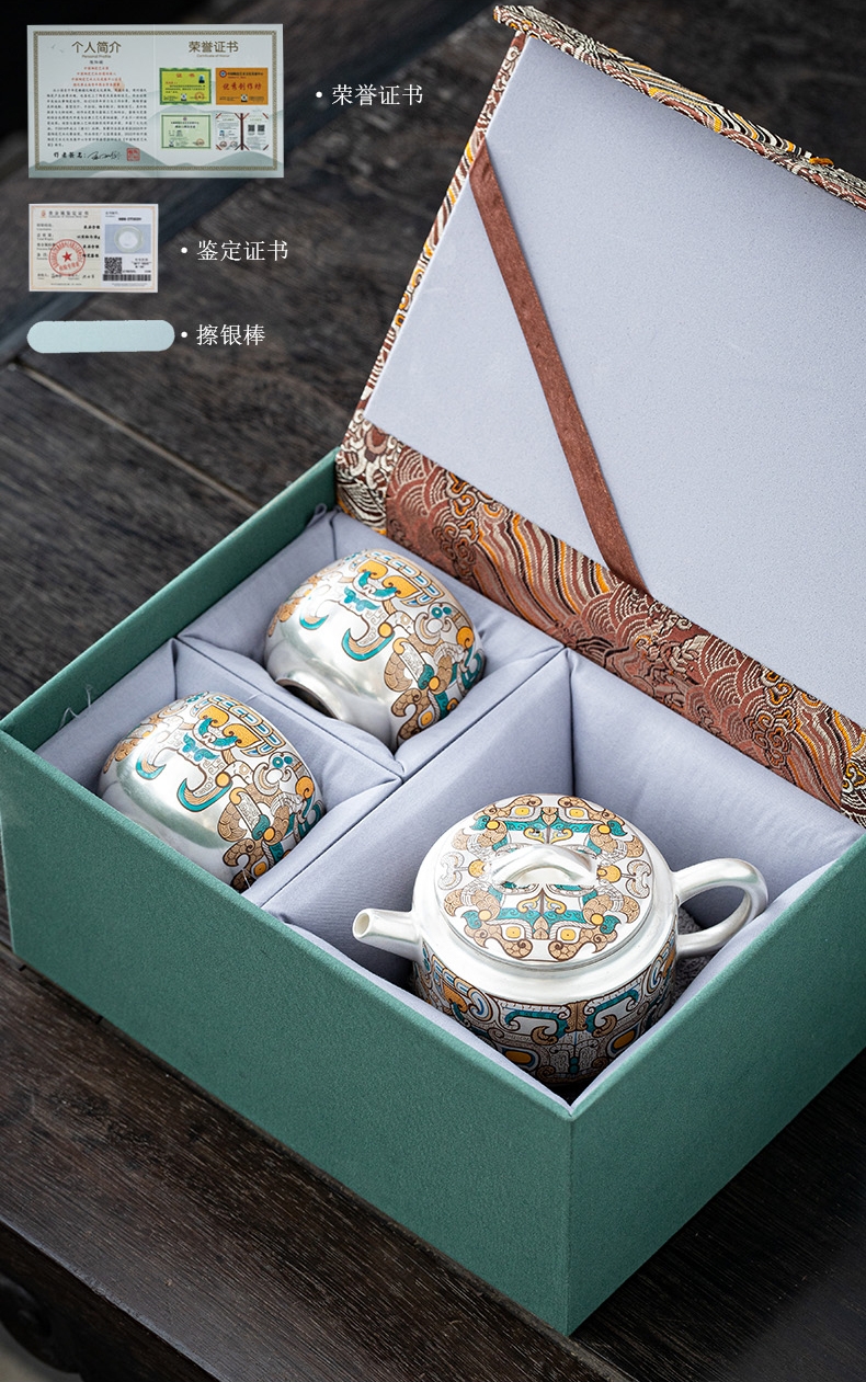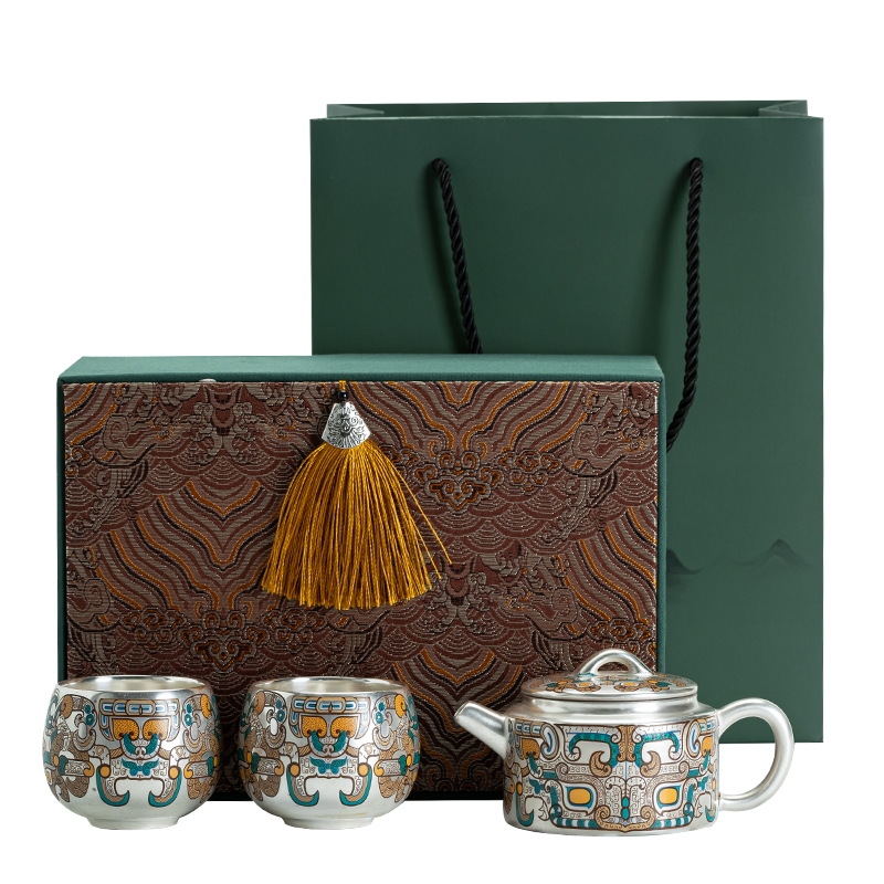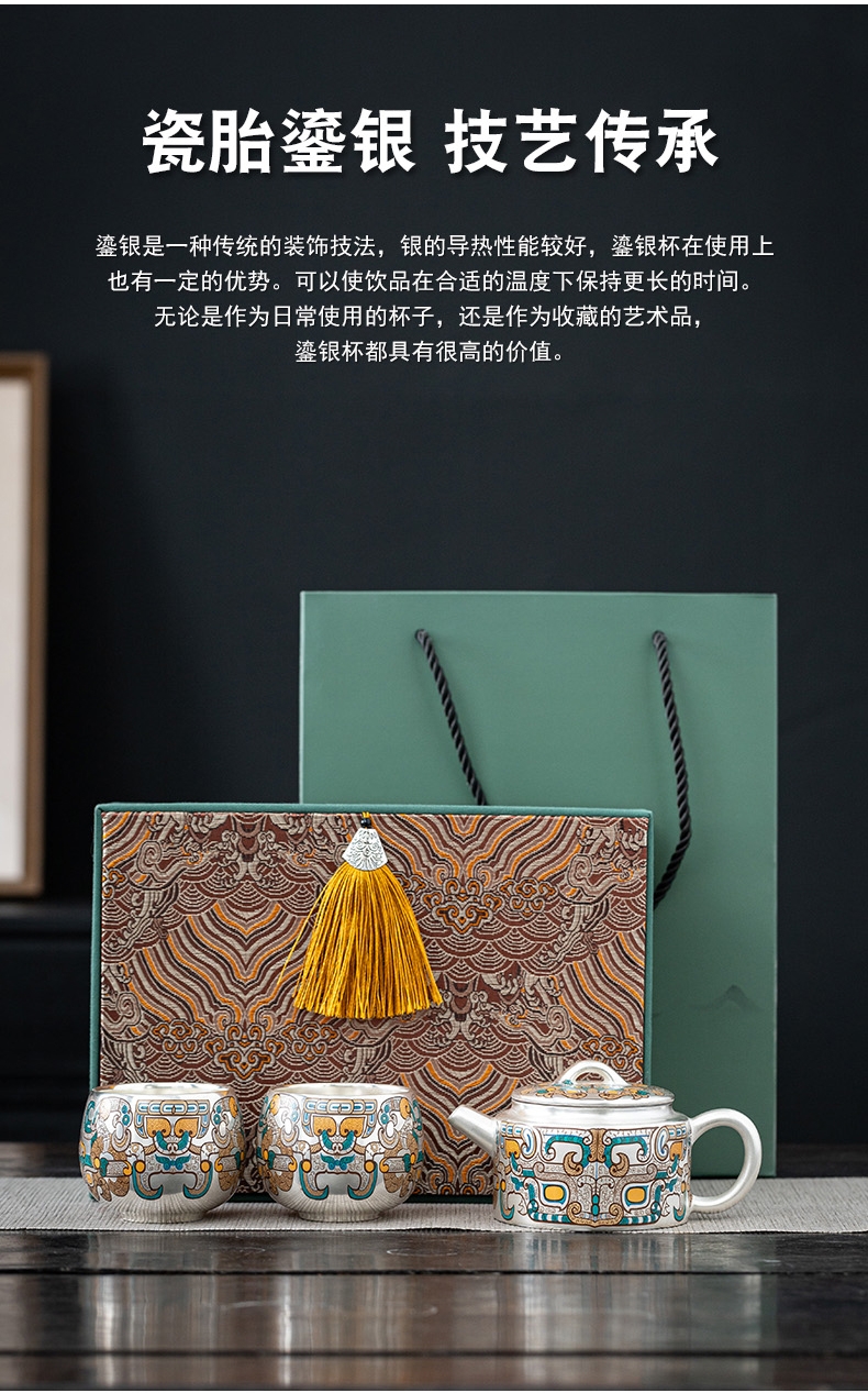 配置清单:鎏银茶壶*1 鎏银杯子*2 礼盒*1 礼袋*1