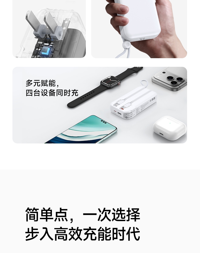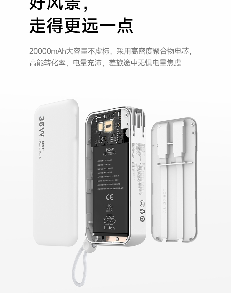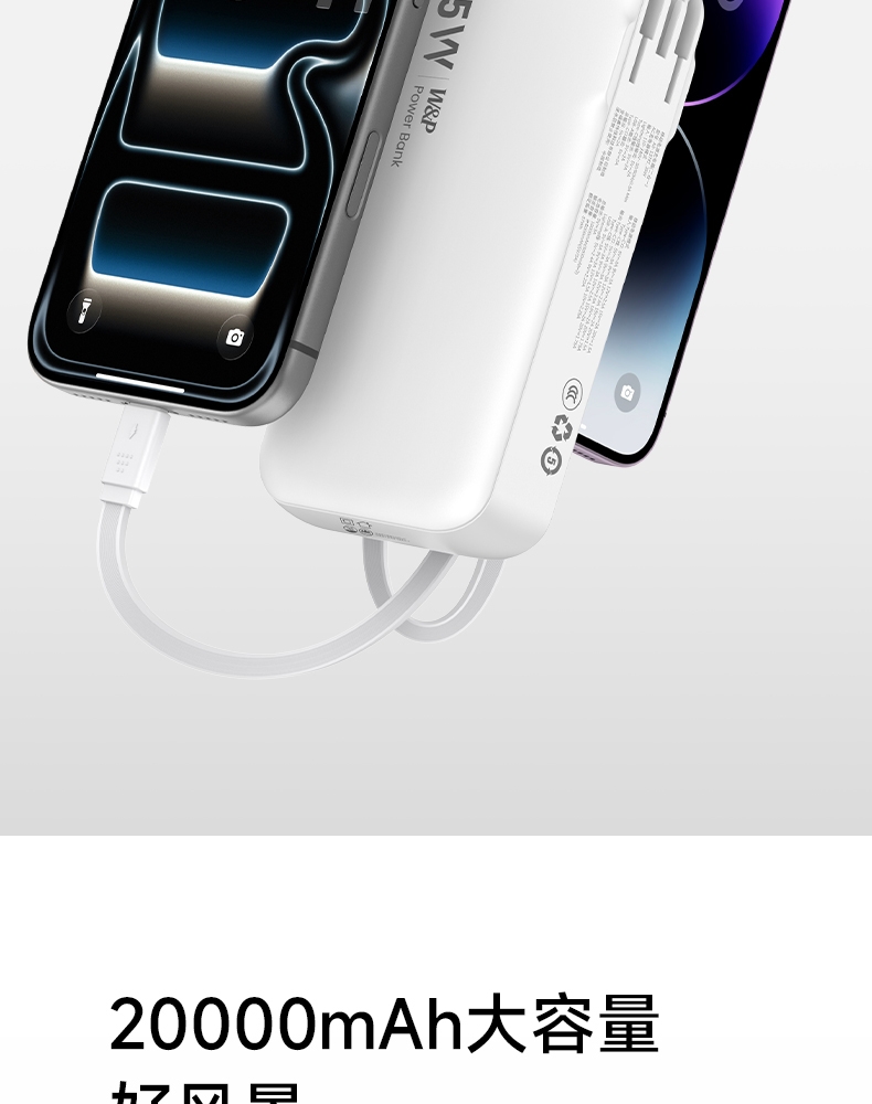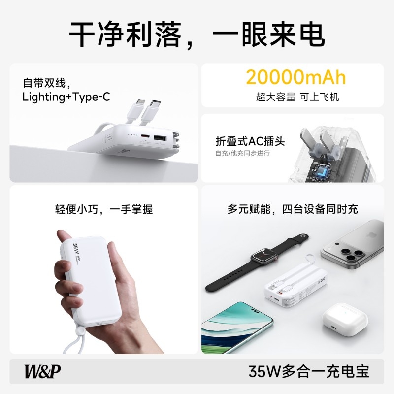 20000mAh大容量;折叠式AC插头;出行无需带线快充双线,畅玩无忧