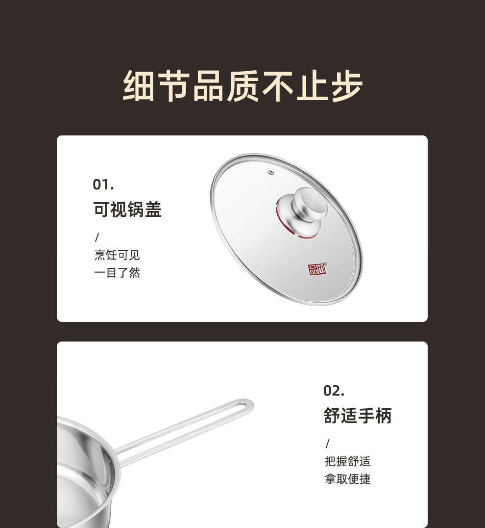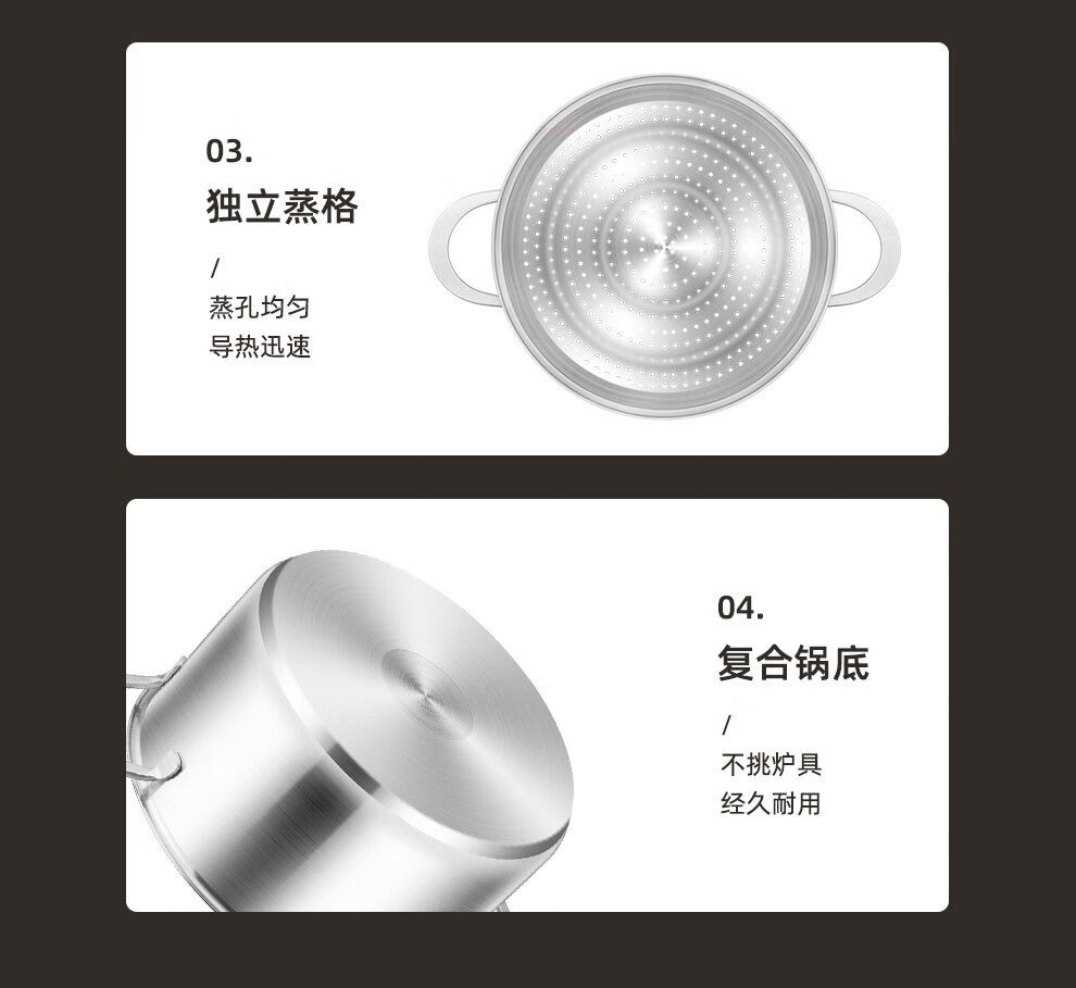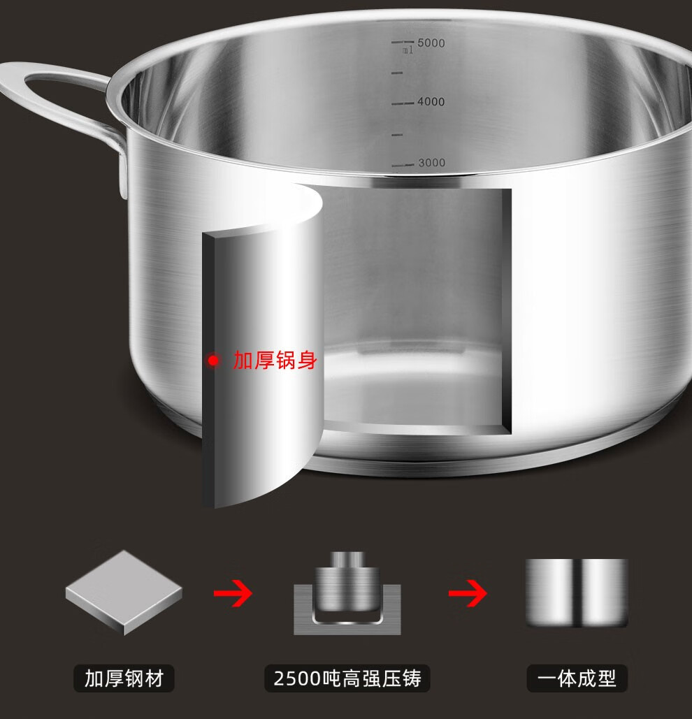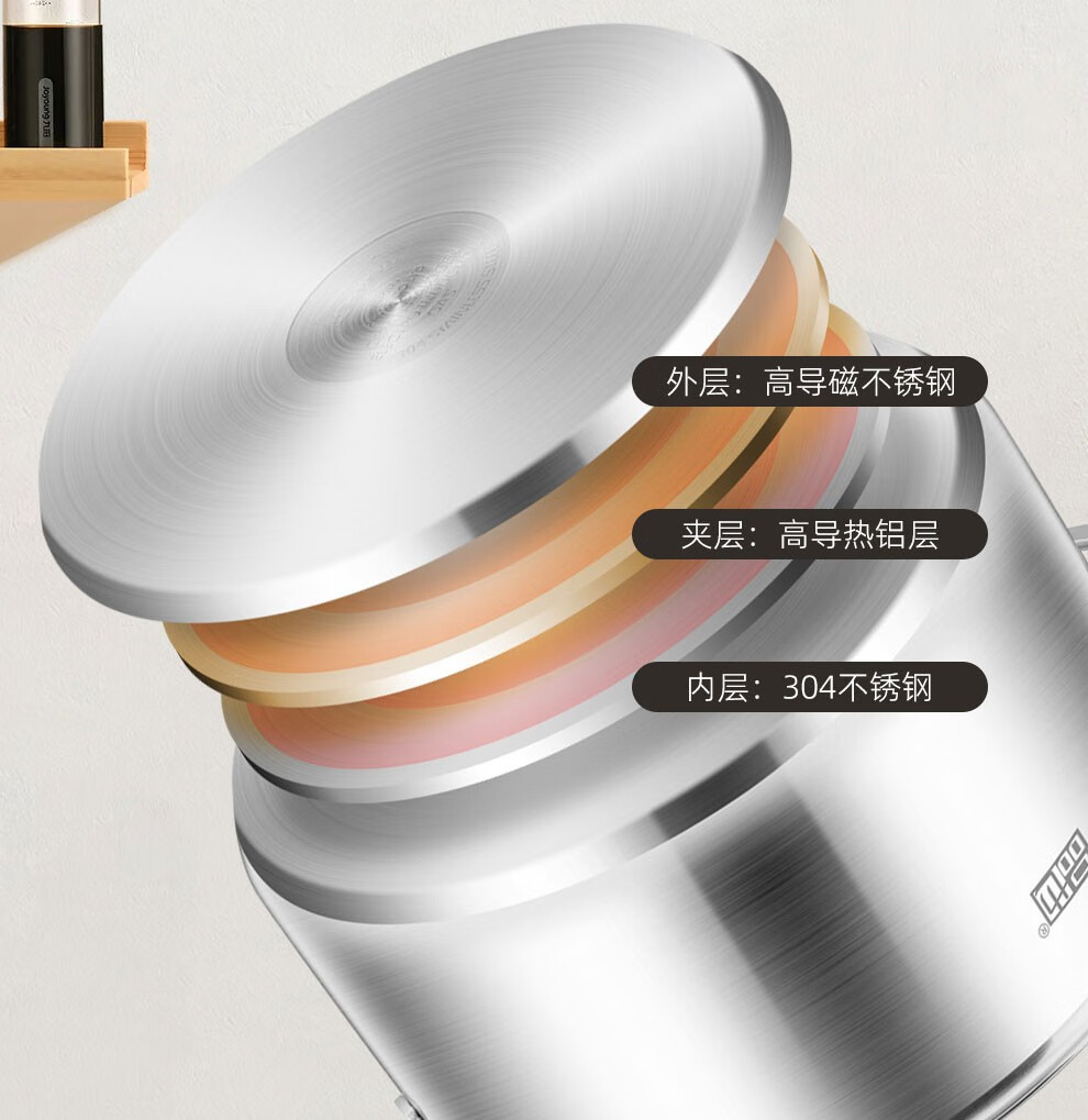 隔热小红圈空心顶珠;侧扁形钢线锅把手设计;三层复合锅底