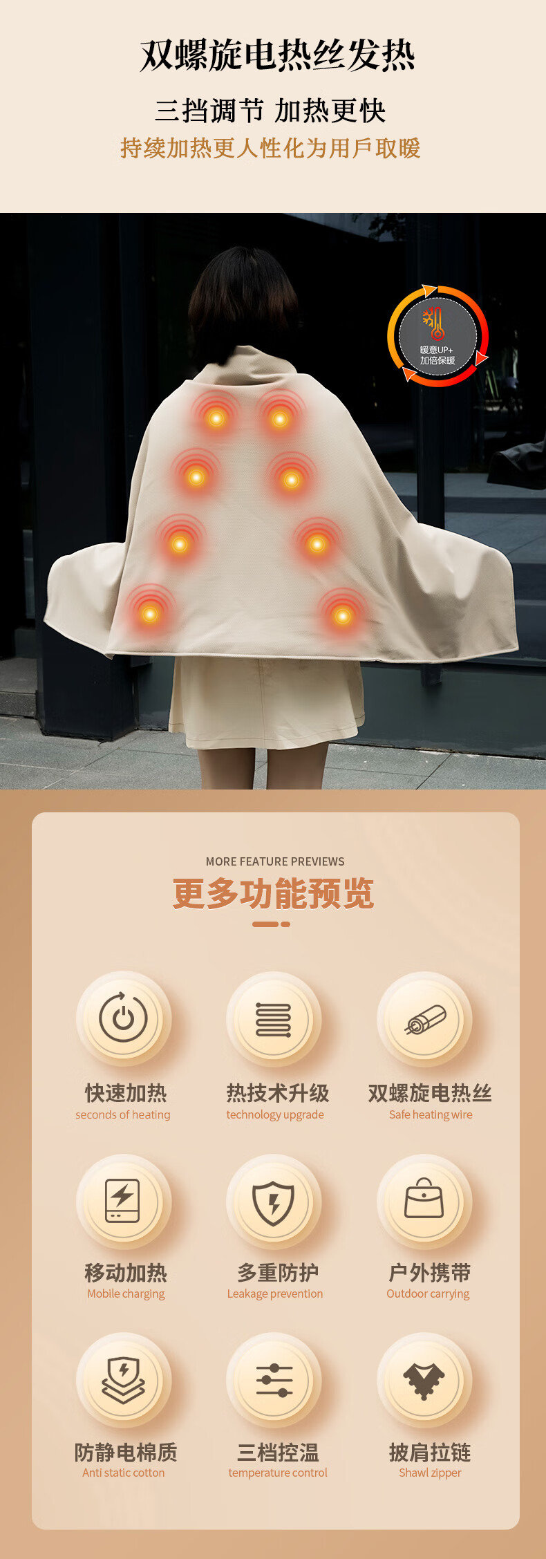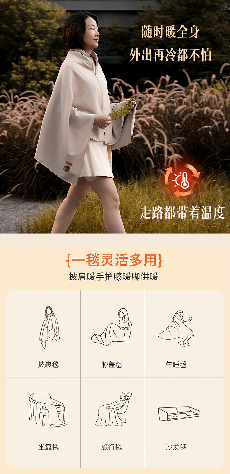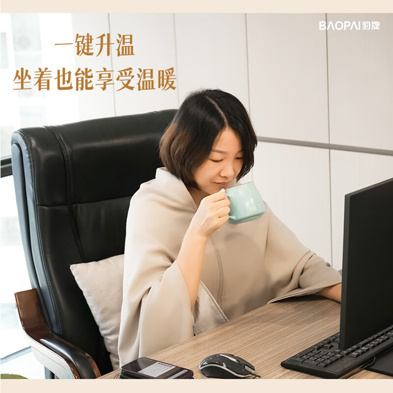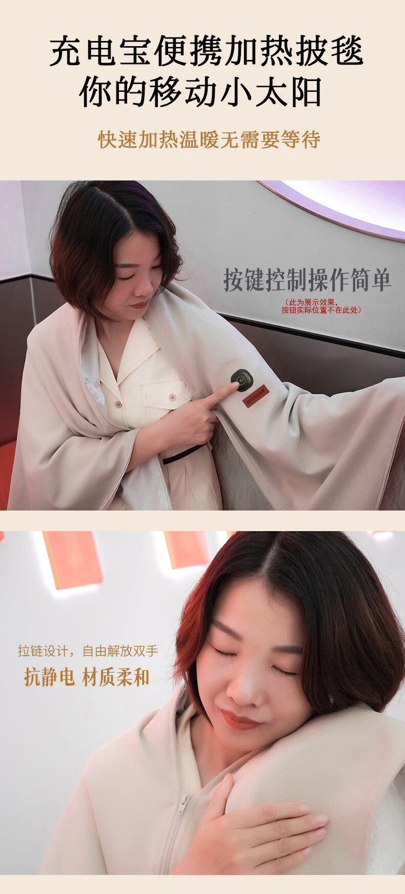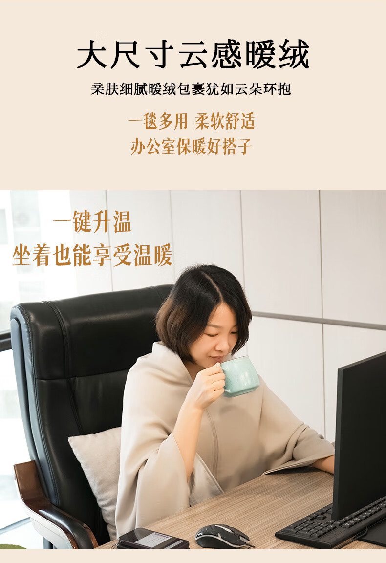 一毯各种场景灵活多用;大尺寸云感暖绒,透气保暖;双螺旋电热丝发热;升级拉链设计,自由解放双手;简单按键操控,三档温度调节
