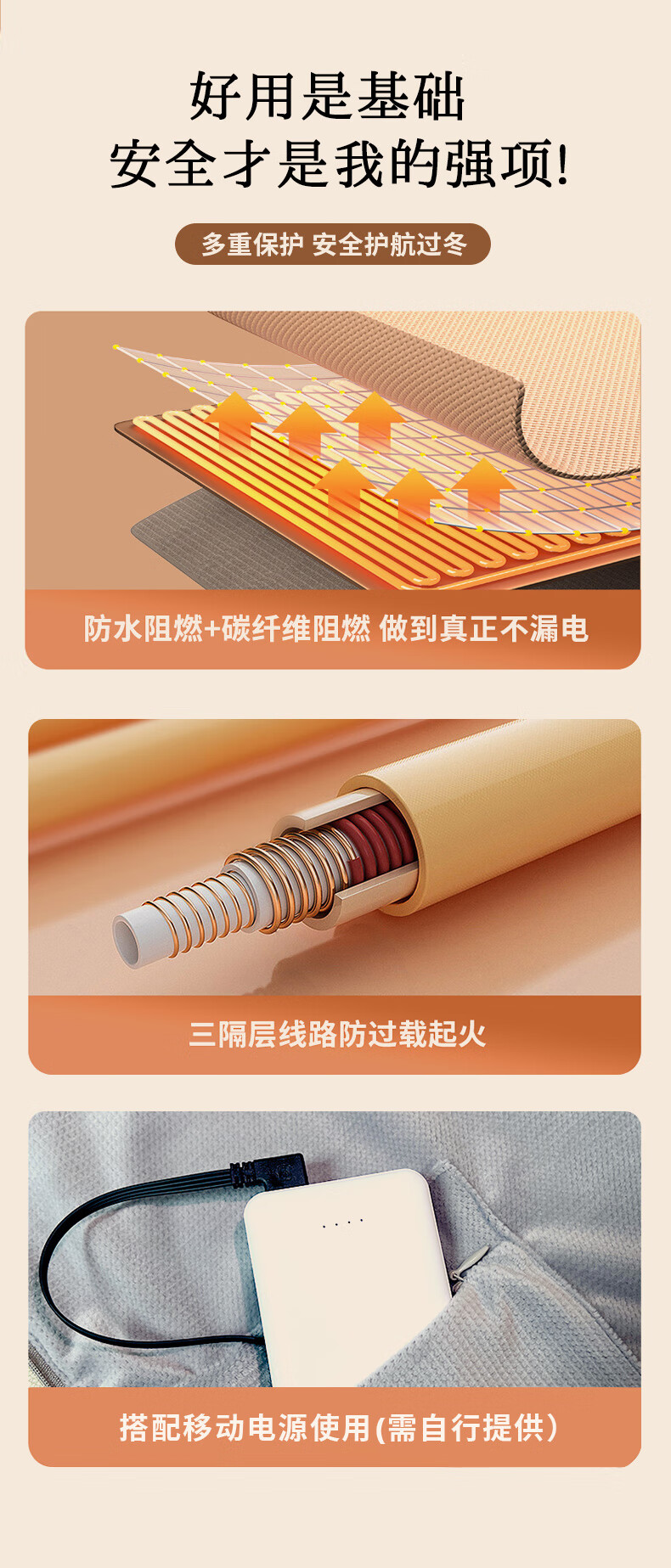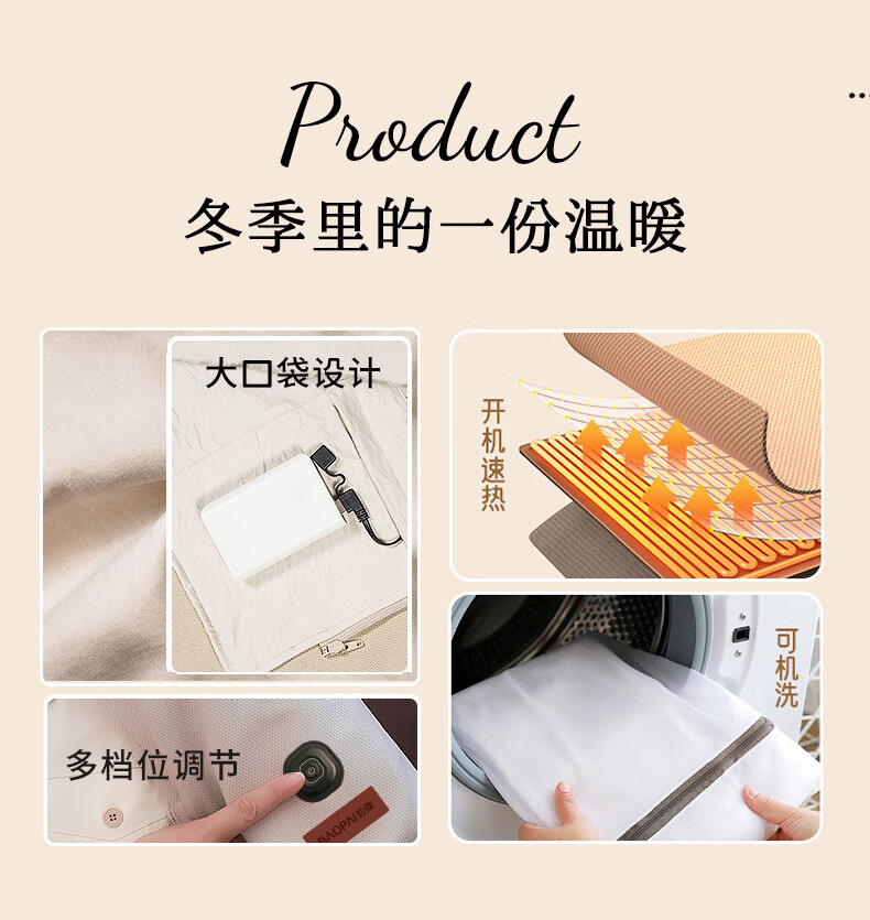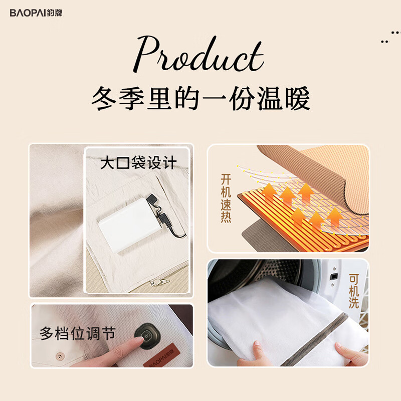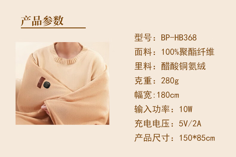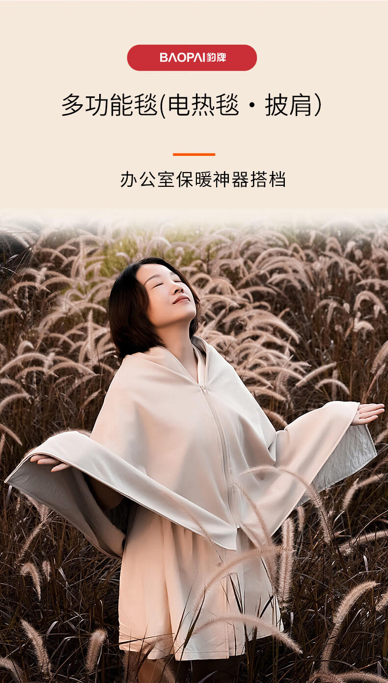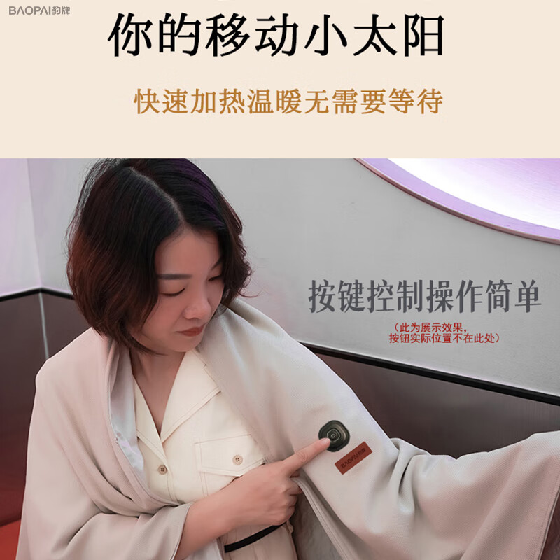 一毯各种场景灵活多用;大尺寸云感暖绒,透气保暖;双螺旋电热丝发热;升级拉链设计,自由解放双手;简单按键操控,三档温度调节
