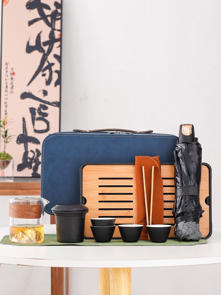 开门红喜庆色彩商务组合套装,简约日式粗陶风;红色,黑色旅行茶具,搭配实用雨伞,一应俱全。;茶水分离杯,双层茶盘,手提皮箱。