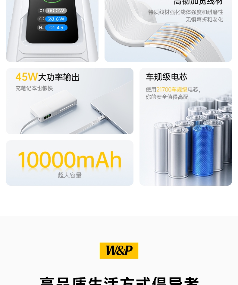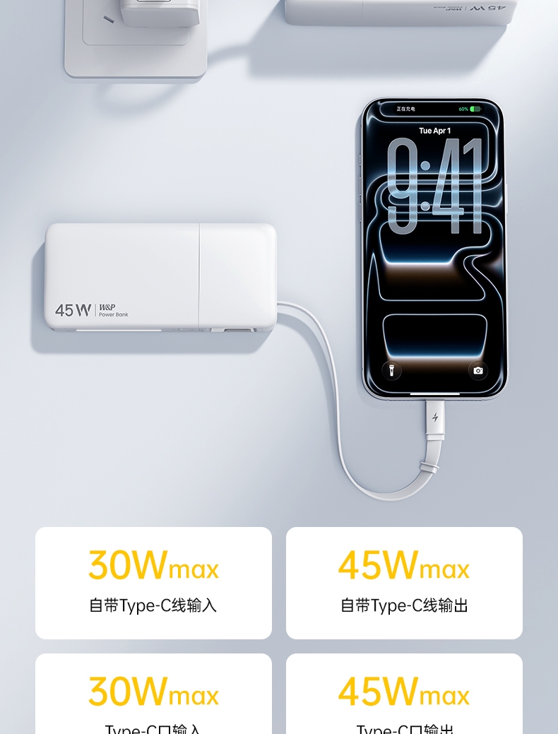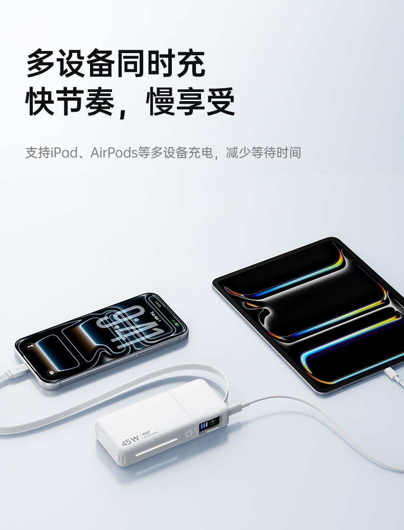 功能:多U口输出,双向快充,自带数据线,自带屏幕显示
