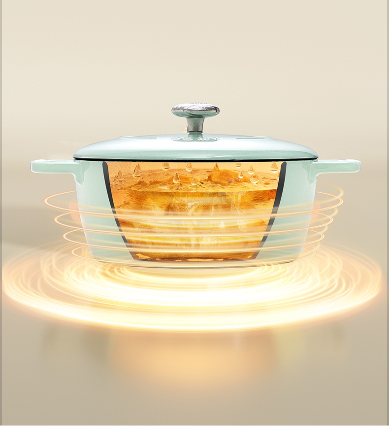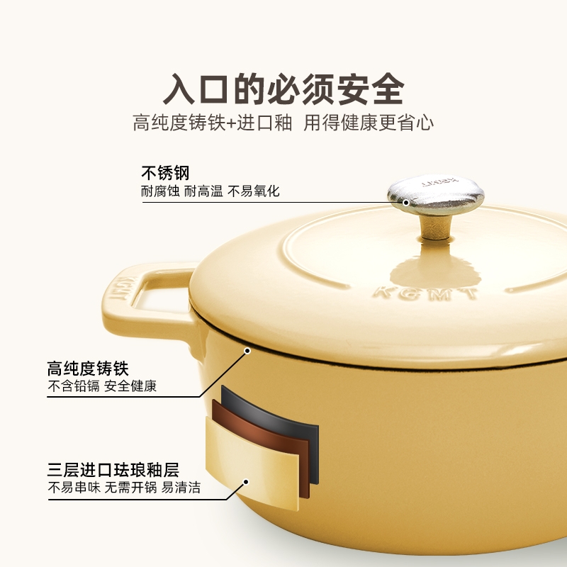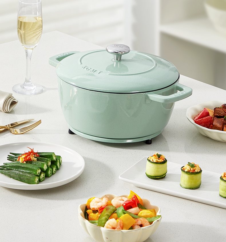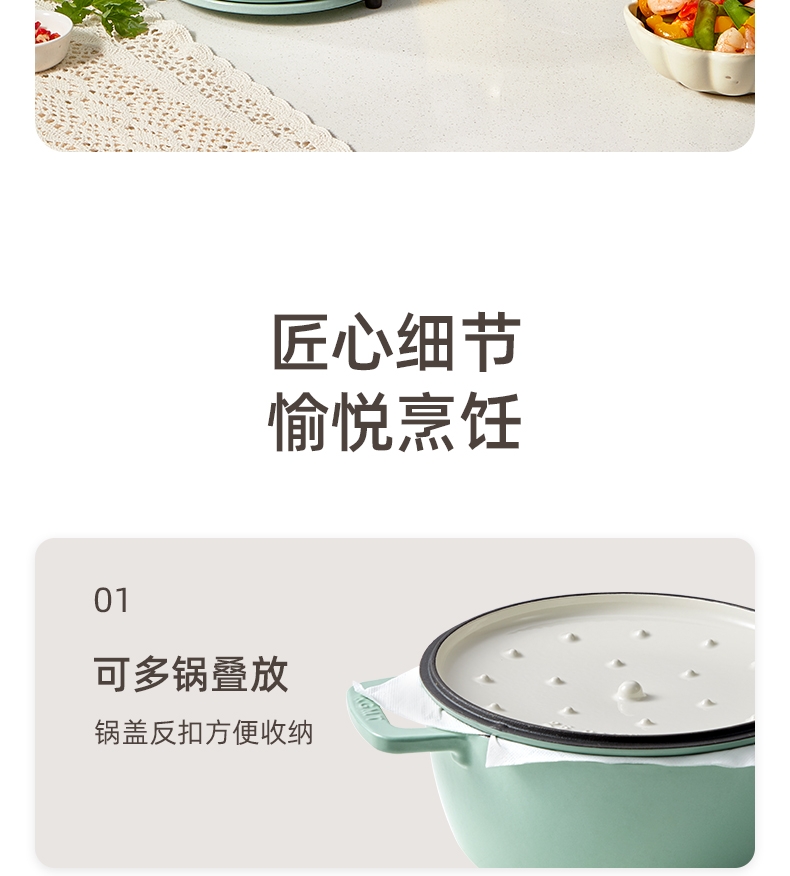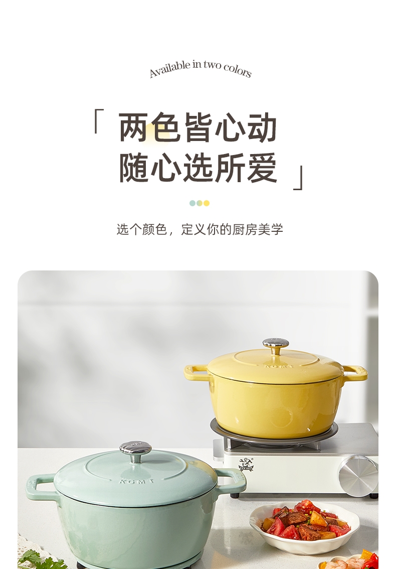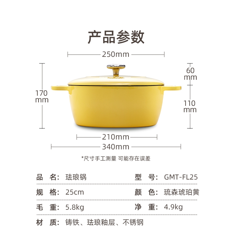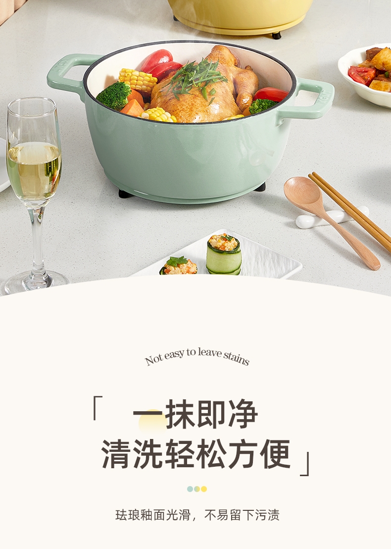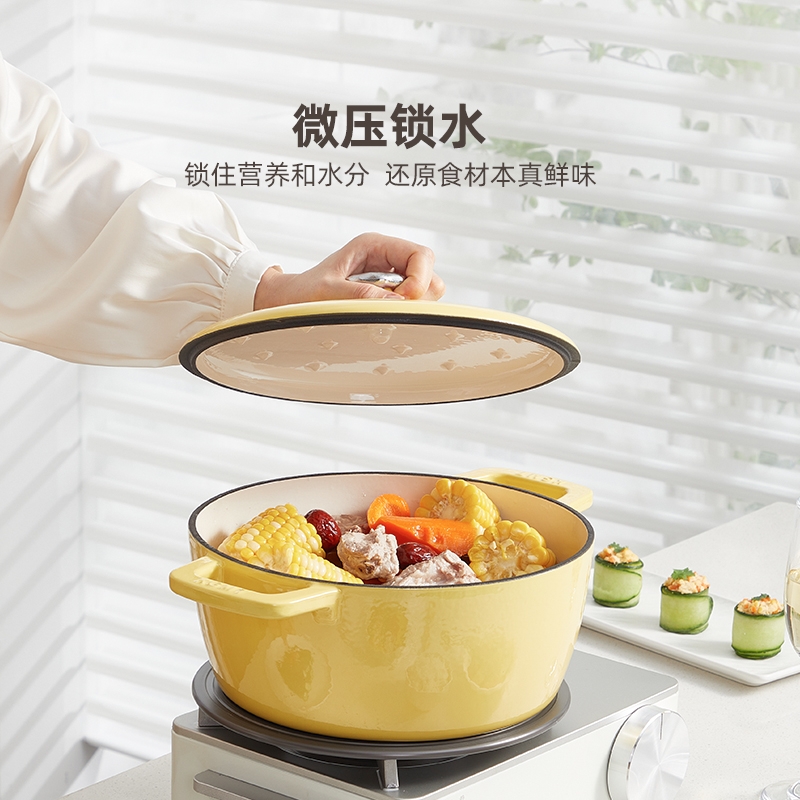 一锅多用,厨房小白变大厨,焖、炖、煮、煎、炸;锅具直径25cm,容量4L大容量,一锅解决所有美食;铸铁锅体,进口陶瓷釉面,安全耐高温,釉面光滑不粘