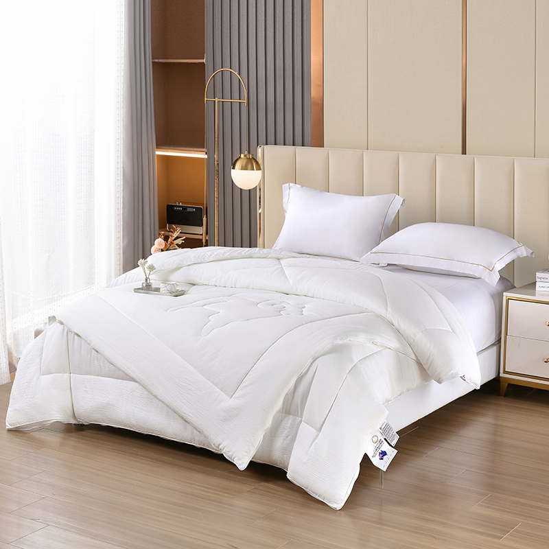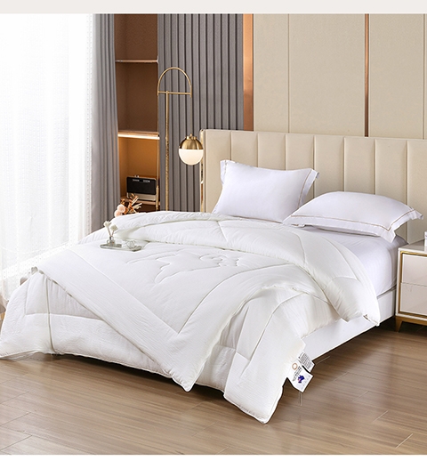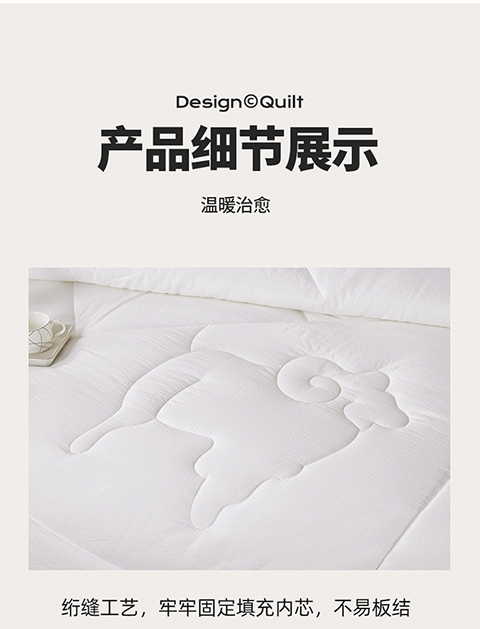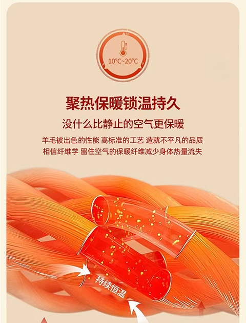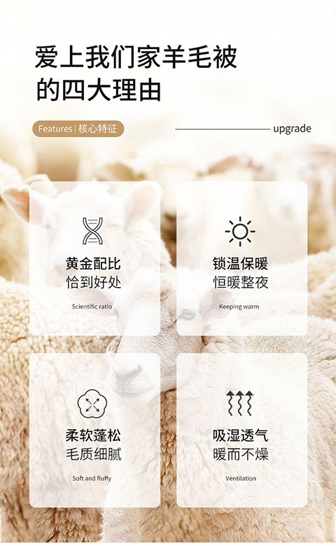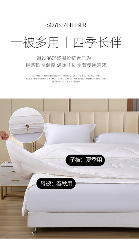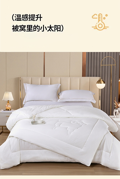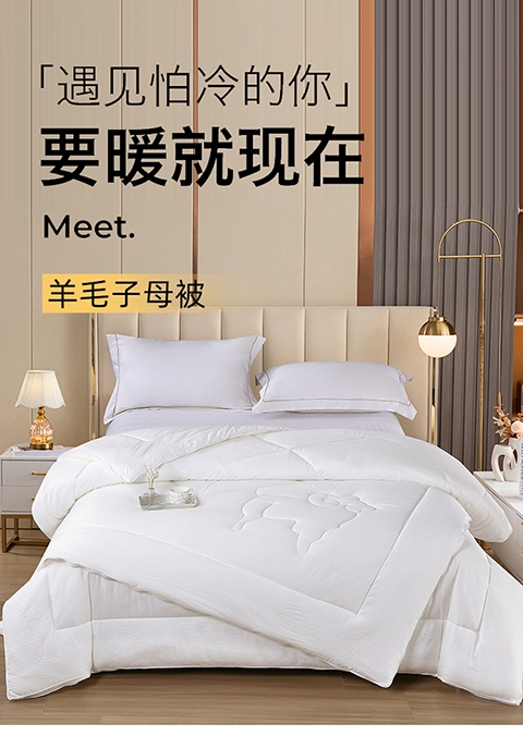 小提花面料,触感柔软,舒适透气;一床被子用四季,母被羊毛填充,保暖舒适;精选水洗羊毛,吸湿排汗,恒温保暖