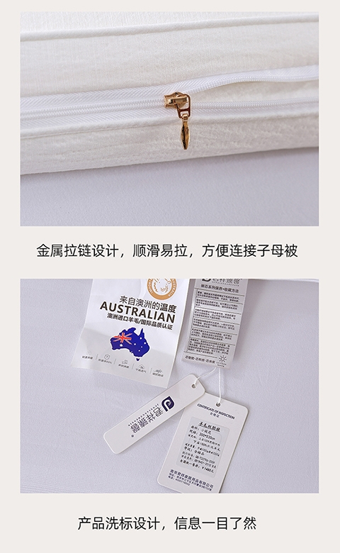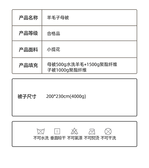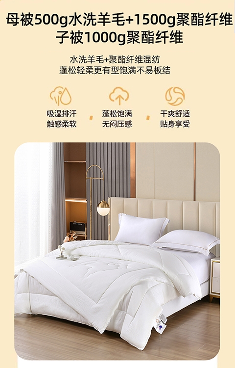 填充:母被500g水洗羊毛+1500g聚酯纤维 子被 1000g聚酯纤维