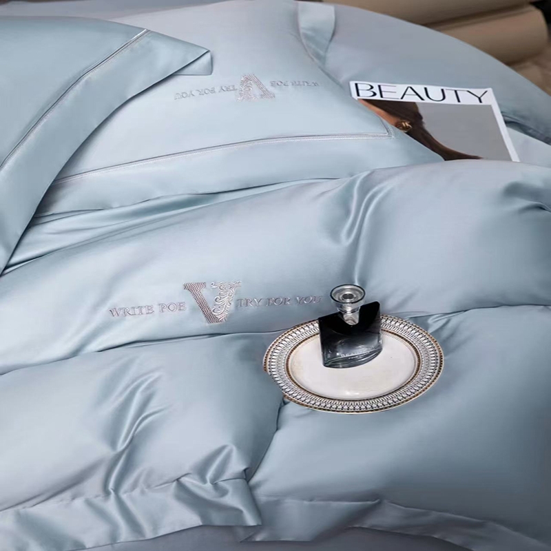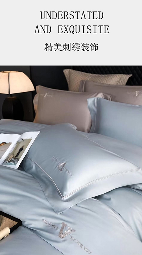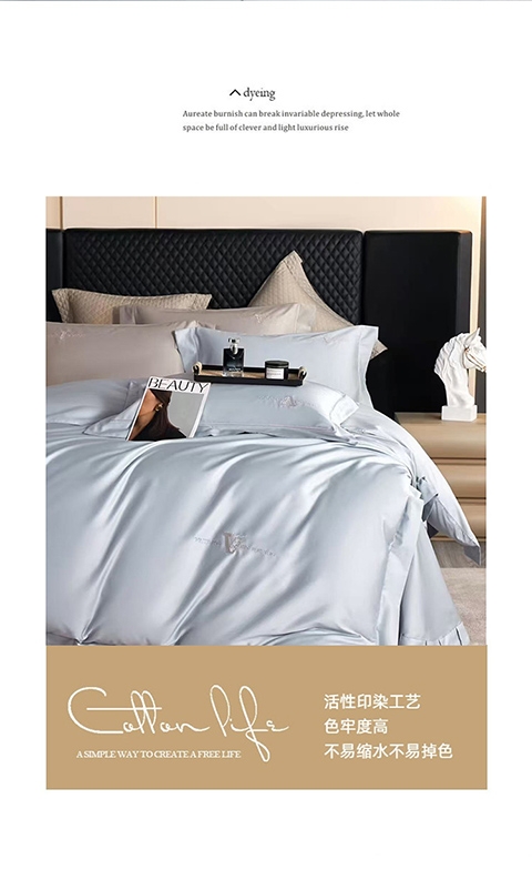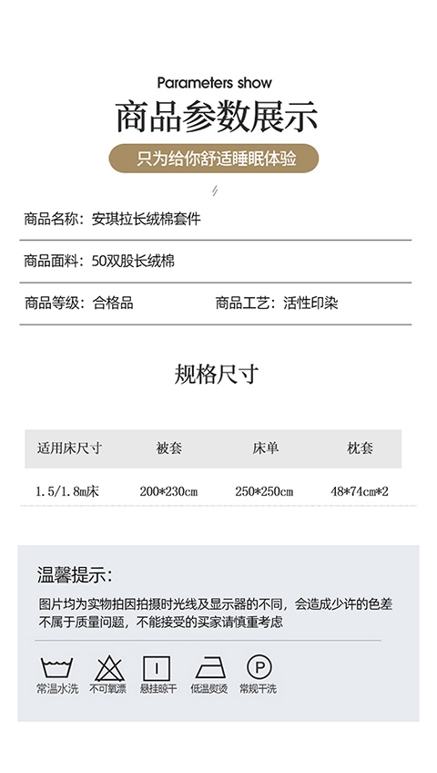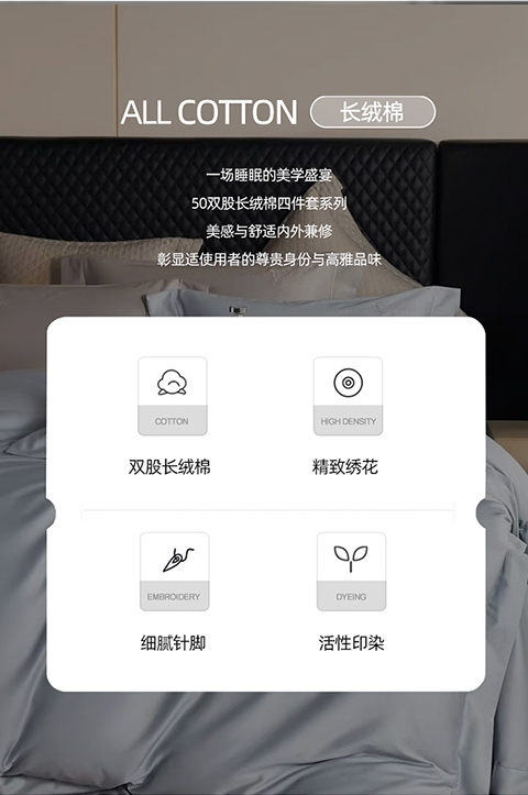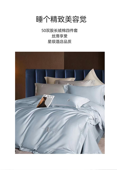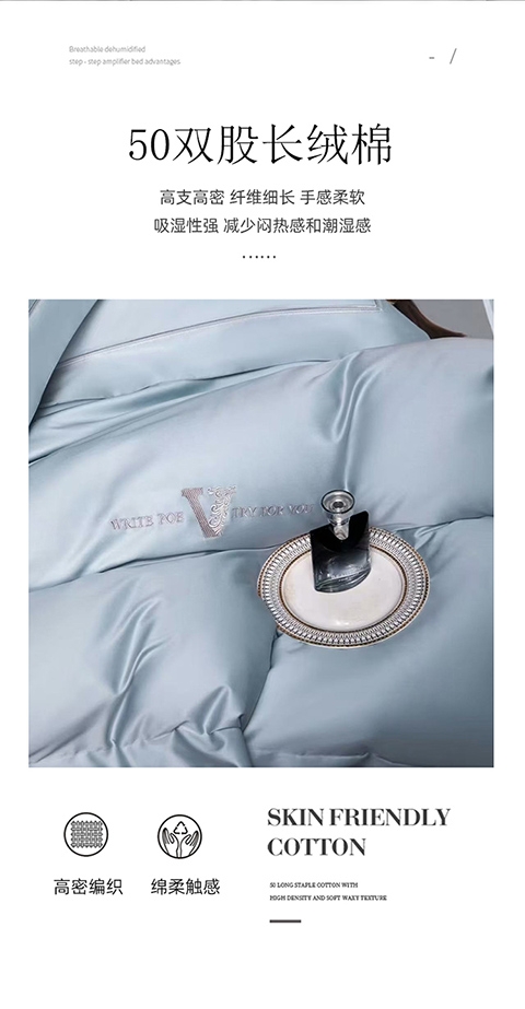 50双股长绒棉,纤维细长,手感柔软;全棉面料,具有良好的吸湿排汗性;精致绣花,环保印染,简约大气,天然环保