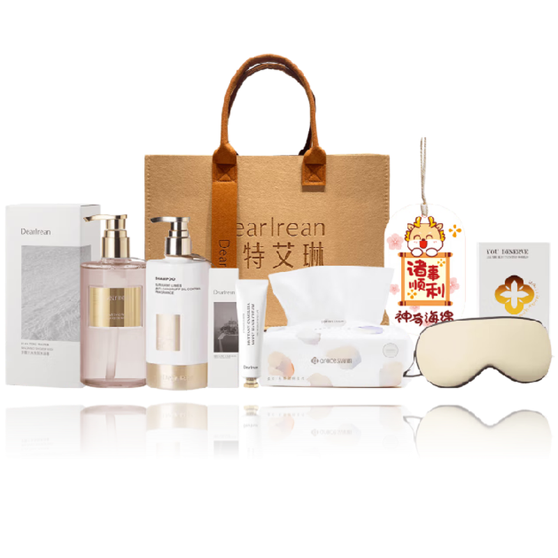 配置清单:1.独特艾琳持久留香香氛洗发水350ml*1支(香型随机) 2.独特艾琳持久留香香氛沐浴露350ml*1(香型随机) 3.独特艾琳香氛护手霜35g*1(香型随机) 4.洁丽雅两用棉柔洗脸巾90抽*1(香型随机) 5.旅文行艺温凉双感可调节眼罩*1(颜色随机 彩盒包装) 6.诸事顺利神奇海绵*1(入水膨胀) 7.独特艾琳独家定制毛毡礼袋