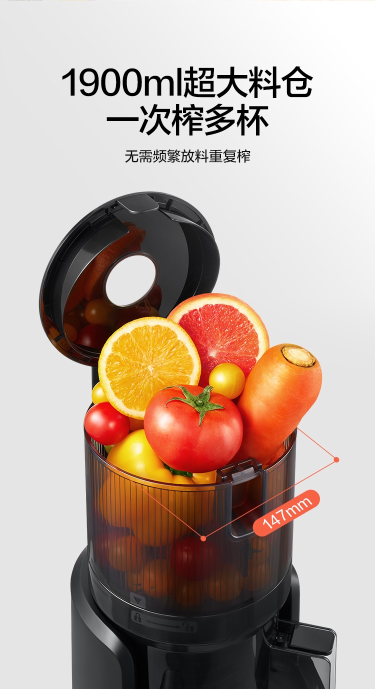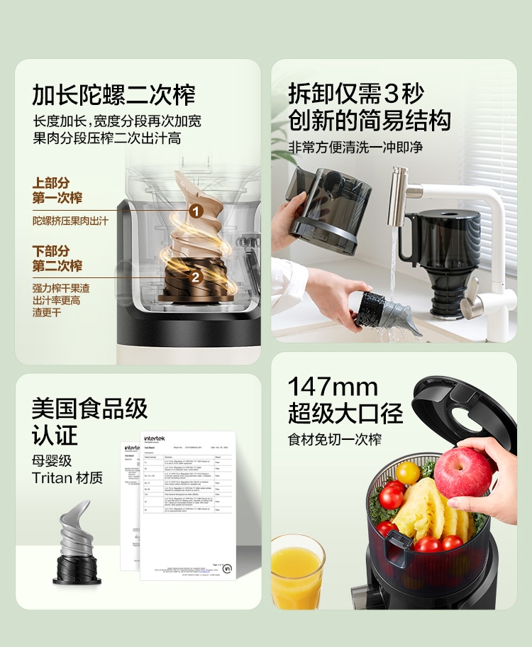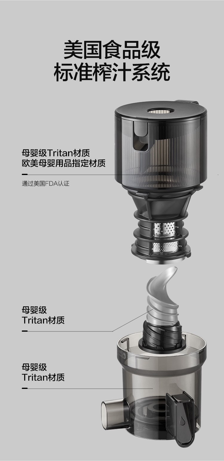 美国食品级标准榨汁系统,榨汁全路径母婴Tritan;坚硬如铁,不惧石榴籽,硬食材,强耐酸,可榨柠檬;更精细仿石磨慢磨技术,2项压榨结构专利