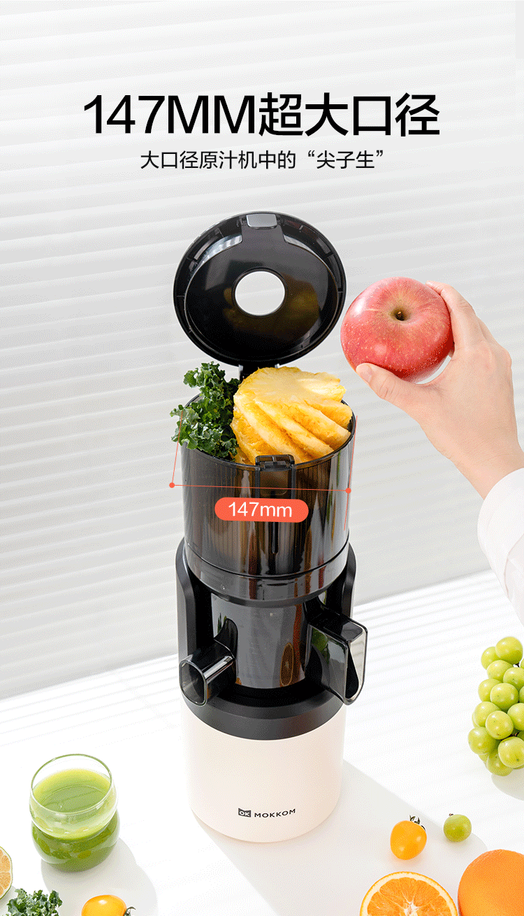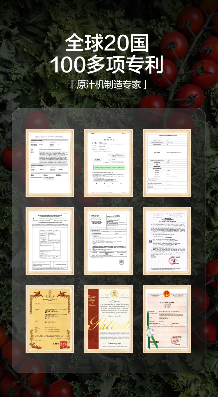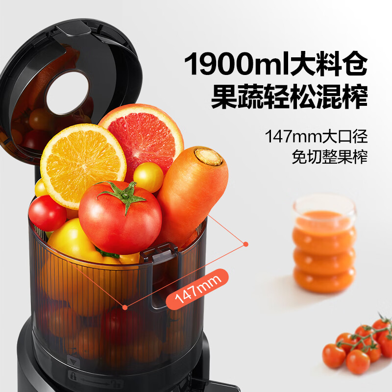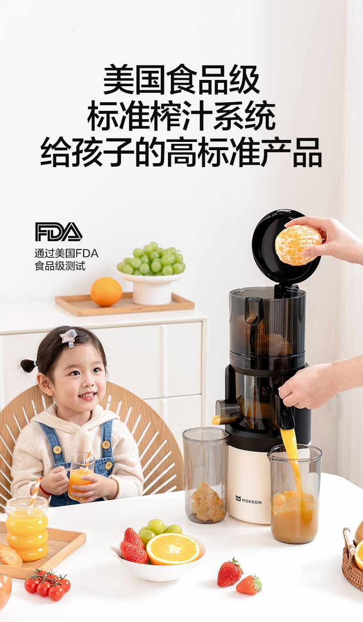 美国食品级标准榨汁系统,榨汁全路径母婴Tritan;坚硬如铁,不惧石榴籽,硬食材,强耐酸,可榨柠檬;更精细仿石磨慢磨技术,2项压榨结构专利