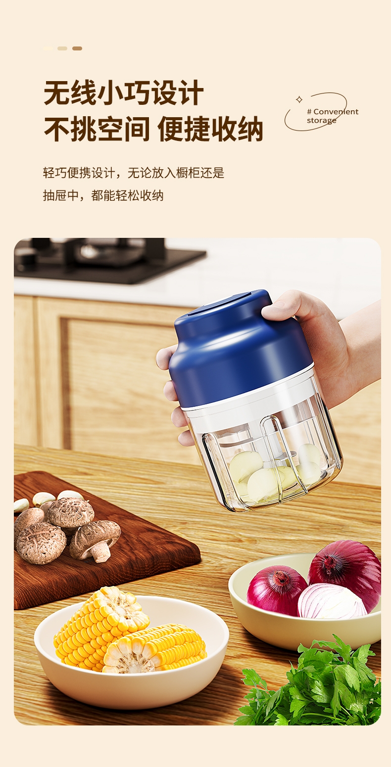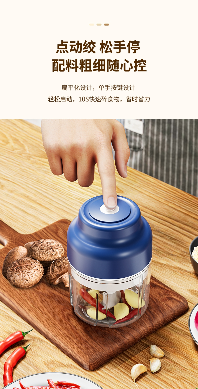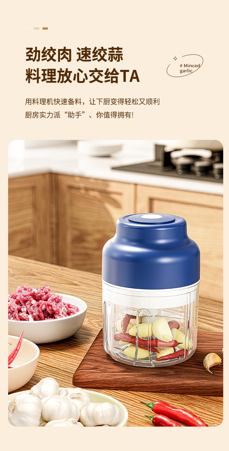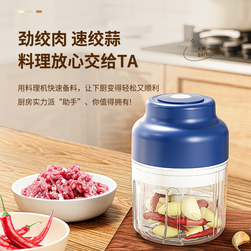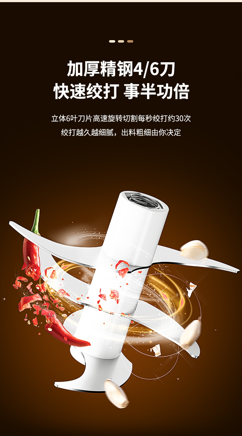 小巧便携自由料理;精钢4/6叶刀多维均匀切碎;大功率电机强劲动力绞肉