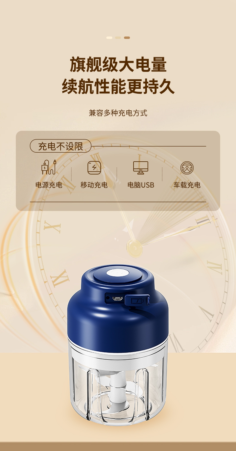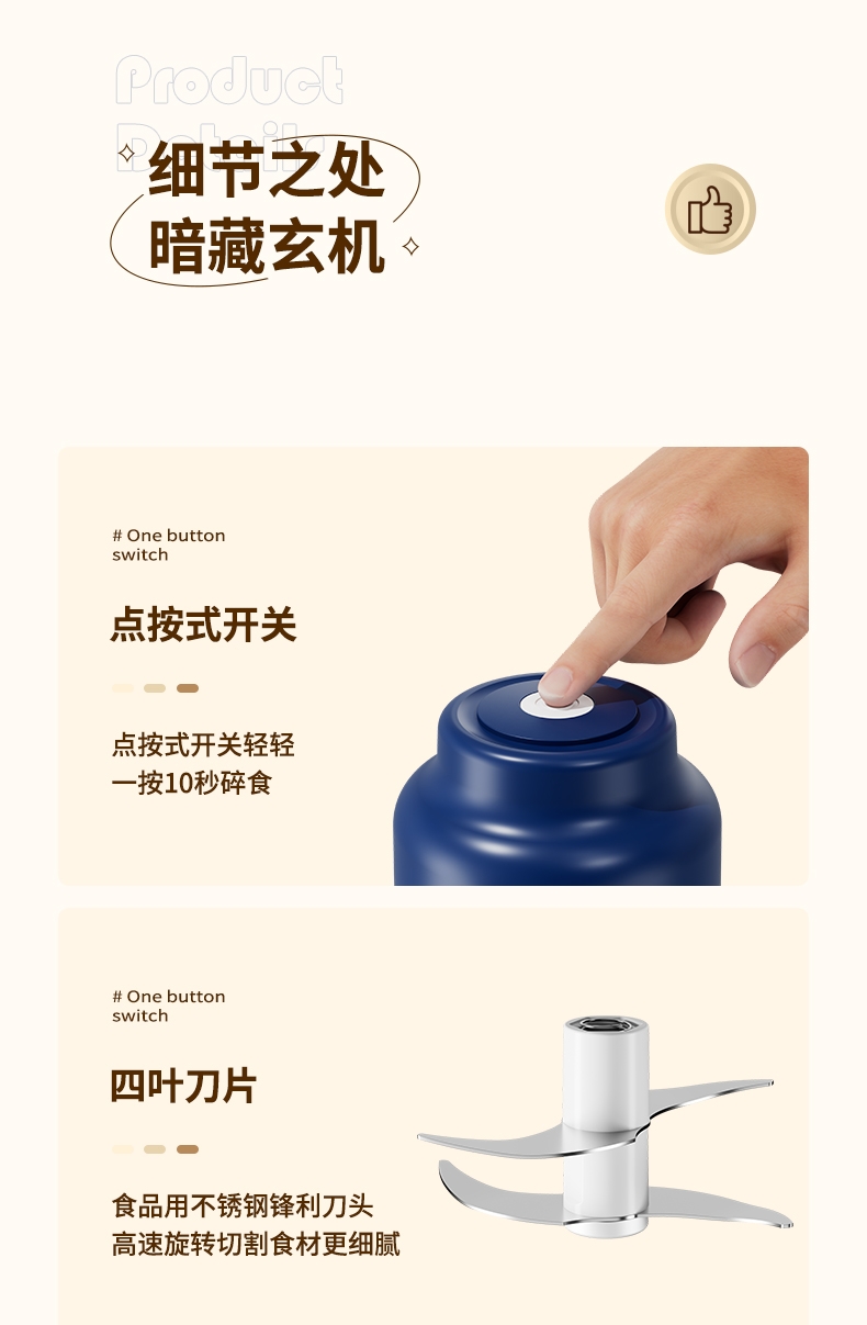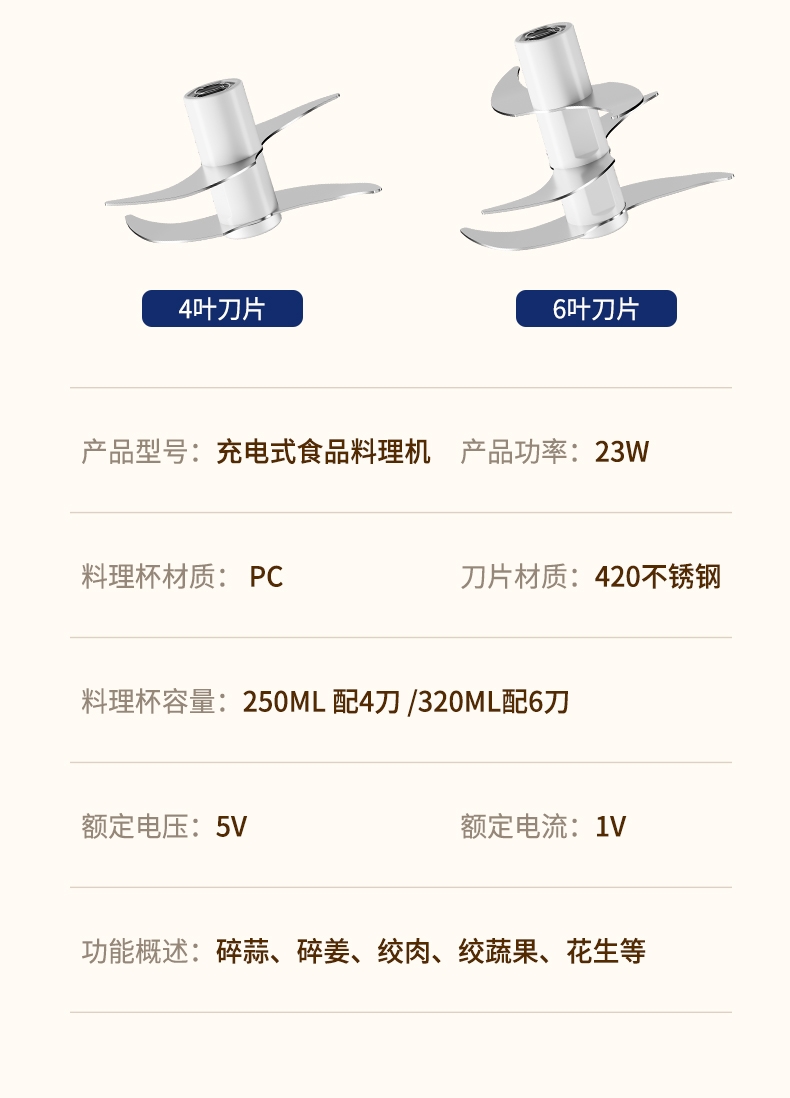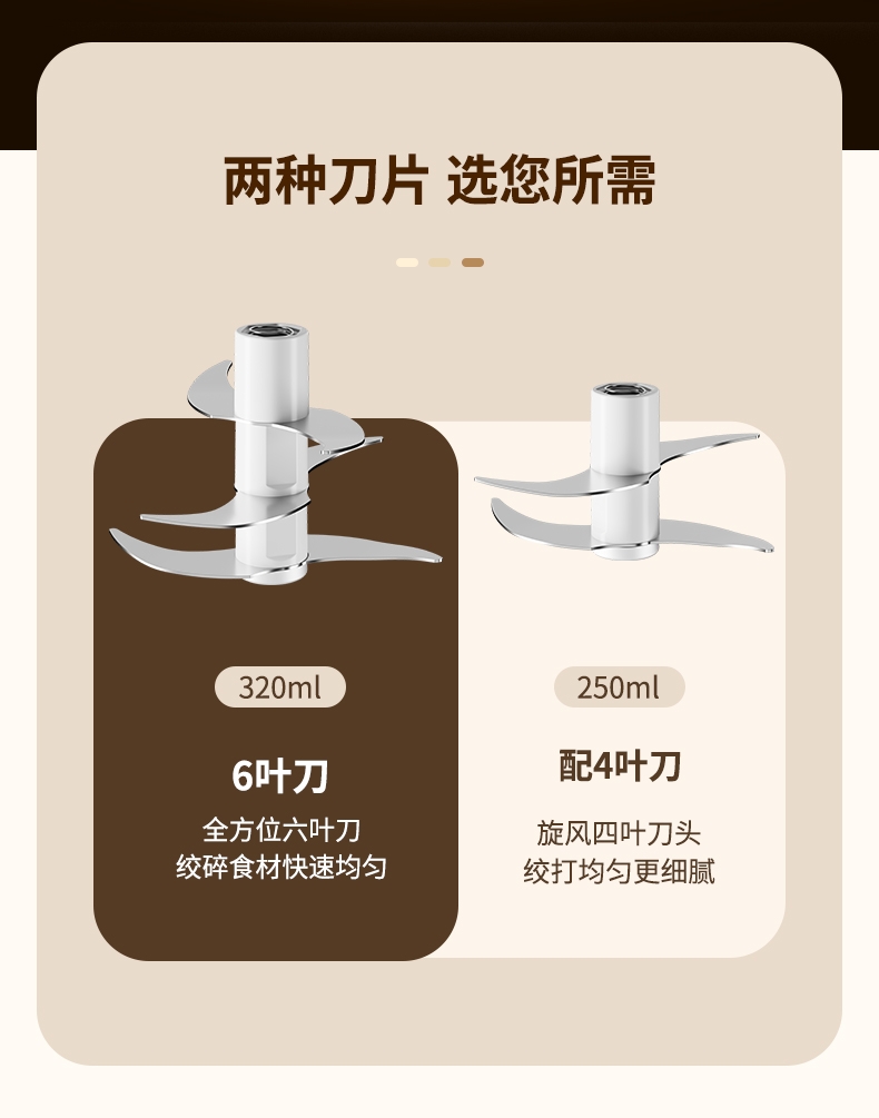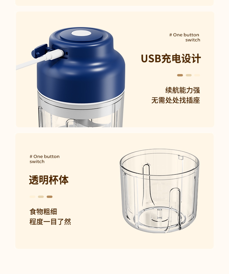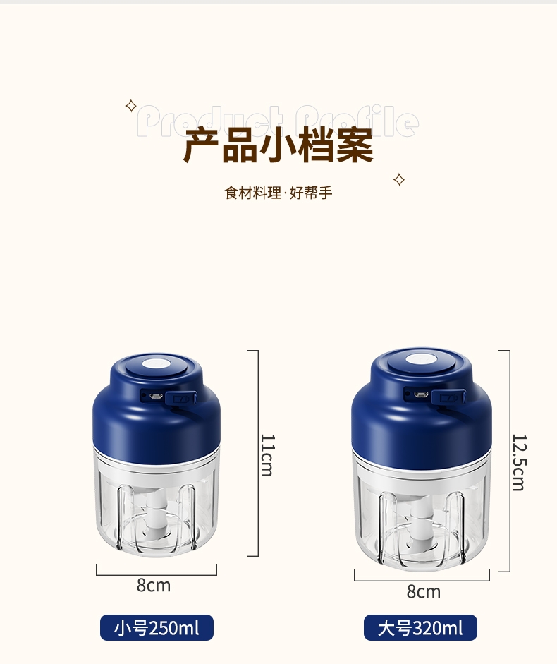 小巧便携自由料理;精钢4/6叶刀多维均匀切碎;大功率电机强劲动力绞肉