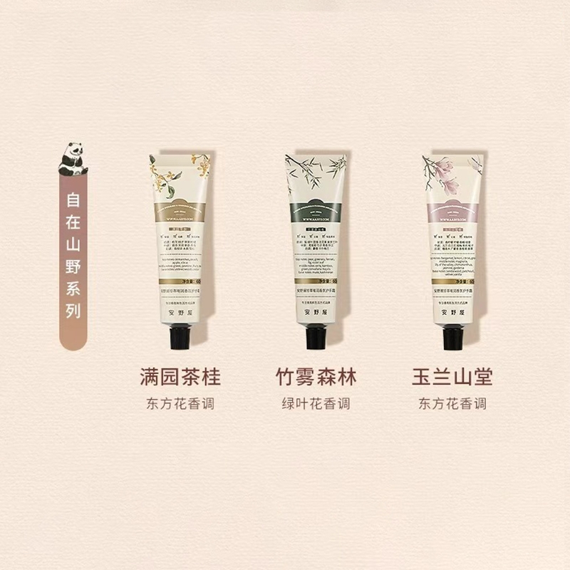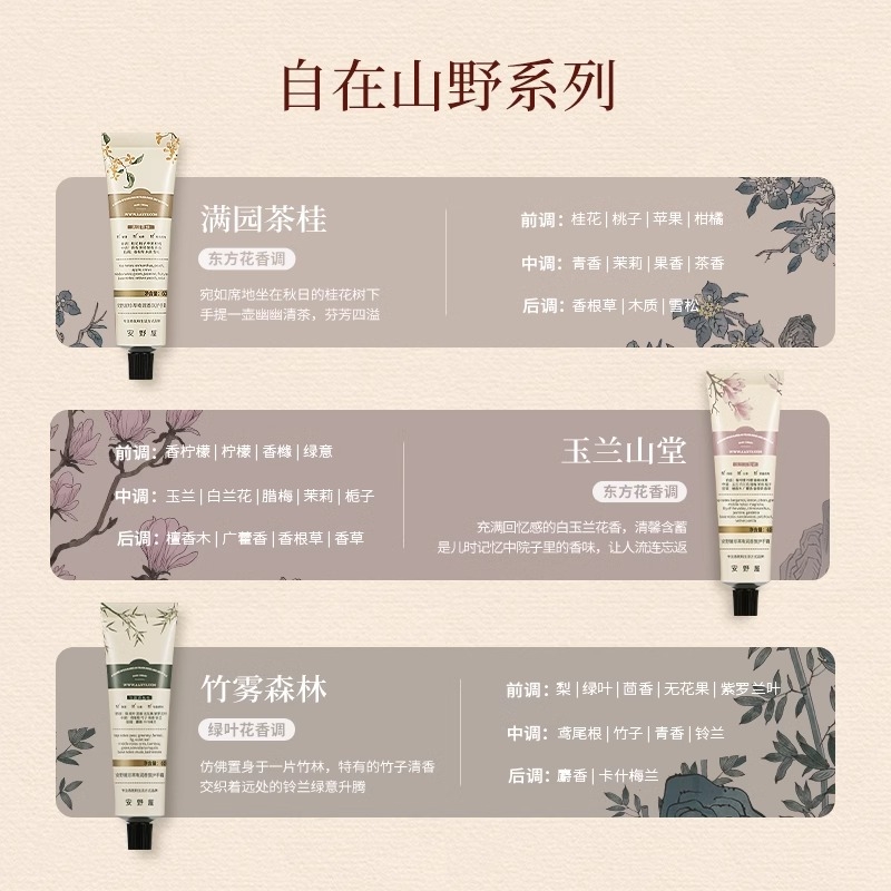 配置清单:香氛护手霜60g*3(满园茶桂/竹雾森林/玉兰山堂) 香氛护手霜10g*2(香型随机) 专属香氛卡片*2(香型随机) 定制挤压棒*1 礼盒*1