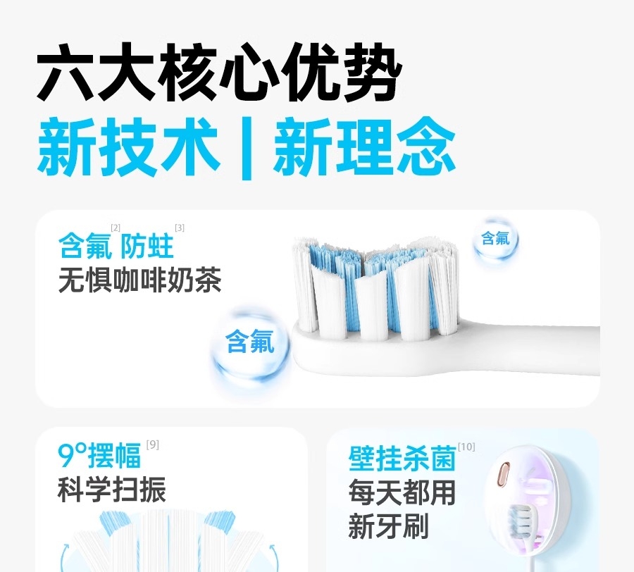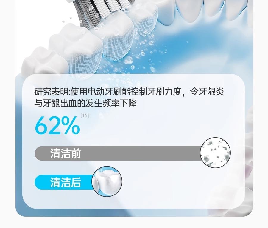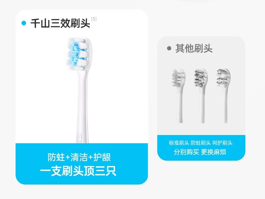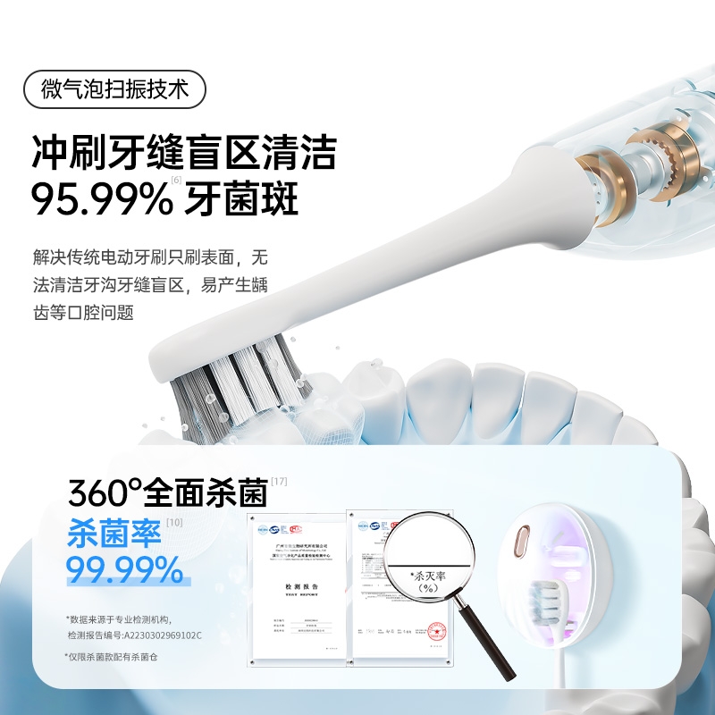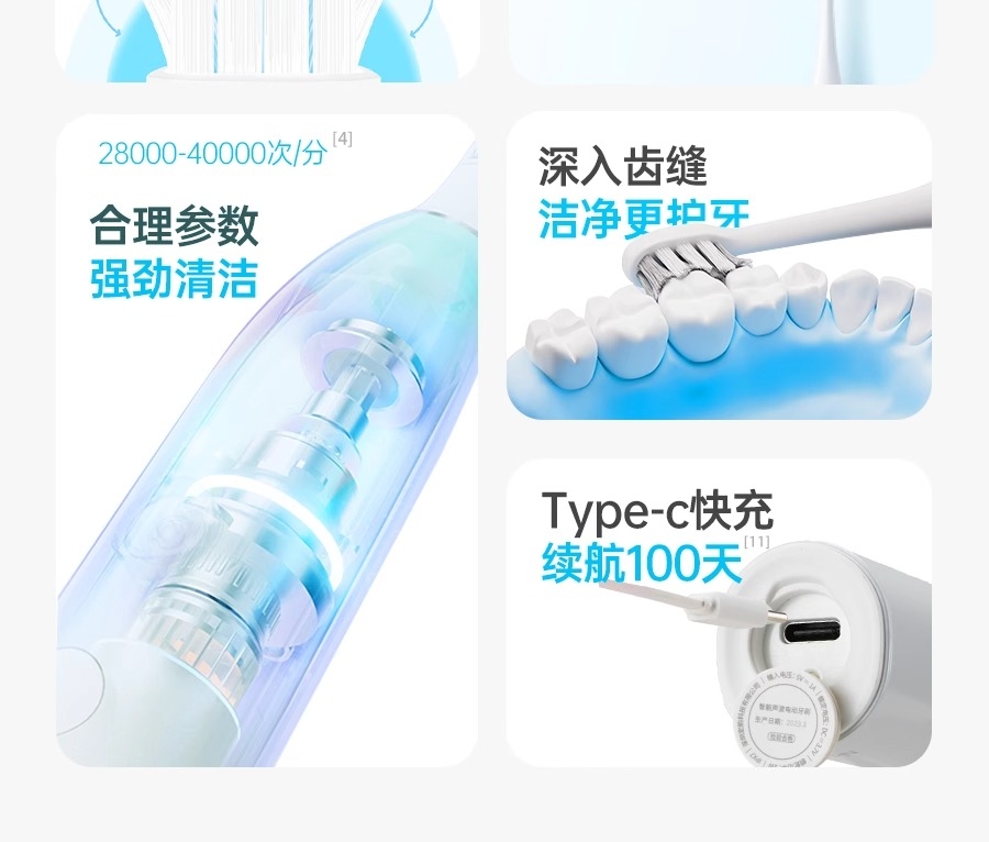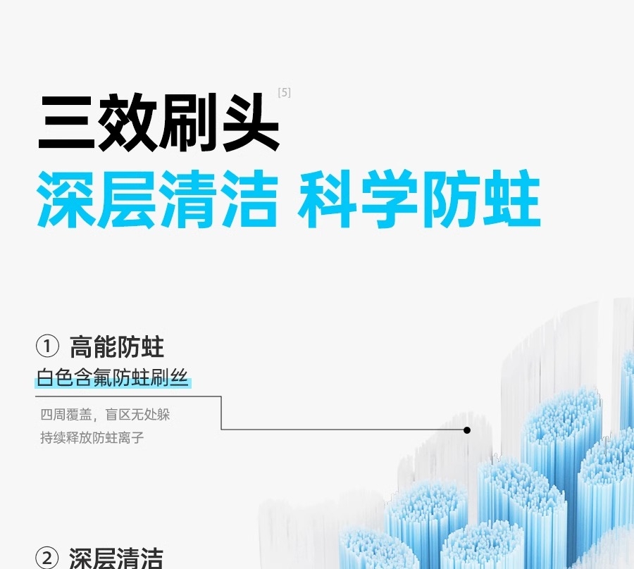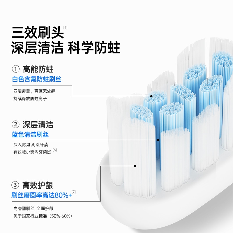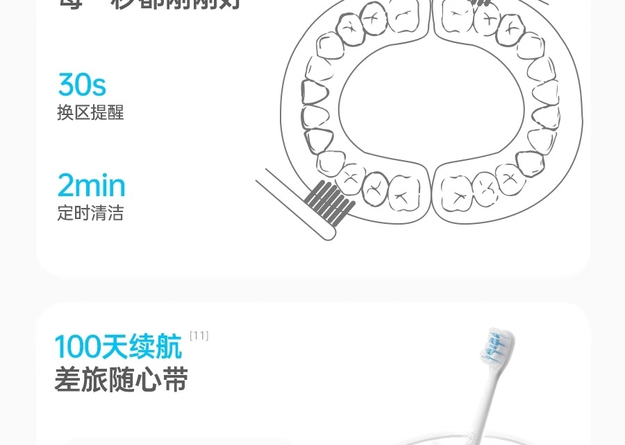 超长续航100天;30s换区提醒,2min定时清洁;三效刷头,防蛀+清洁+护龈