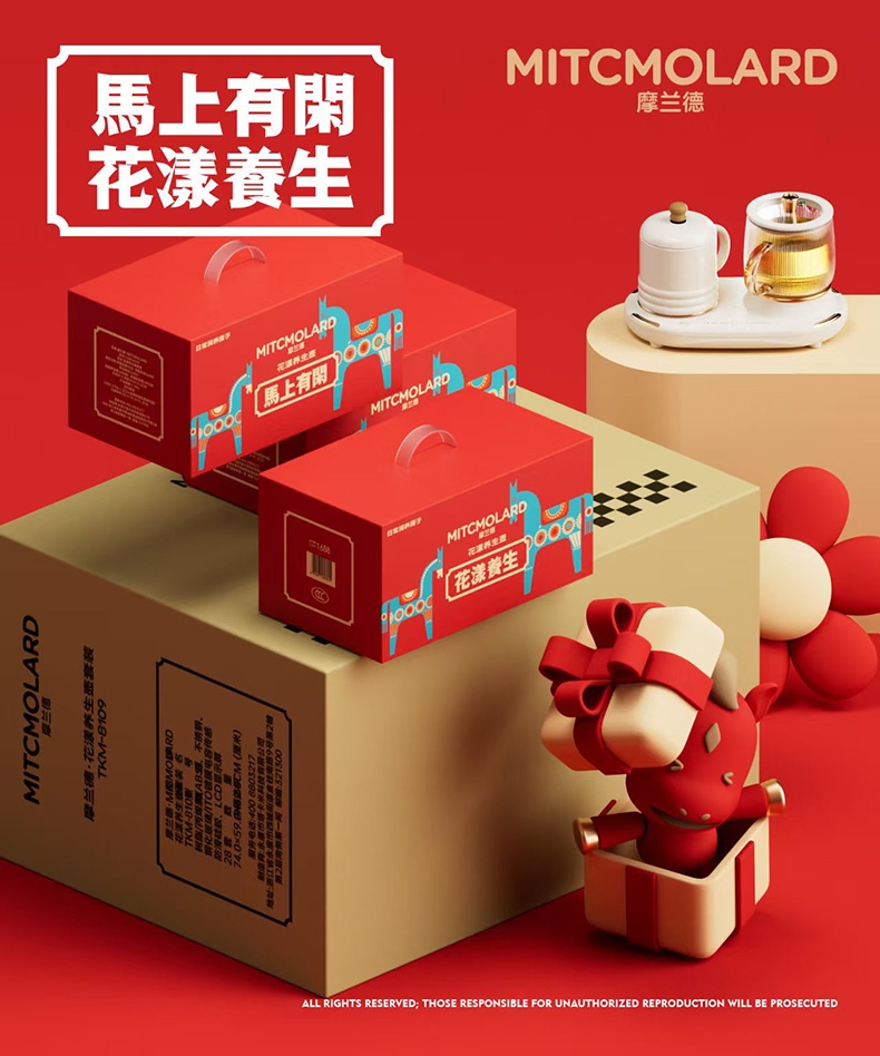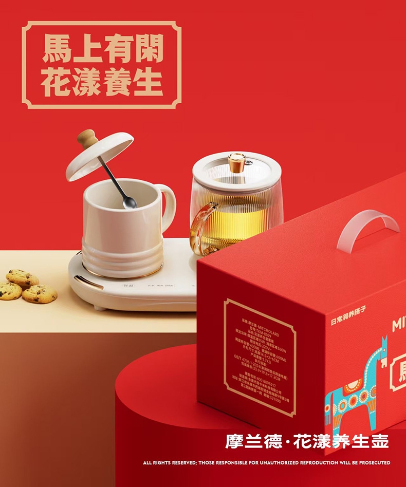 专为日常养生场景设计,从清晨到夜晚,随时为身体补充;一壶多能,可煮花茶、养生汤、热饮等,满足多样养生需;外观融合传统与现代美学,包装醒目大气,自用、送礼皆