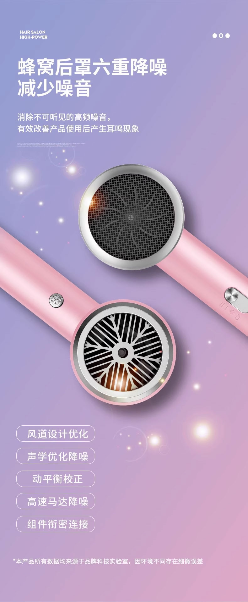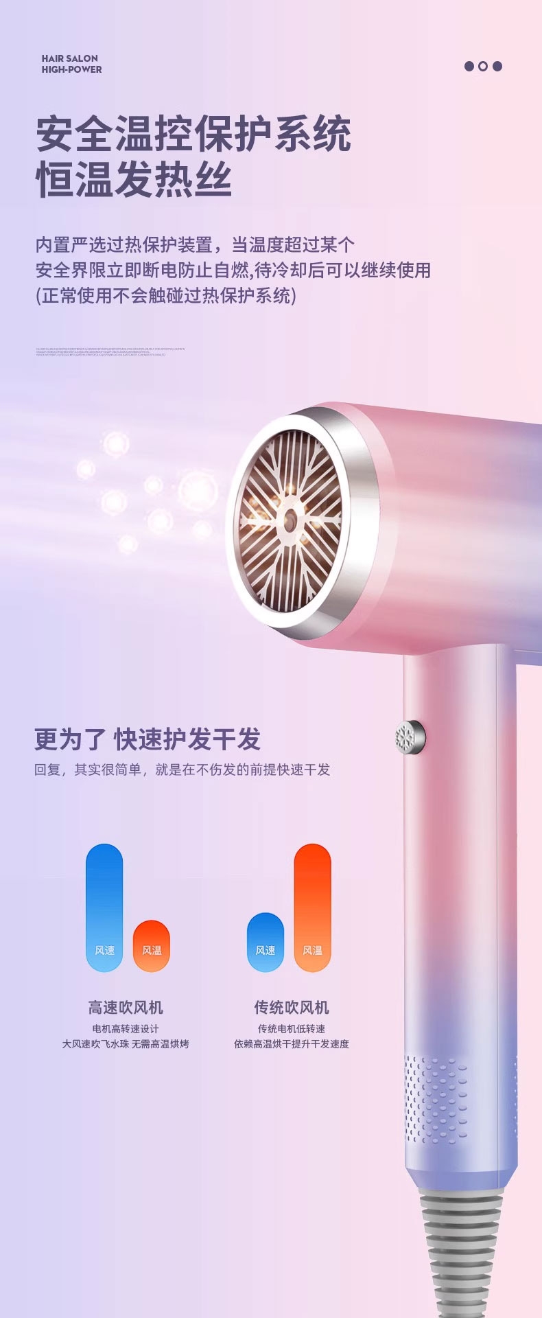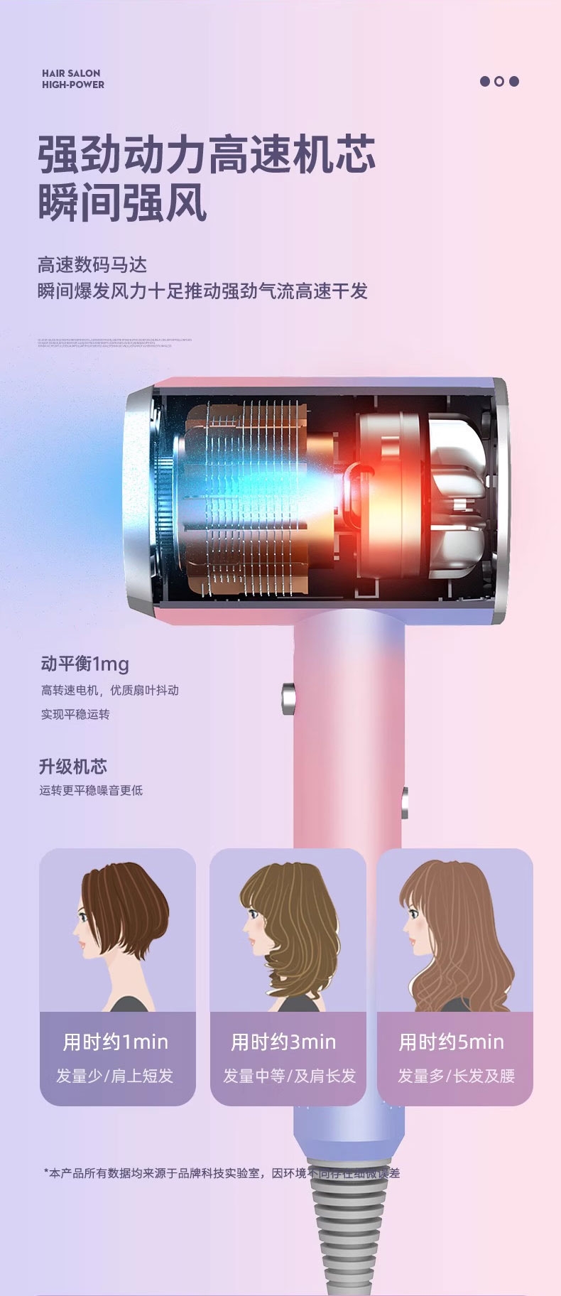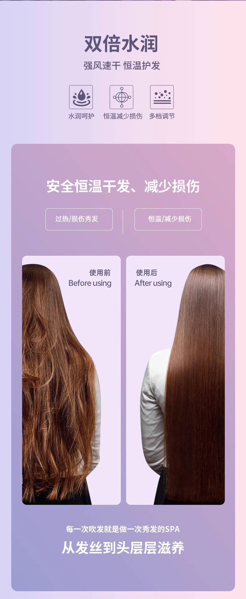 速干造型+高转速电机:高转速电机驱动强劲风力;冷热风切换+恒温护发:一键实现冷热风自由切换;低噪音+轻量化设计:低噪音运行不干扰生活节奏