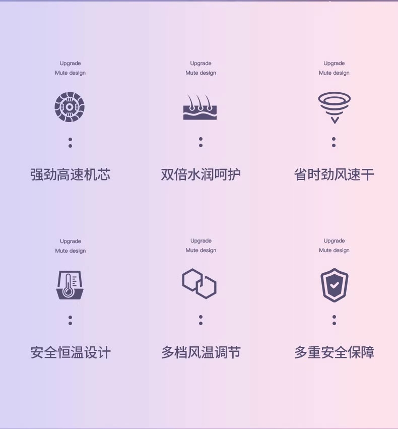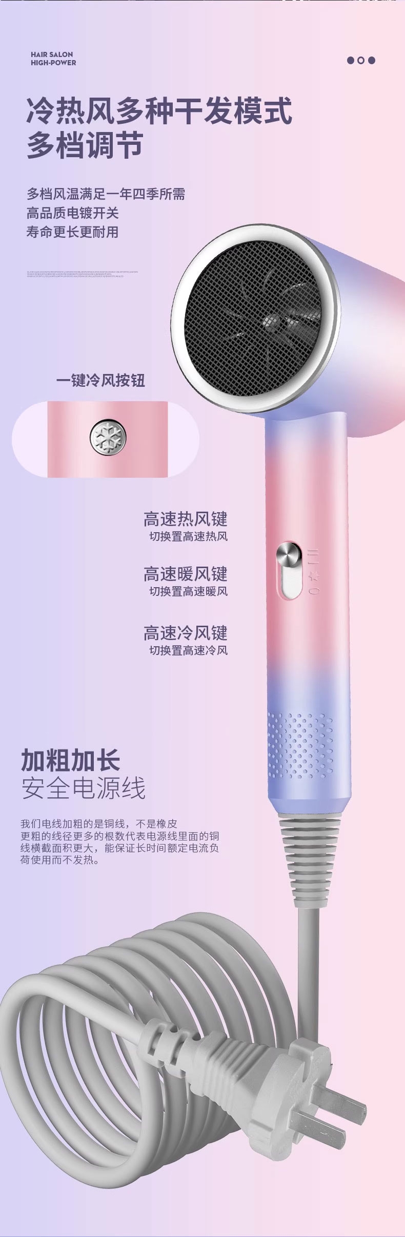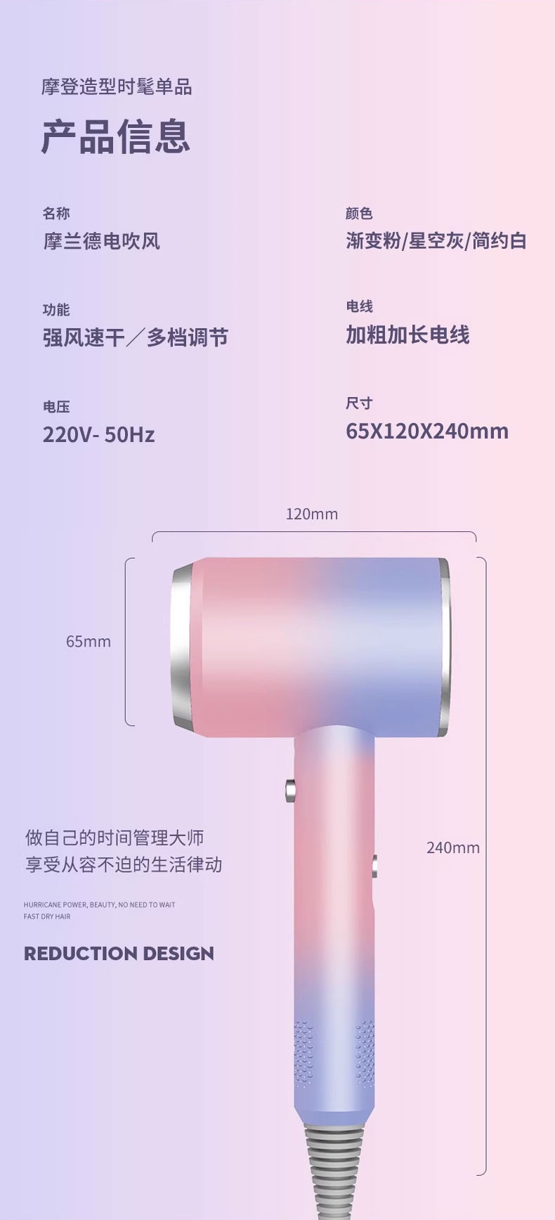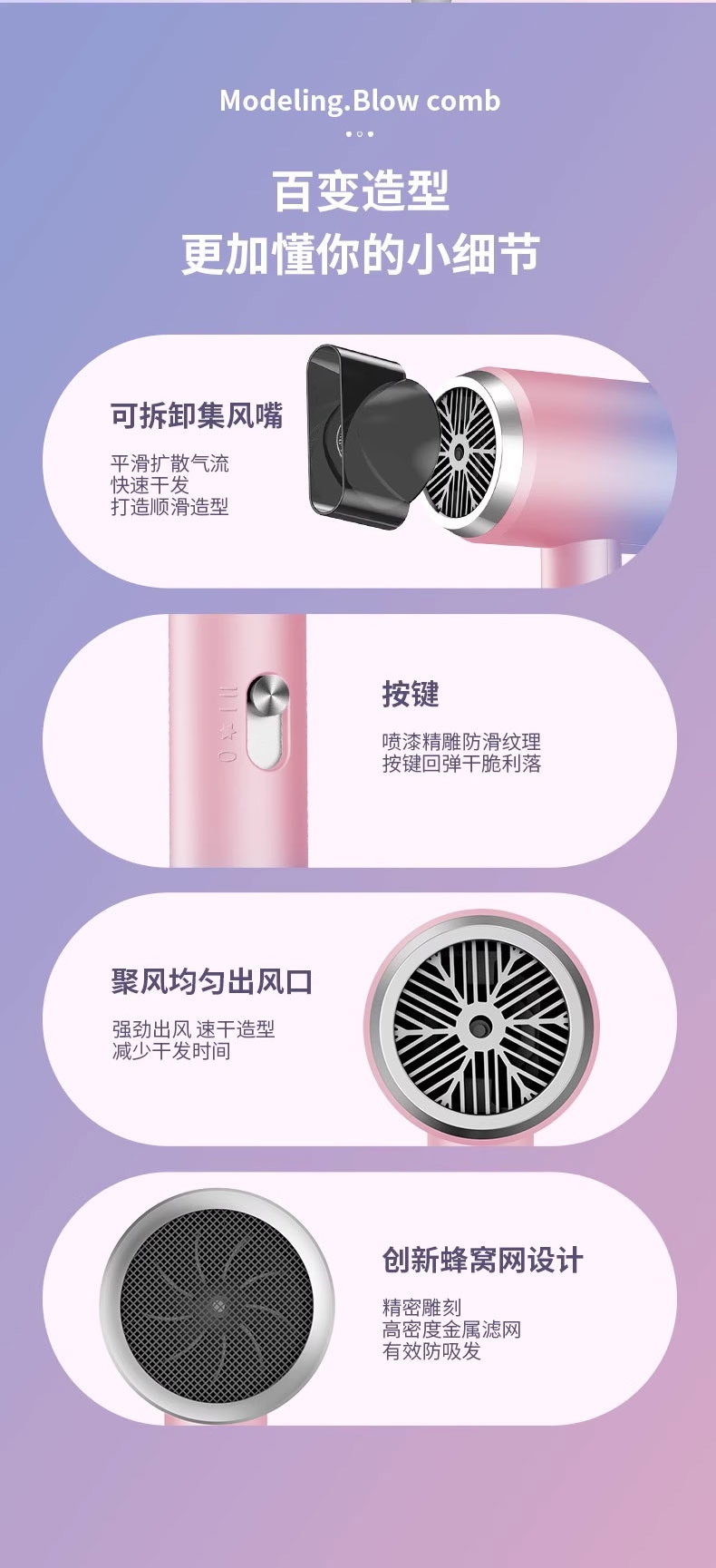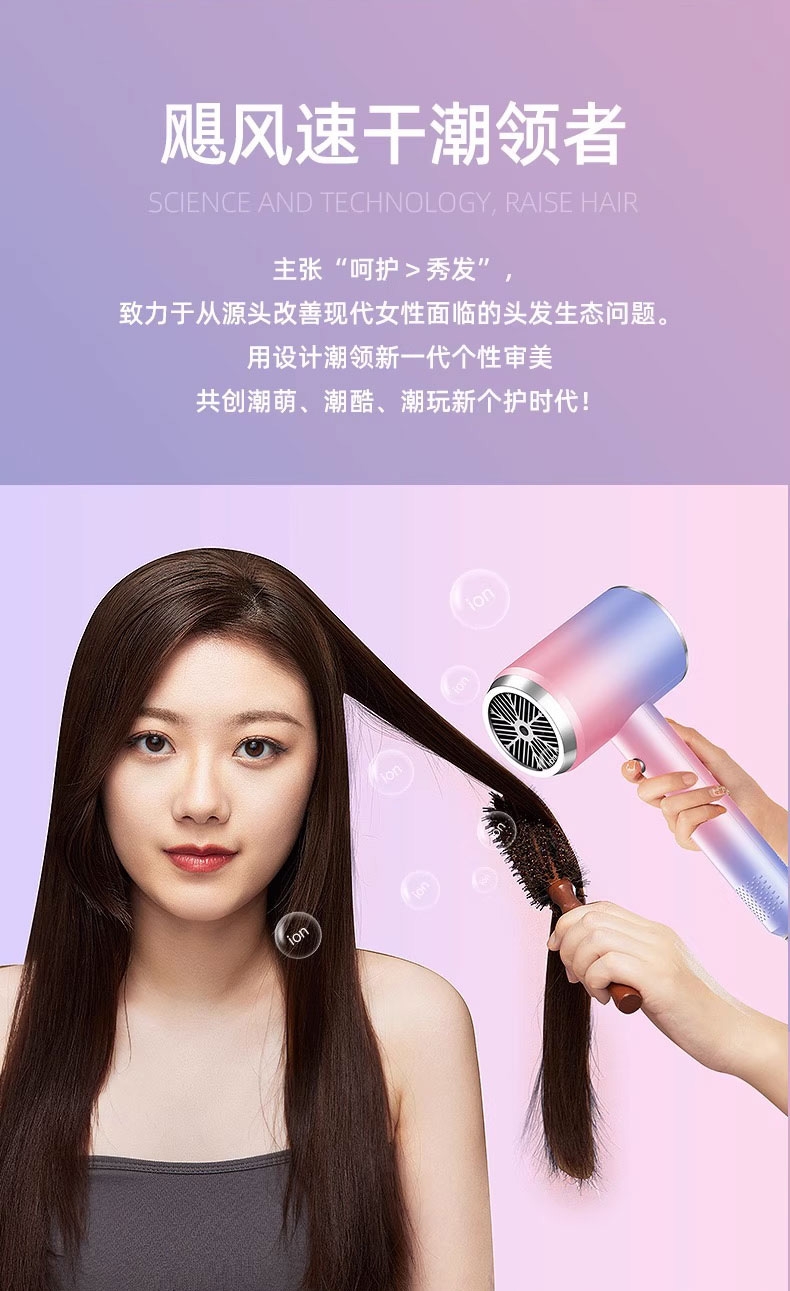 速干造型+高转速电机:高转速电机驱动强劲风力;冷热风切换+恒温护发:一键实现冷热风自由切换;低噪音+轻量化设计:低噪音运行不干扰生活节奏