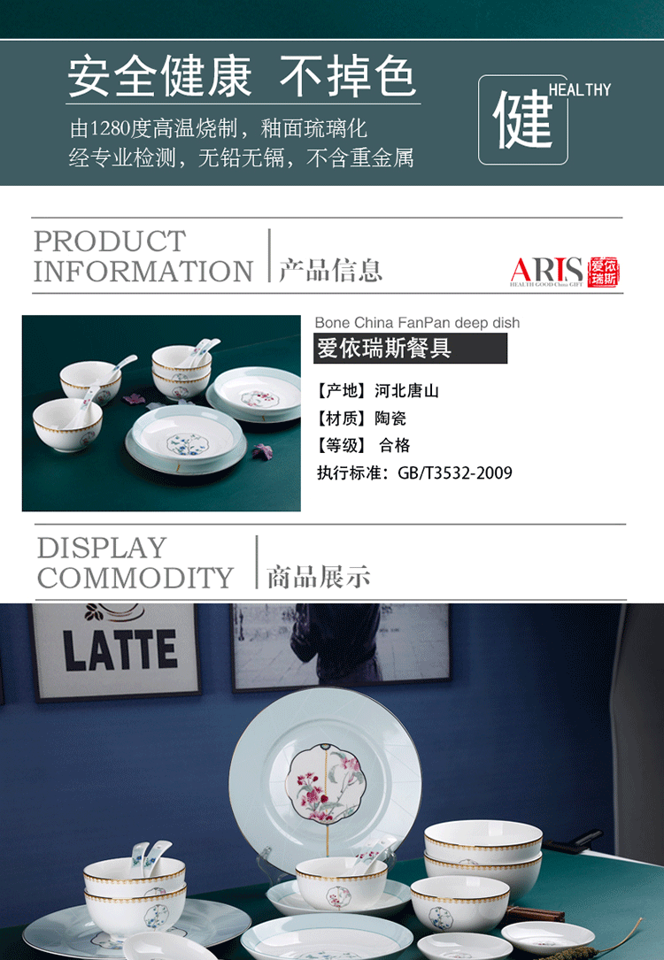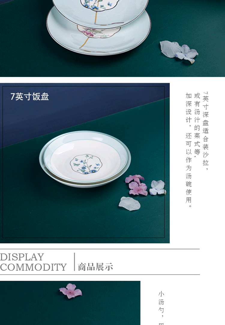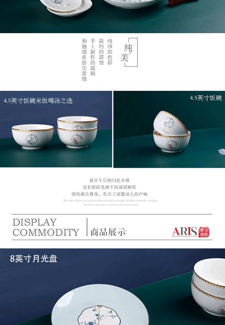 配置清单:产品规格:8英寸月光盘2个,7英寸饭盘2个,4.5英寸饭碗4个,4英寸调味碟4个,免漆木筷4双,小汤勺4个。