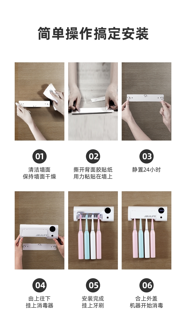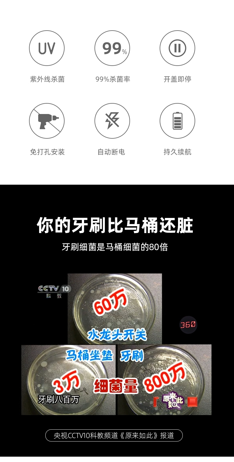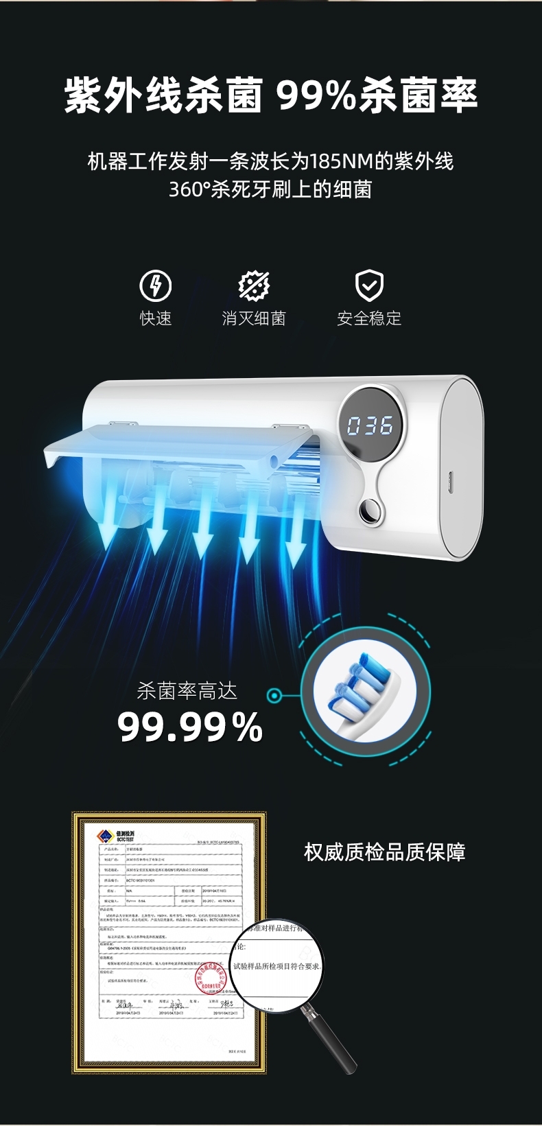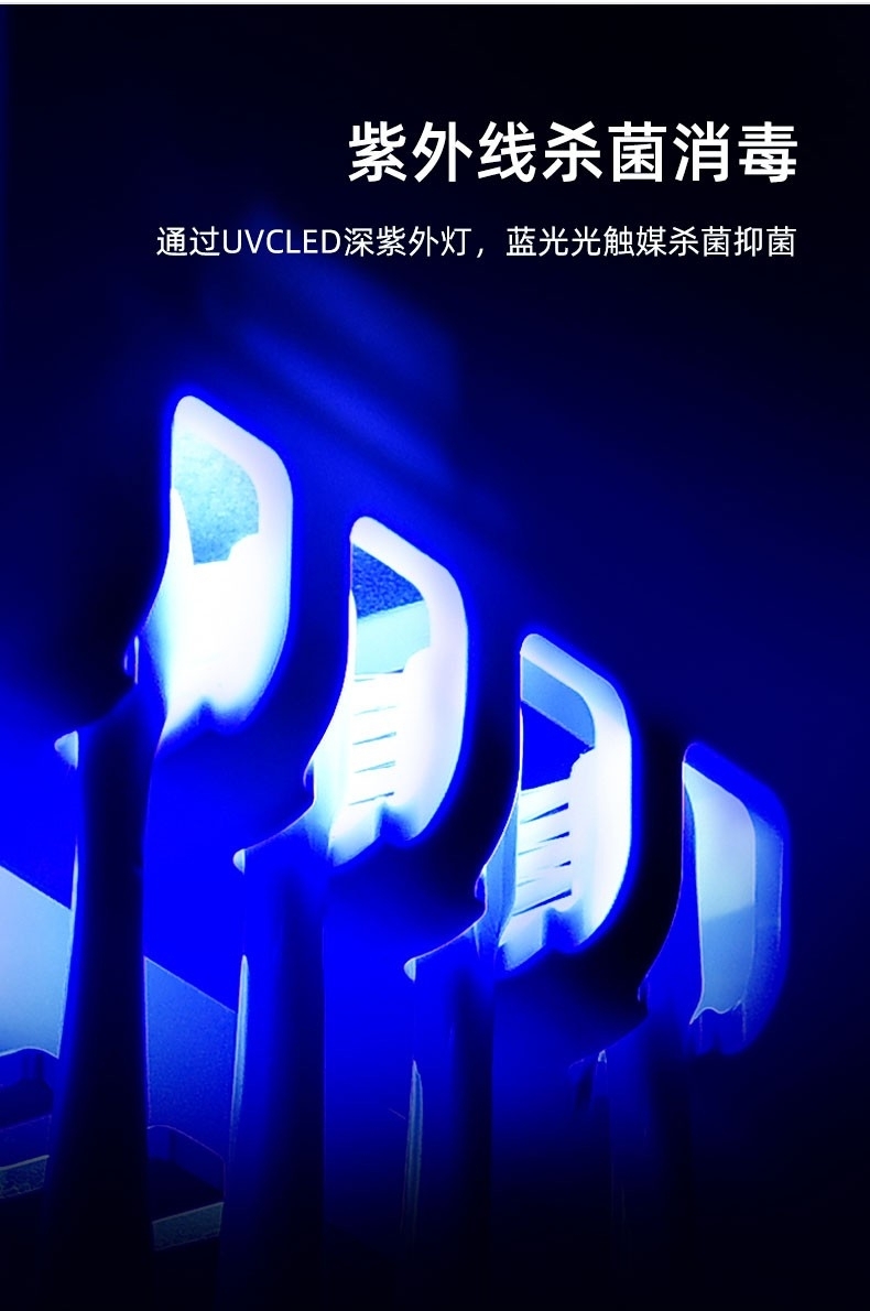 4牙刷位紫外线无死角杀菌;;多牙刷同时消毒,一键启动360秒高效净化;;一次充电约可用26天,告别频繁充电;;磁控安全开盖即停;;简约设计,免钉安装。