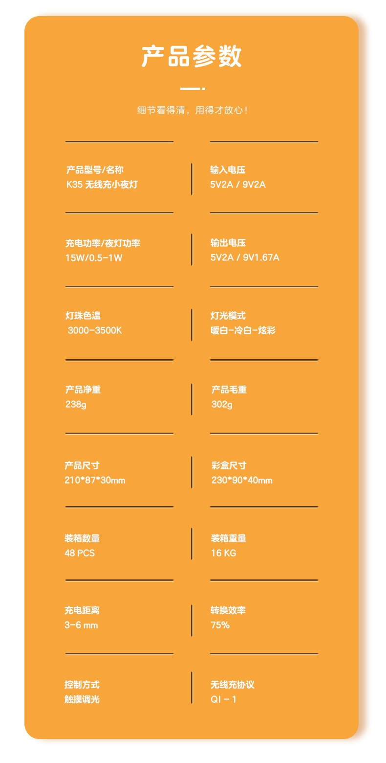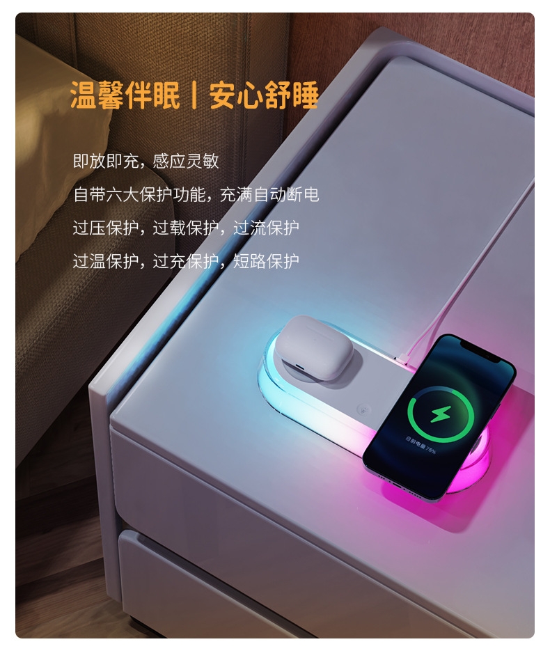 支持手机(15W)与耳机(10W)同时快充高效便携;暖光/冷光/RGB炫彩随心切换,点亮温馨时光;融合充电与夜灯功能,告别桌面杂乱,整洁更省空间
