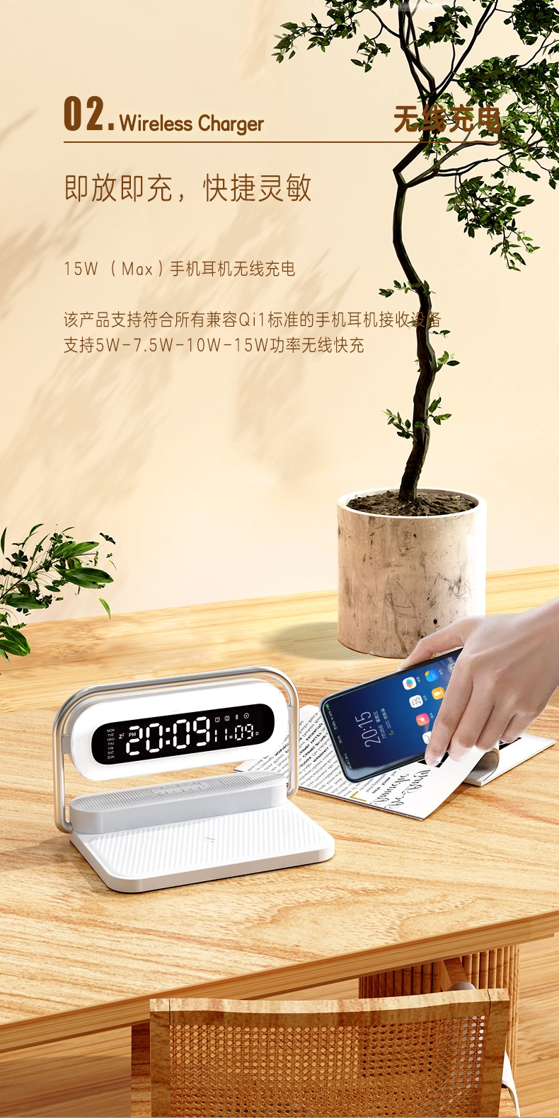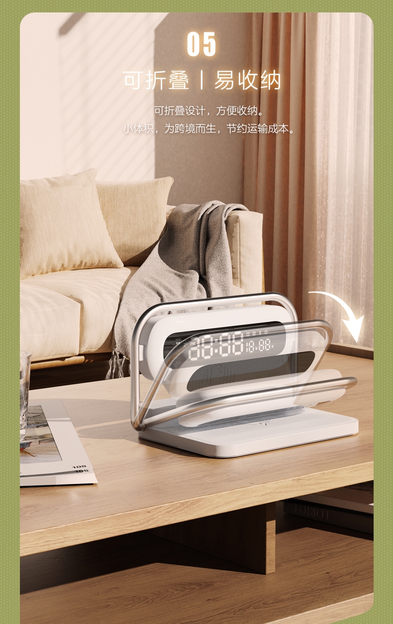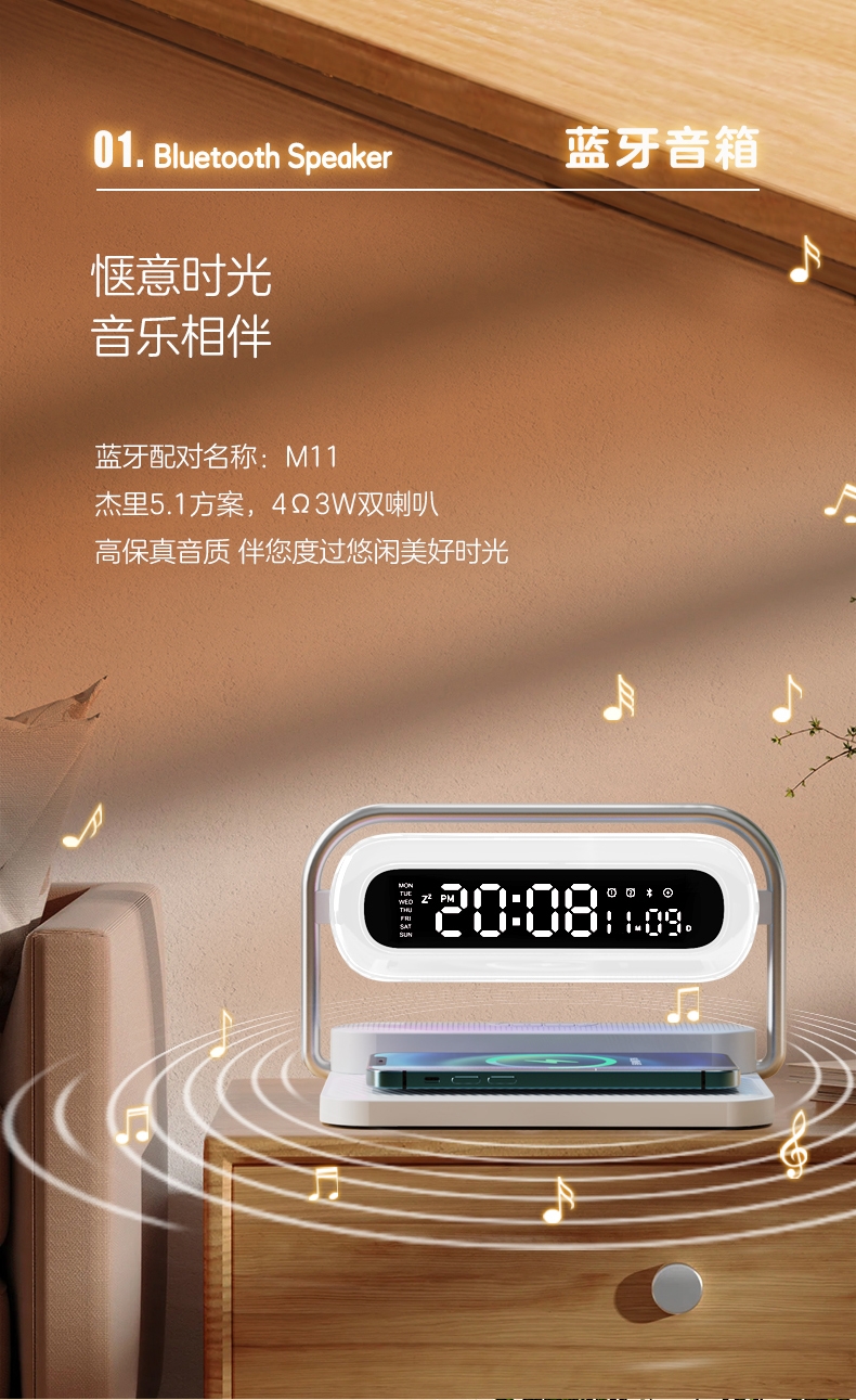 高保真蓝牙音箱;;15W无线快充;;三档调光夜灯;;多功能电子时钟;;可折叠机身设计。