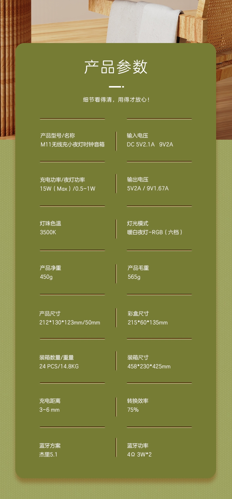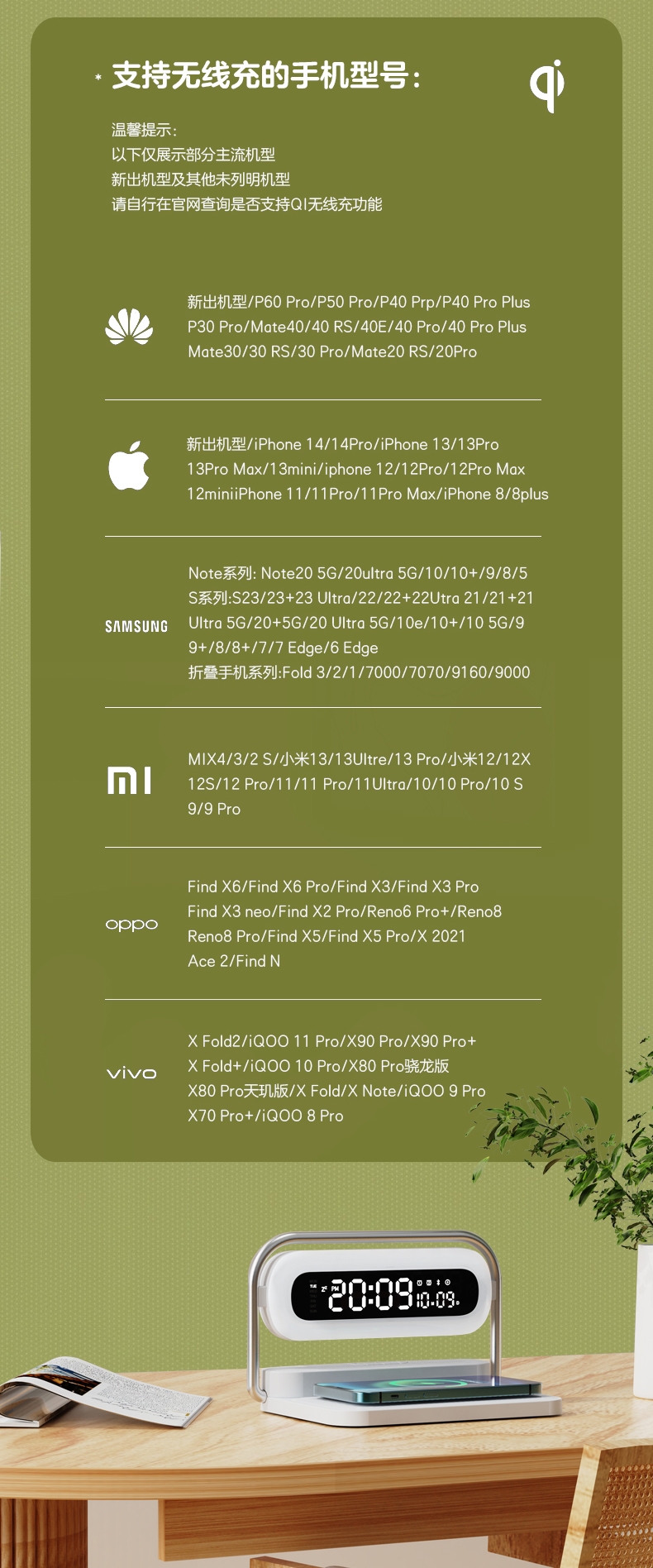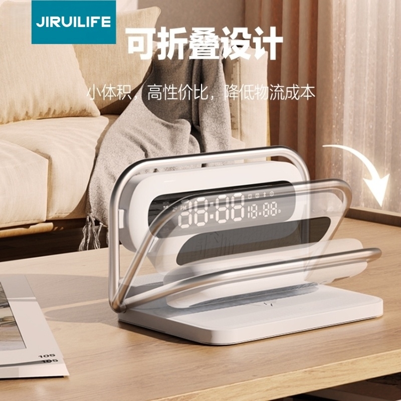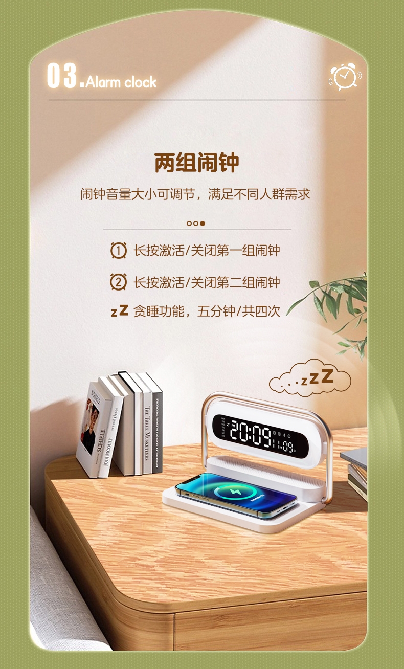 高保真蓝牙音箱;;15W无线快充;;三档调光夜灯;;多功能电子时钟;;可折叠机身设计。