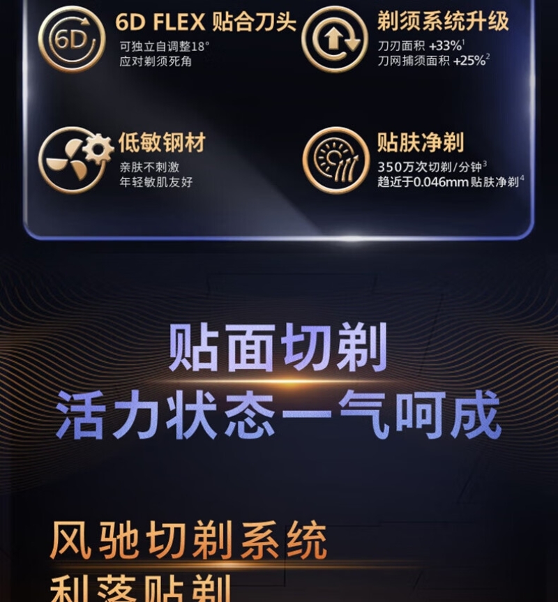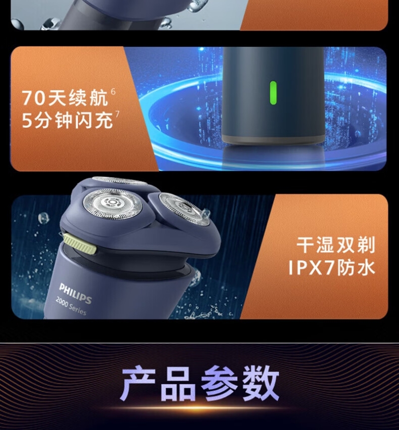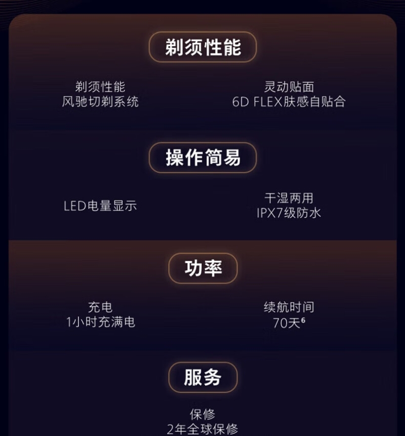 剃须刀:27片欧洲进口自动研磨刀片;剃须刀:6D flex 肤感自贴合刀头;牙刷:续航时间:31-60天,防水等级:IPX7;刷头:洁净型刷头*2,震频:31000次/分钟