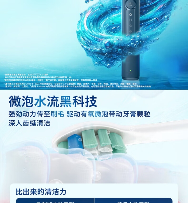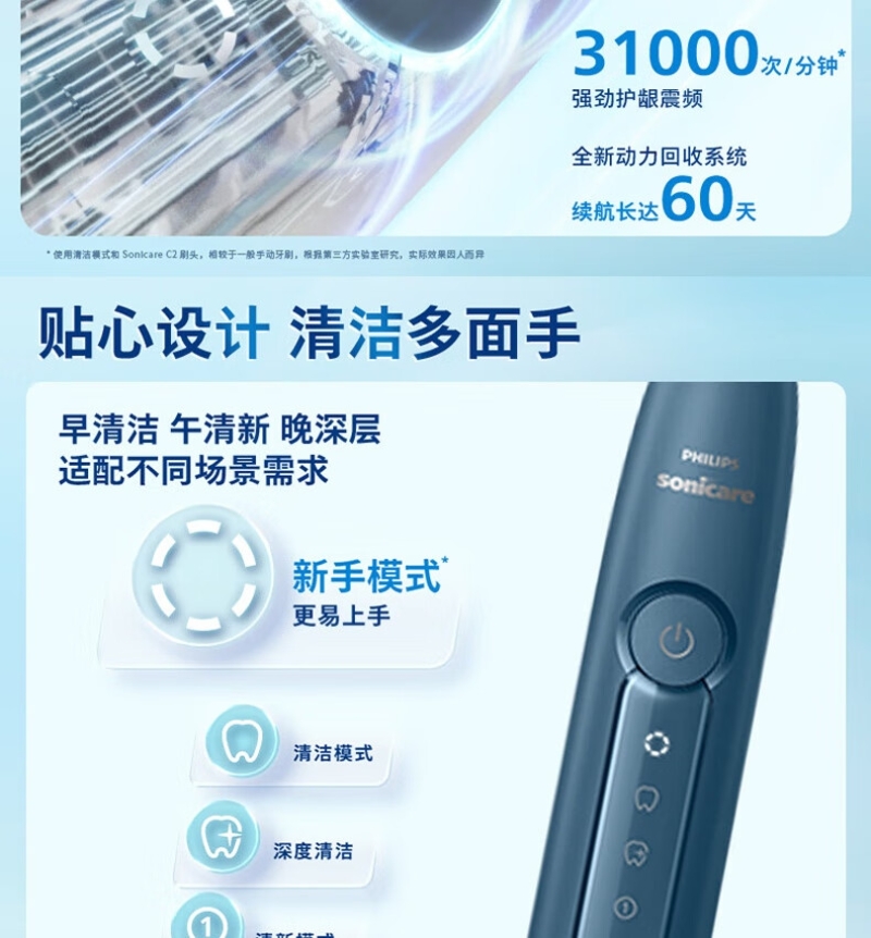 牙刷:充电方式:感应充电,类型:声波震动牙刷 续航时间:31-60天,防水等级:IPX7